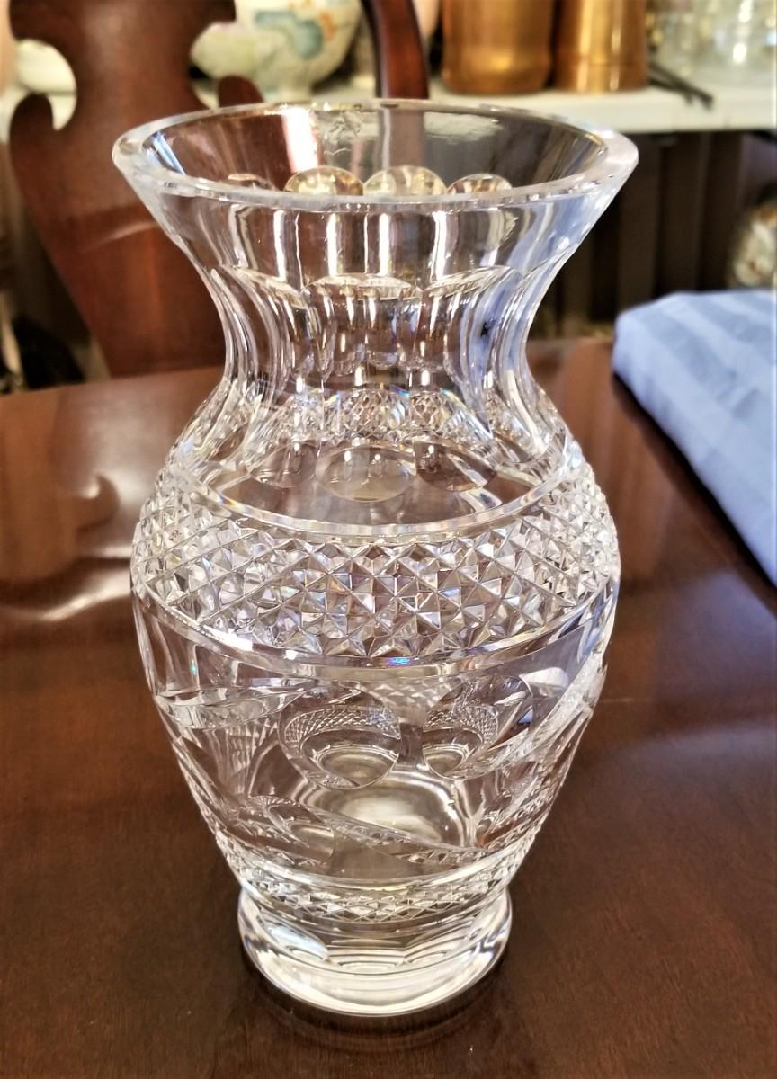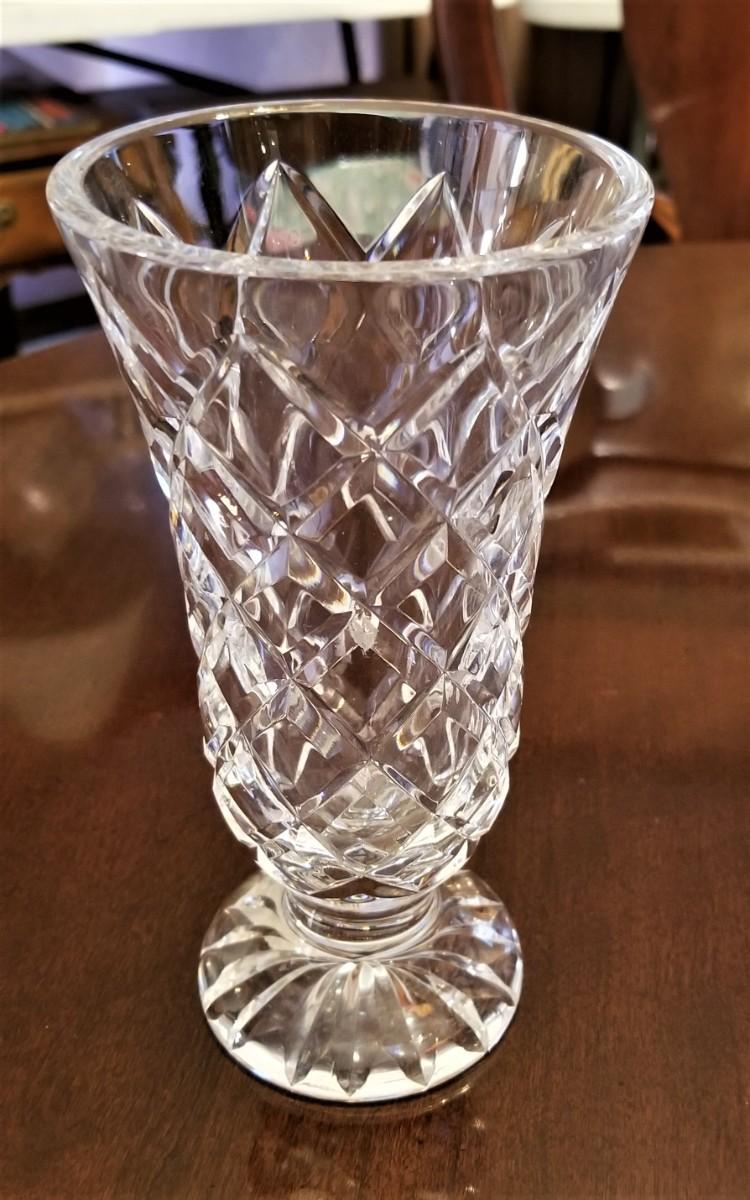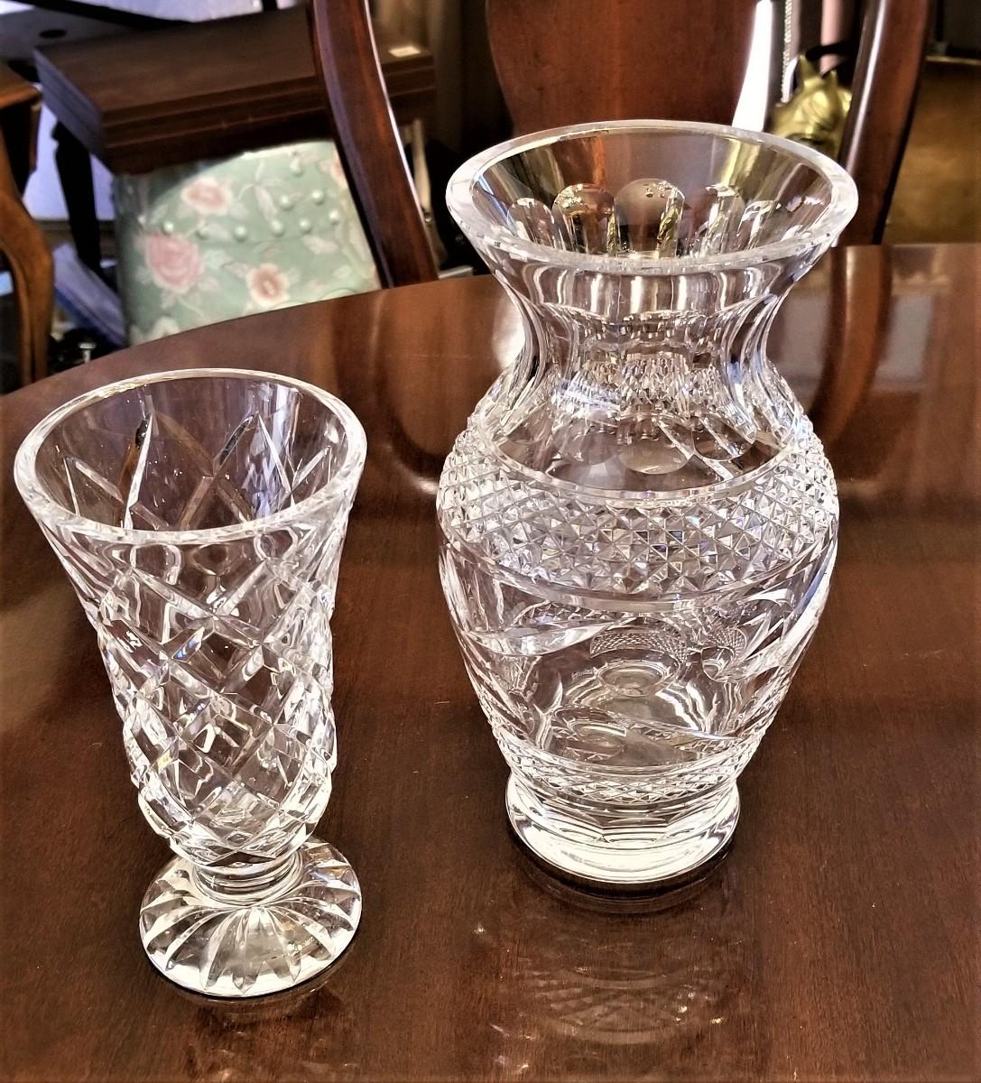 Two pretty WATERFORD crystal vases - the larger is 9" tall. We believe the smaller one (7" tall) is in the "Kinsale" pattern. Both in good condition - no boxes.