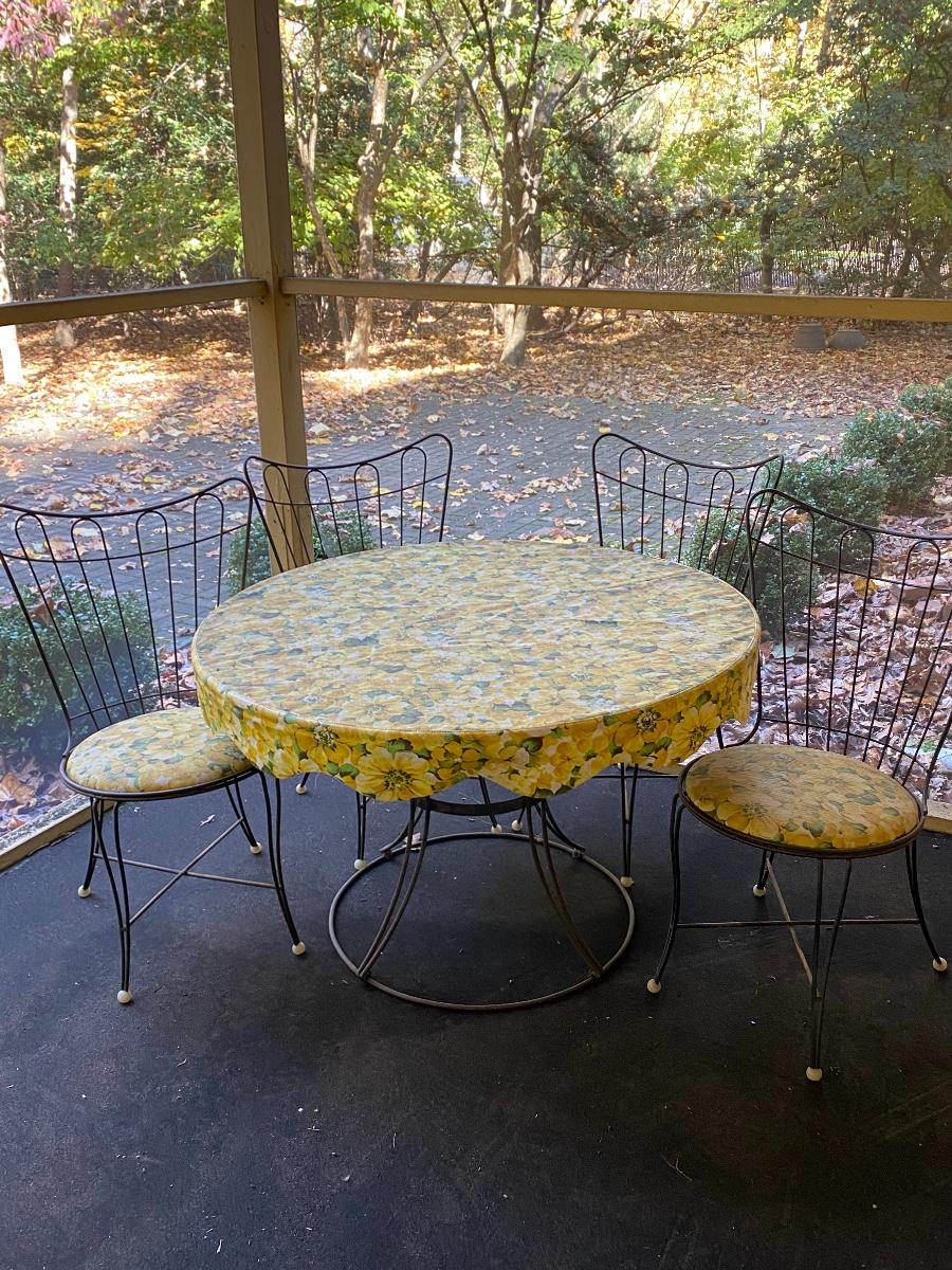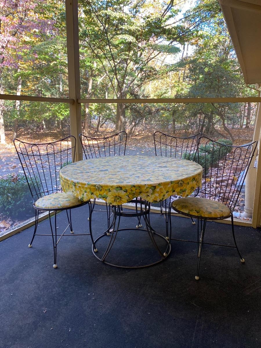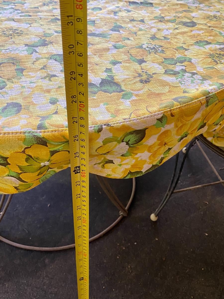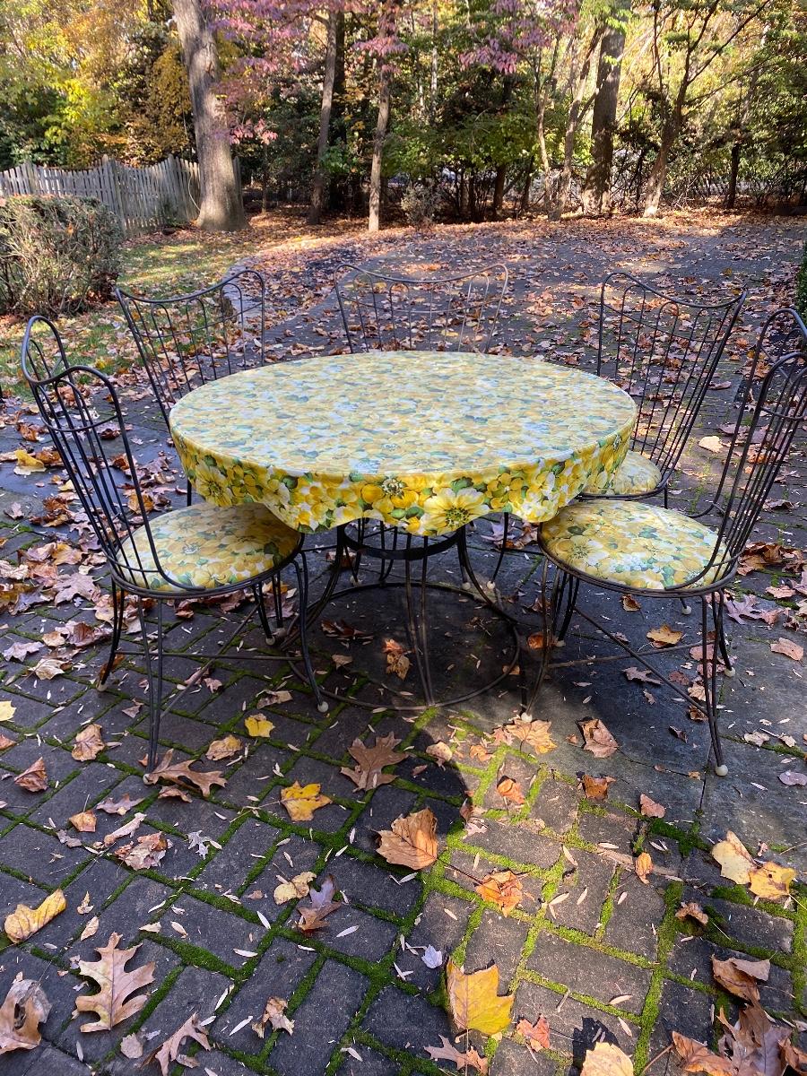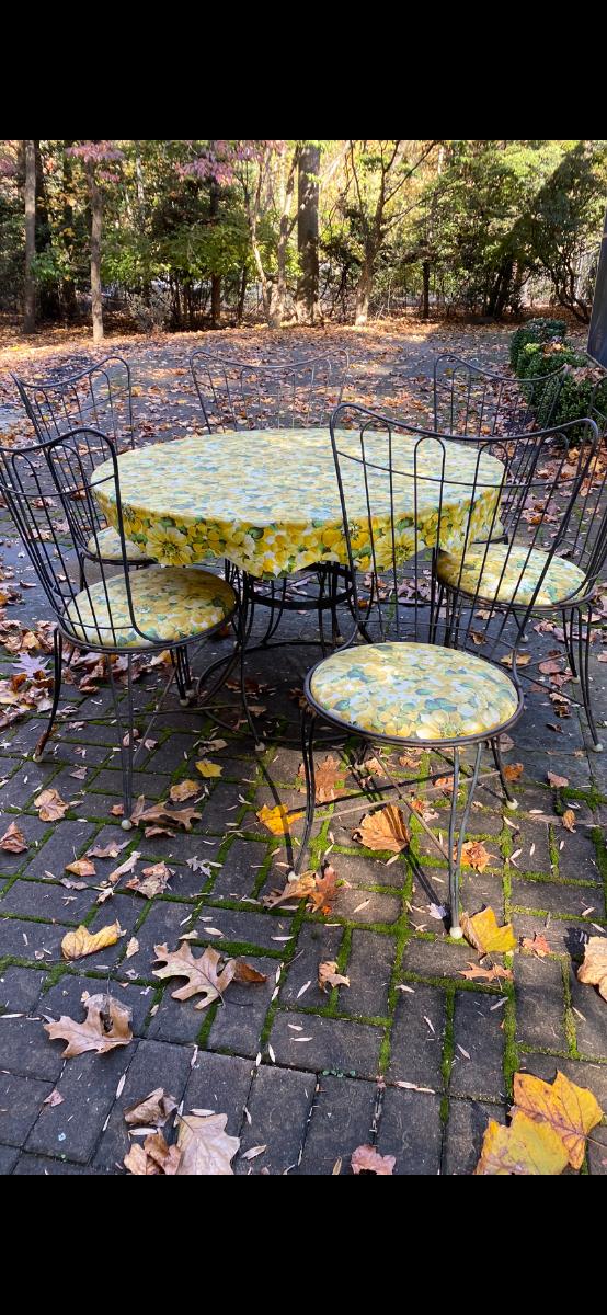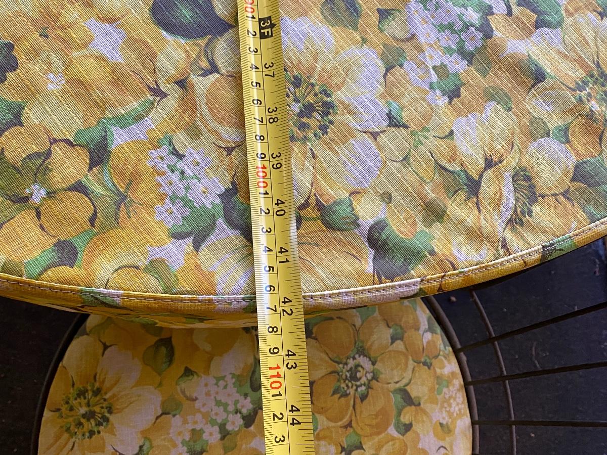 Vintage metal outdoor table and 6 matching chairs. Table comes with vintage yellow floral tablecloth. Yellow print matches chair seats. The seats can come off and be recovered. The metal is lightweight, not heavy cast. The pictures show condition, measurements if taken, and what is included in the lot. Due to the large amount that we photograph and the time frame, we are not always able to take measurements. All items unless noted, are pre-owned and have been used. If you purchased furniture, you must bring help. We do not allow one person to carry large furniture out on their own. Bring help, tools and a truck for the safety of our client’s homes, and your personal safety. Company policy. Thank you.