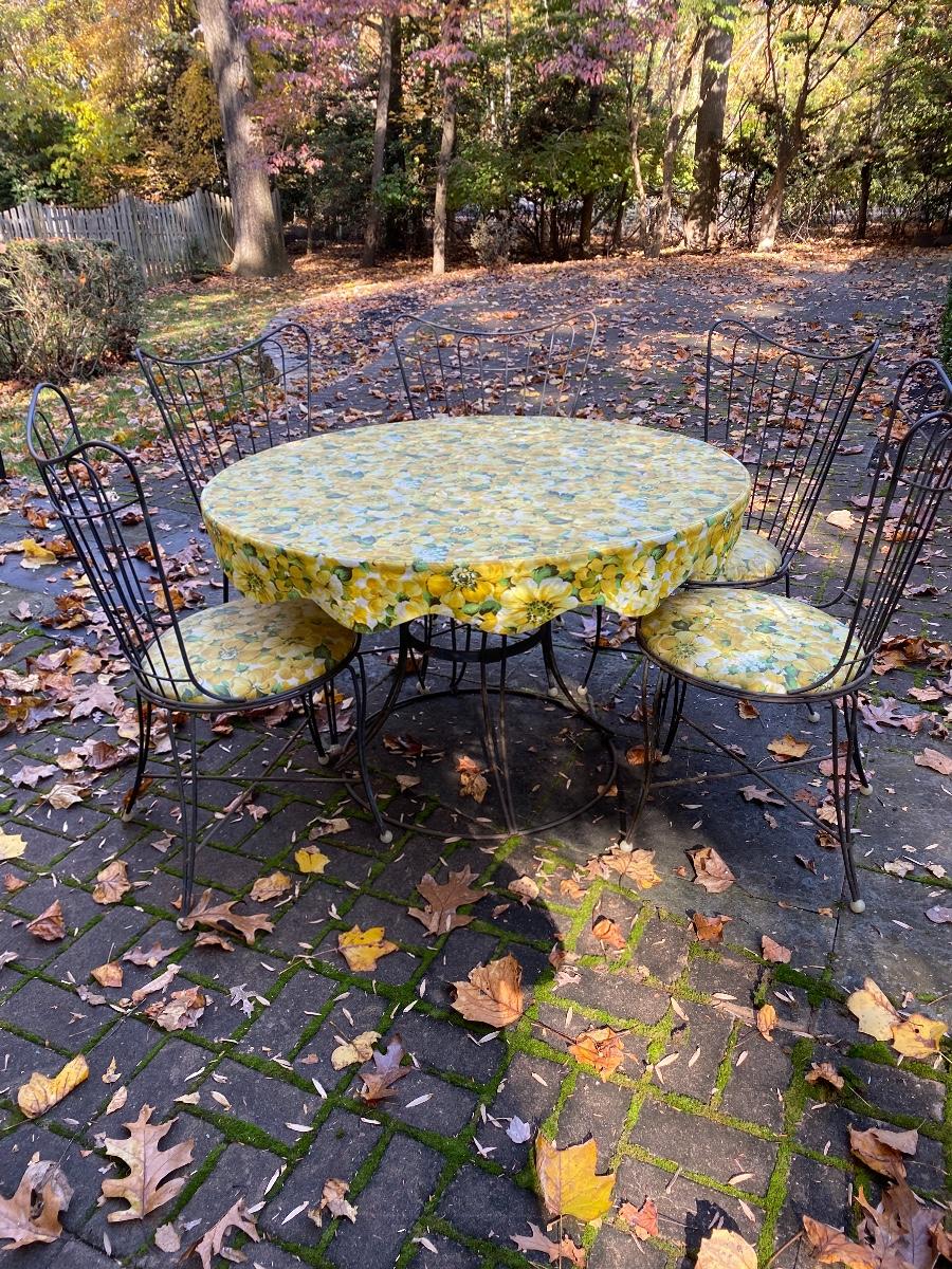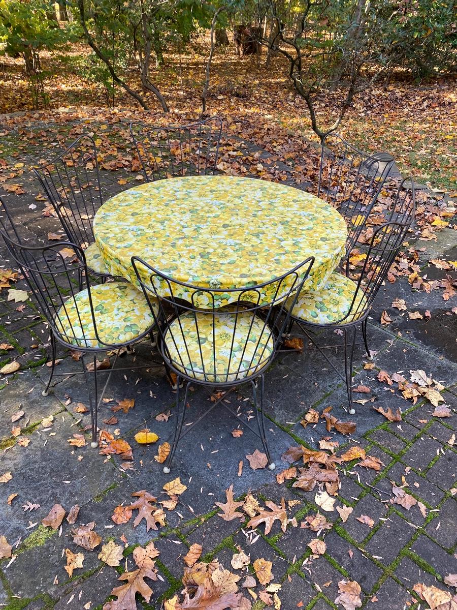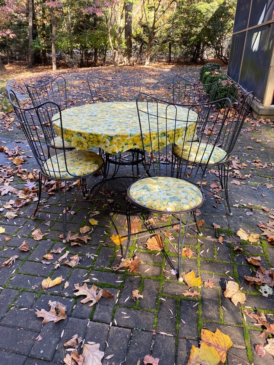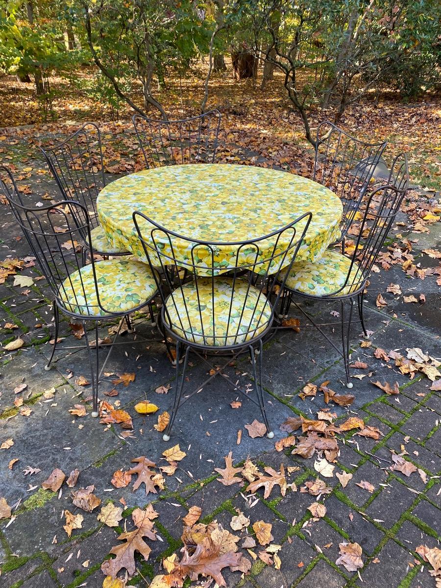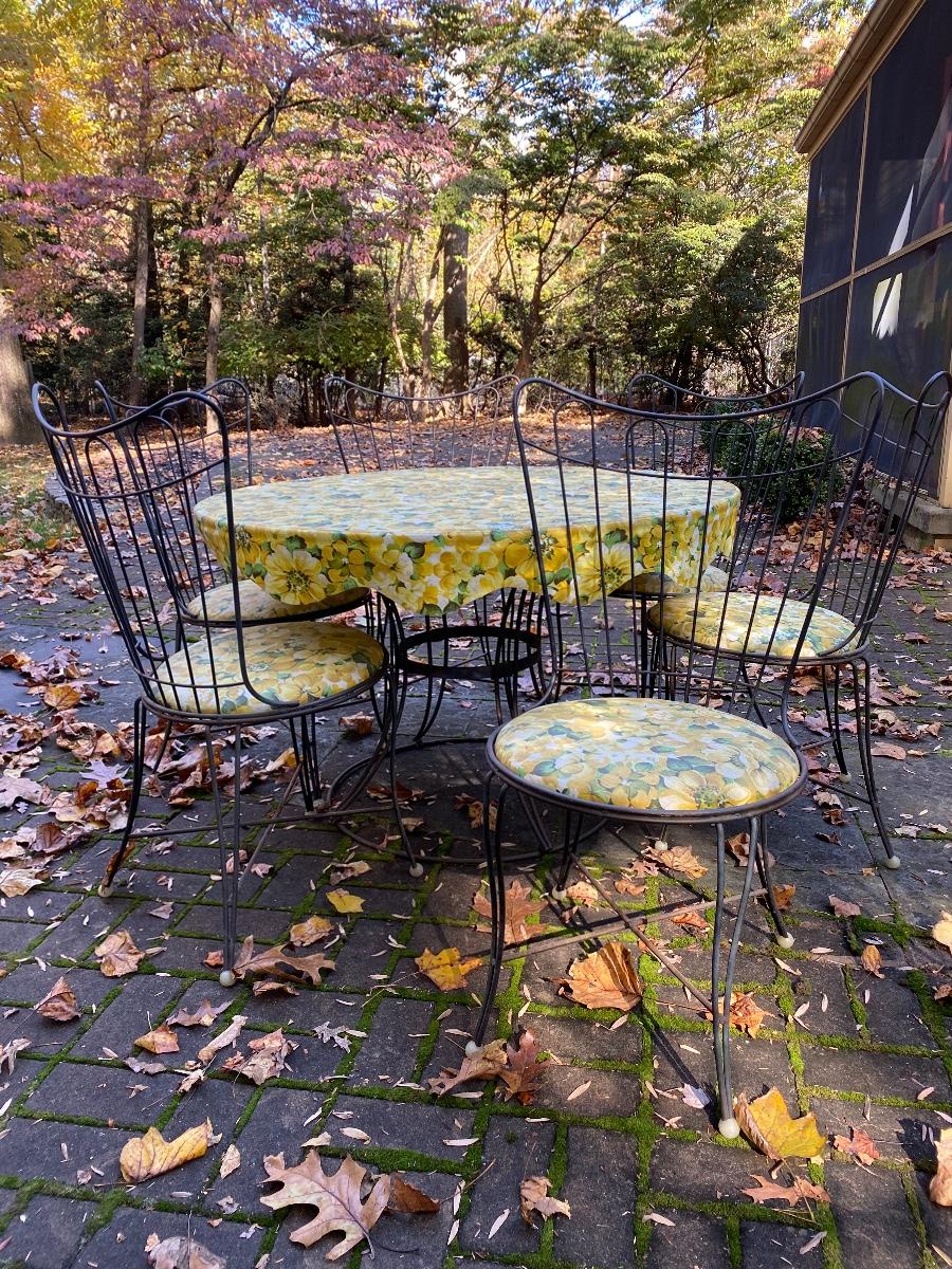 Vintage metal outdoor table and 6 matching chairs. Table comes with vintage yellow floral tablecloth. Yellow print matches chair seats. The seats can come off and be recovered. The metal is lightweight, not heavy cast. The pictures show condition, measurements if taken, and what is included in the lot. Due to the large amount that we photograph and the time frame, we are not always able to take measurements. All items unless noted, are pre-owned and have been used. If you purchased furniture, you must bring help. We do not allow one person to carry large furniture out on their own. Bring help, tools and a truck for the safety of our client’s homes, and your personal safety. Company policy. Thank you.