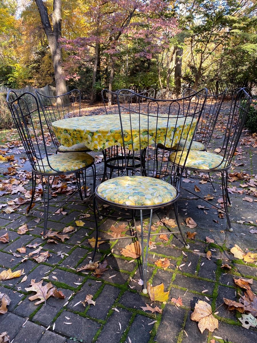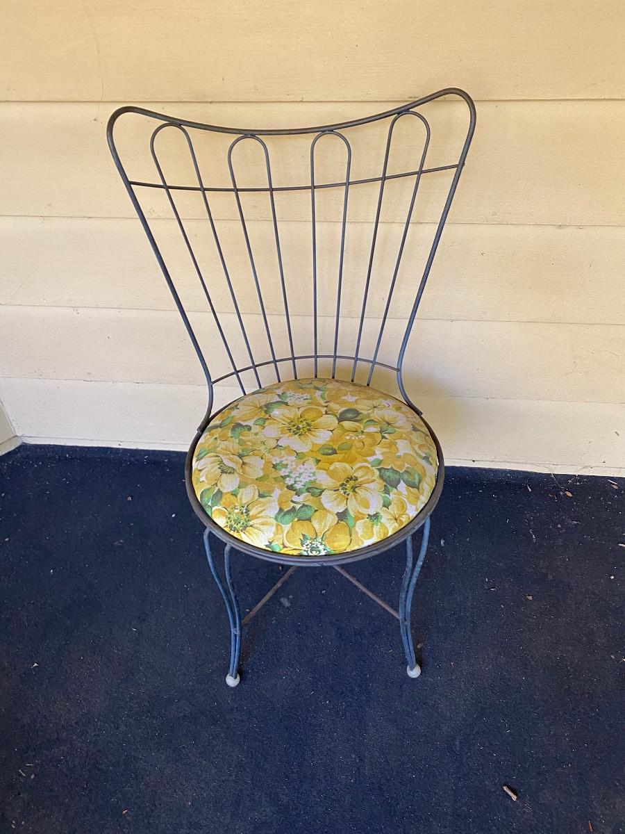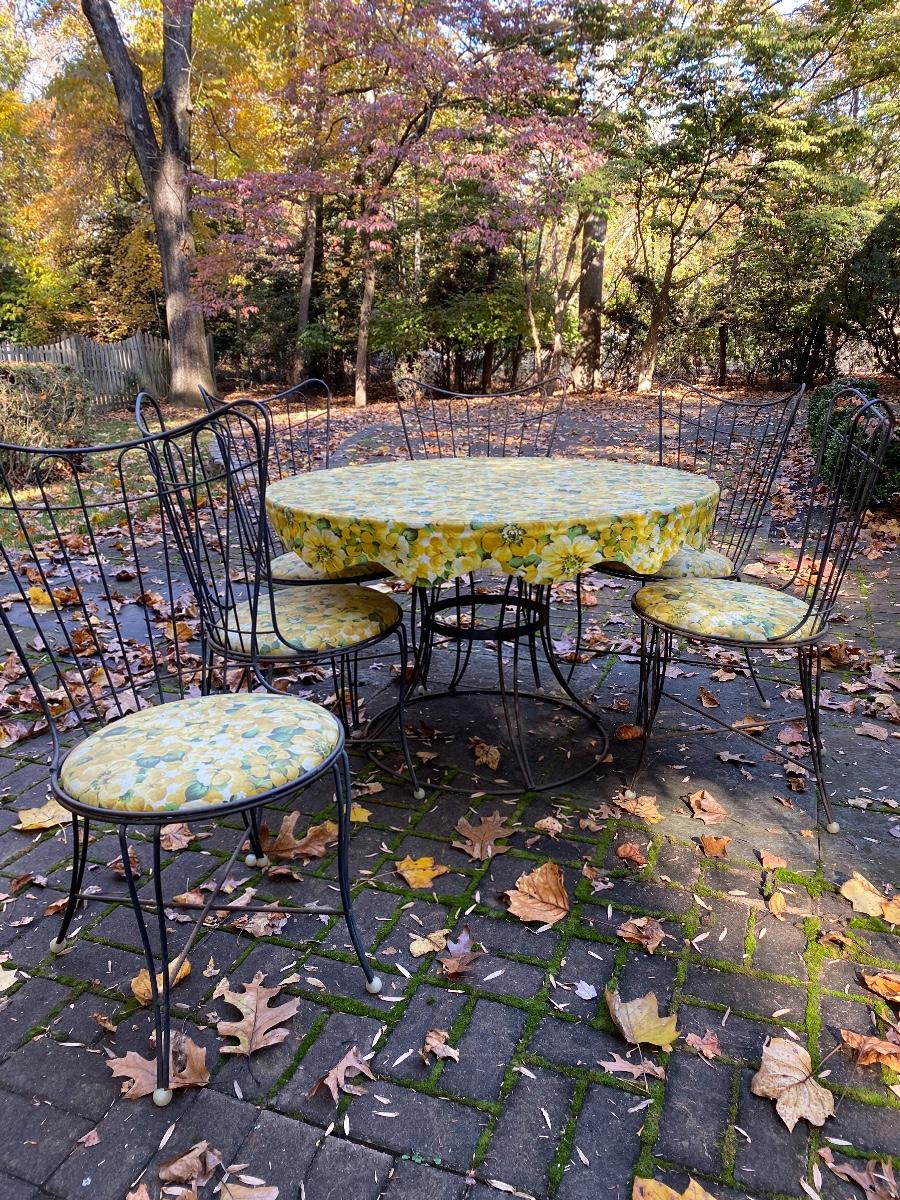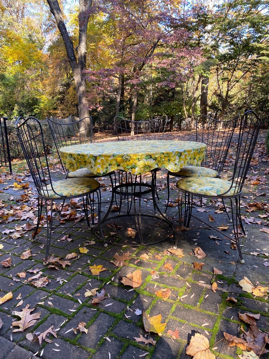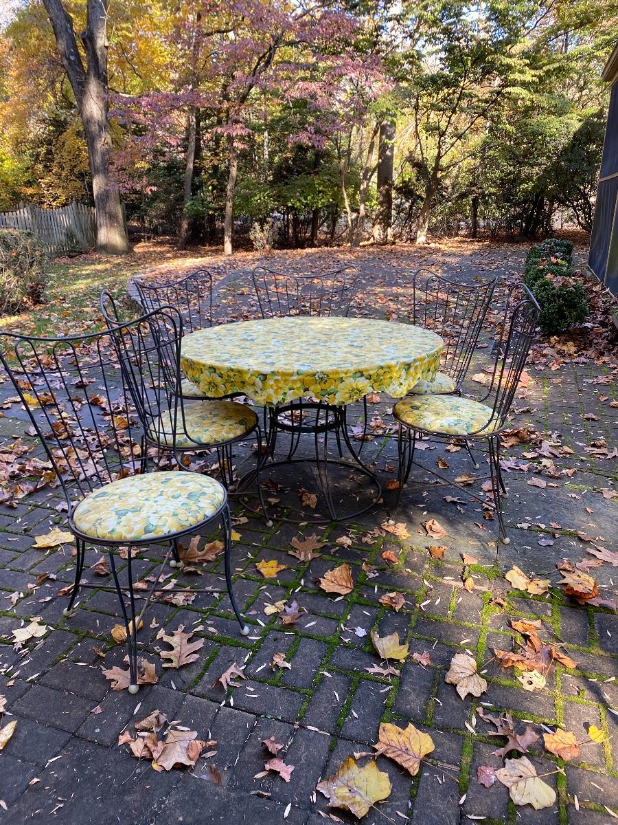Vintage metal outdoor table and 6 matching chairs. Table comes with vintage yellow floral tablecloth. Yellow print matches chair seats. The seats can come off and be recovered. The metal is lightweight, not heavy cast. The pictures show condition, measurements if taken, and what is included in the lot. Due to the large amount that we photograph and the time frame, we are not always able to take measurements. All items unless noted, are pre-owned and have been used. If you purchased furniture, you must bring help. We do not allow one person to carry large furniture out on their own. Bring help, tools and a truck for the safety of our client’s homes, and your personal safety. Company policy. Thank you.