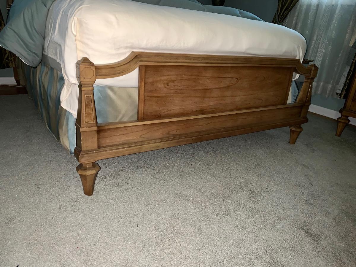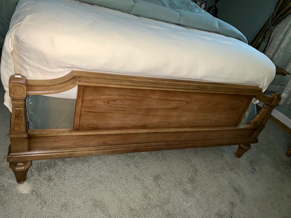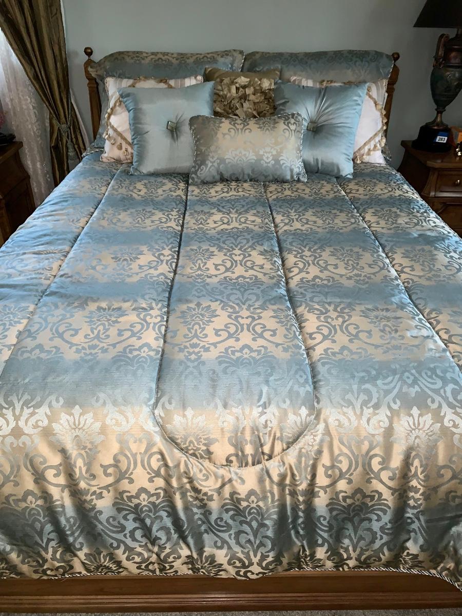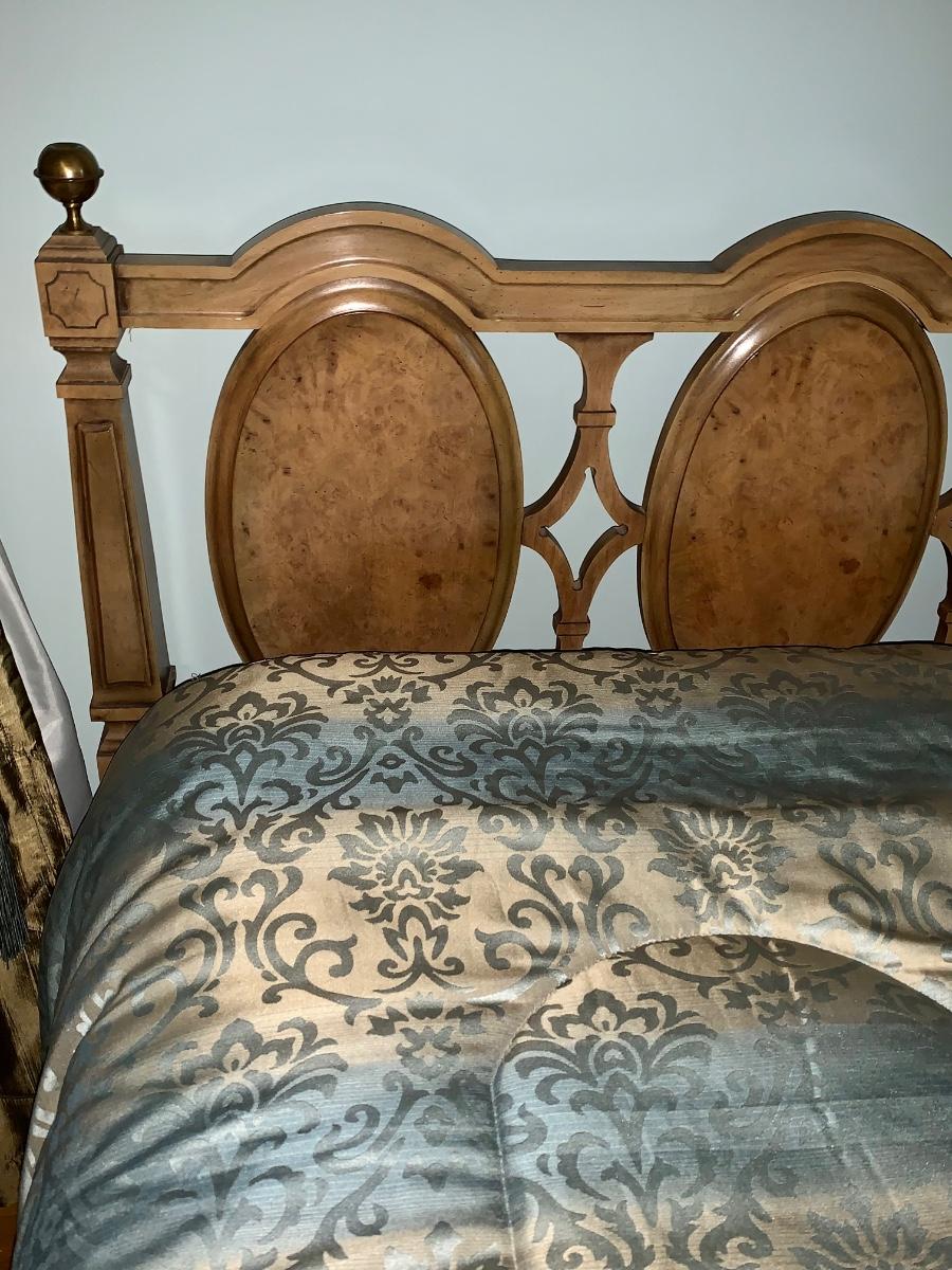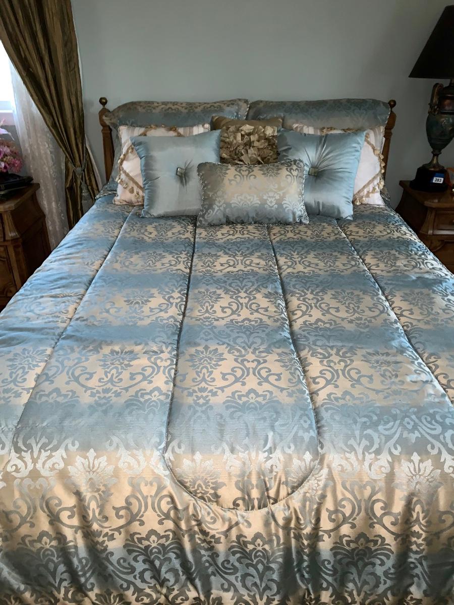 Beautiful, well made and taken care of Head Board, foot board and bedding: mattress & box spring if you want as well.