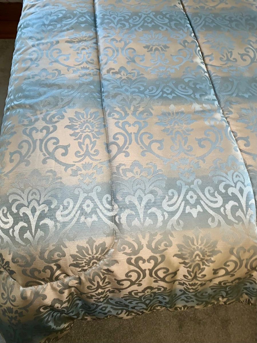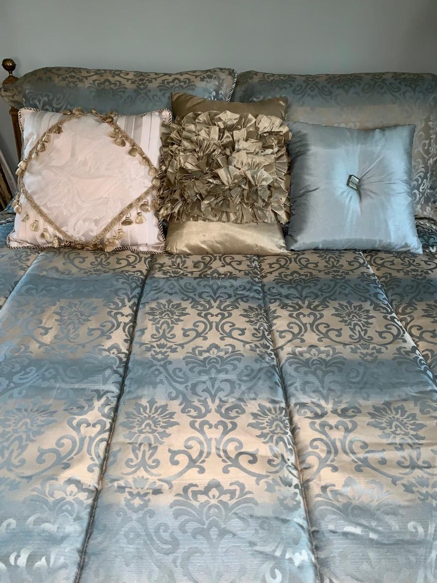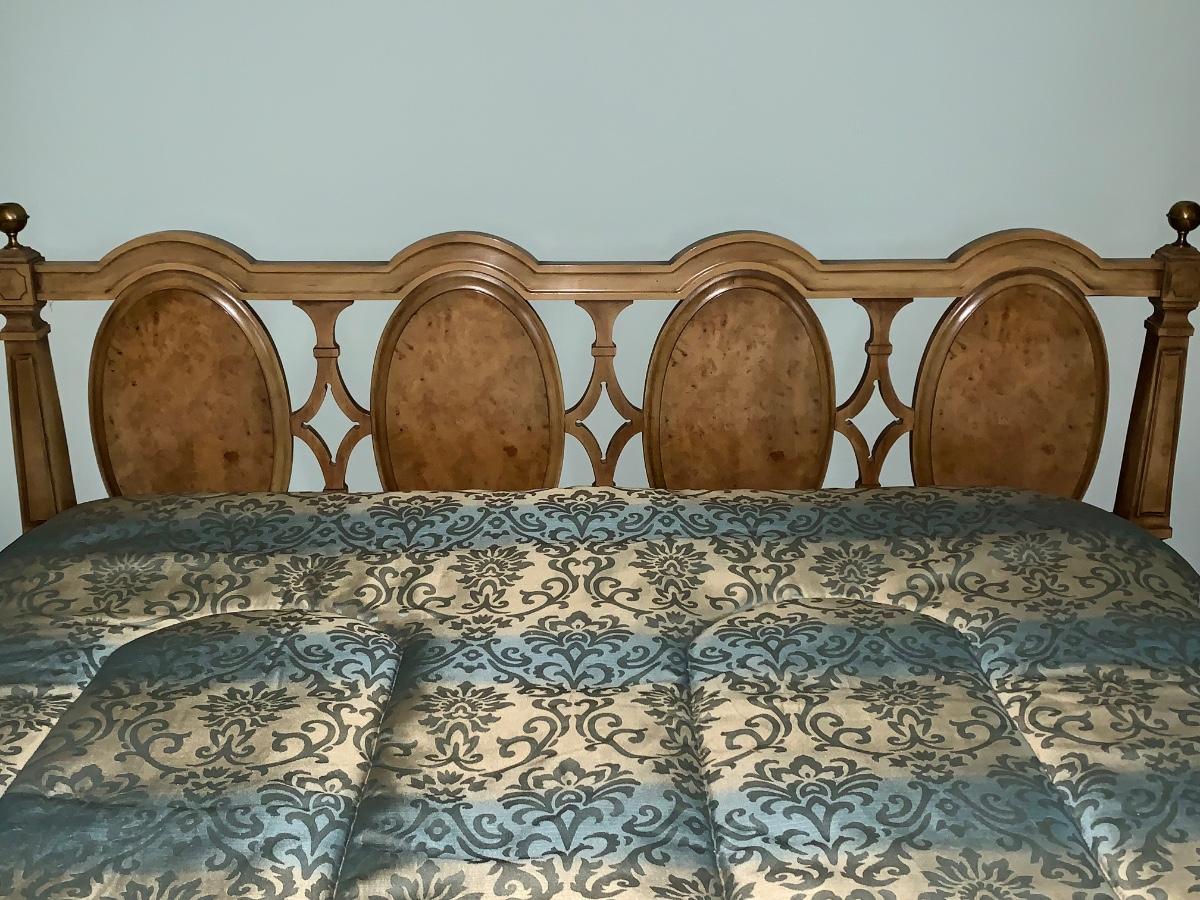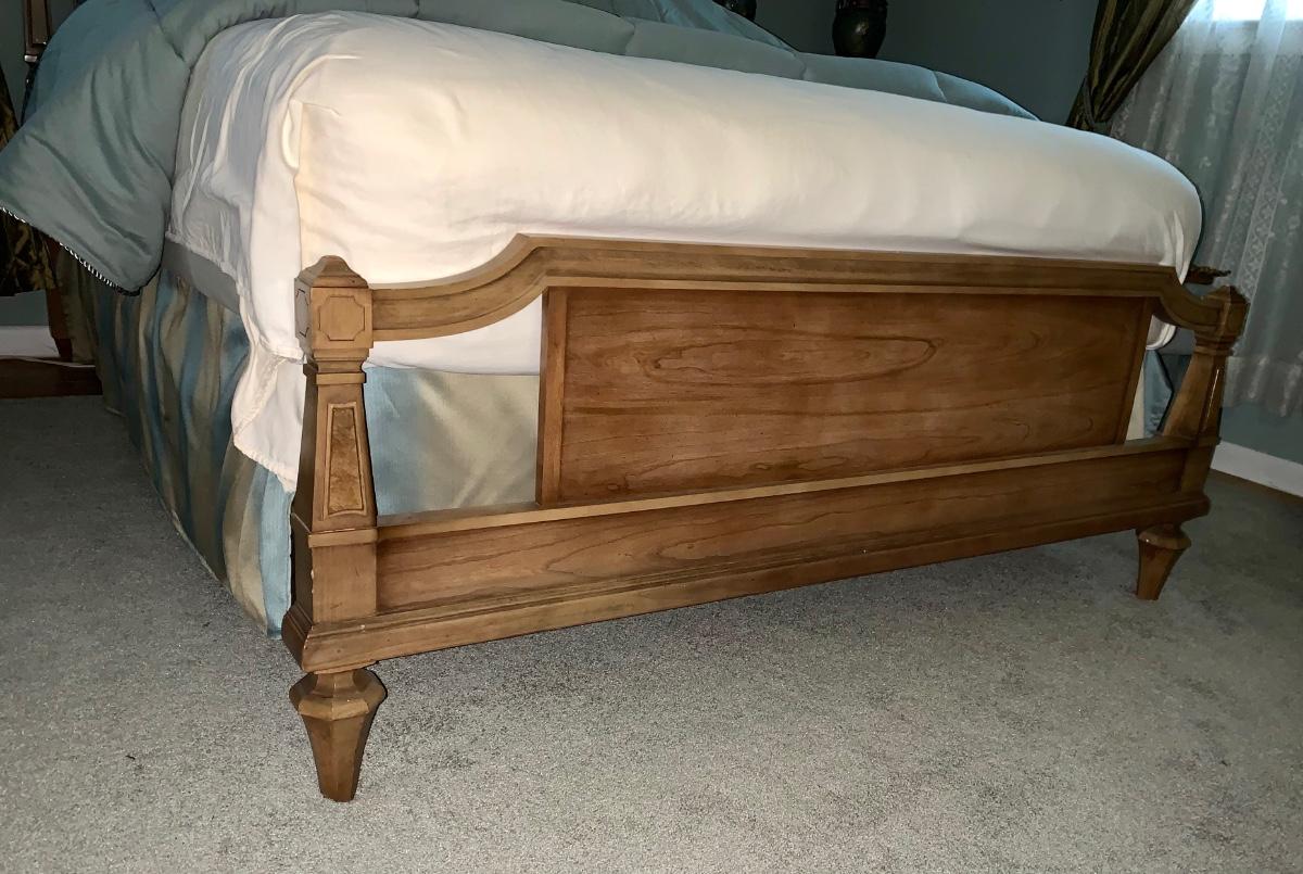 Beautiful, well made and taken care of Head Board, foot board and bedding: mattress & box spring if you want as well.