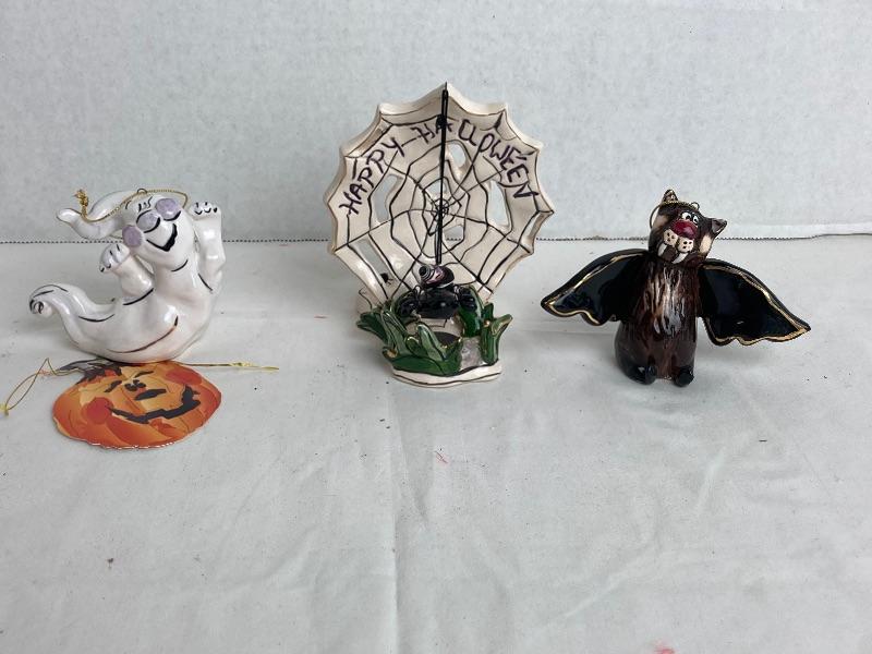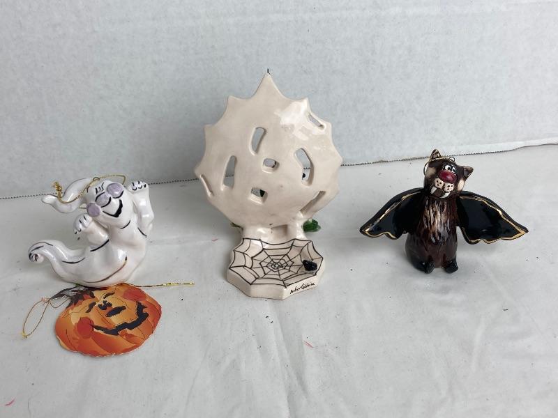 Blue Sky Clay Works Heather Goldminc “Boo the Ghost” “Fang the Cat” and Spiderweb tea light candle holders