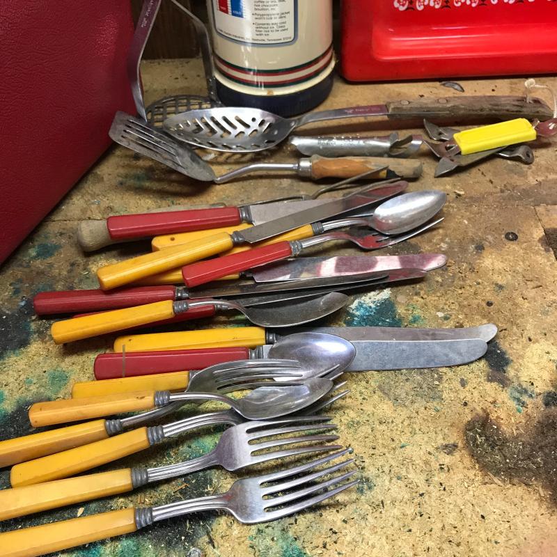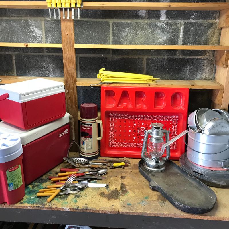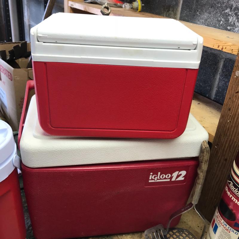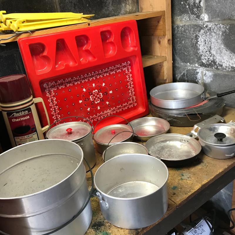 Get out in the wild! Collection includes three small coolers and two insulated beverage containers. Utensils perfect for your camping meals and aluminum pots and pans to complete your fire-grilled meal! Lot also includes four metal and eight heavy duty plastic stakes. Lastly a metal lantern that worked when turned on, but its two DD batteries had oxidized. See photos. No shipping.