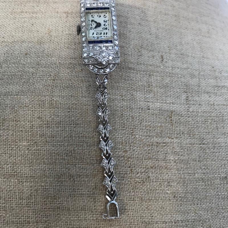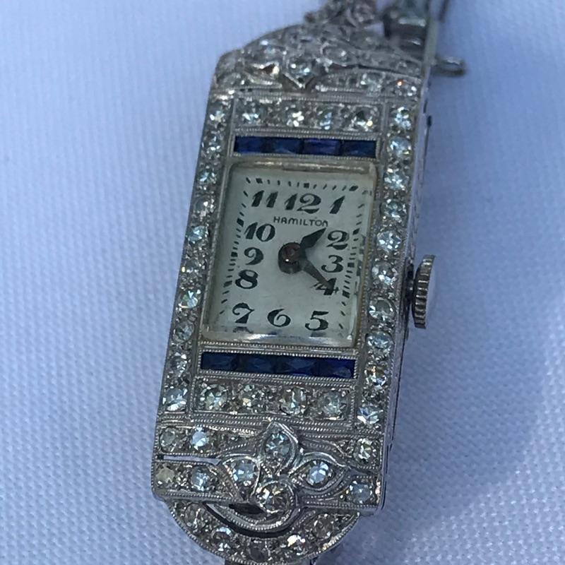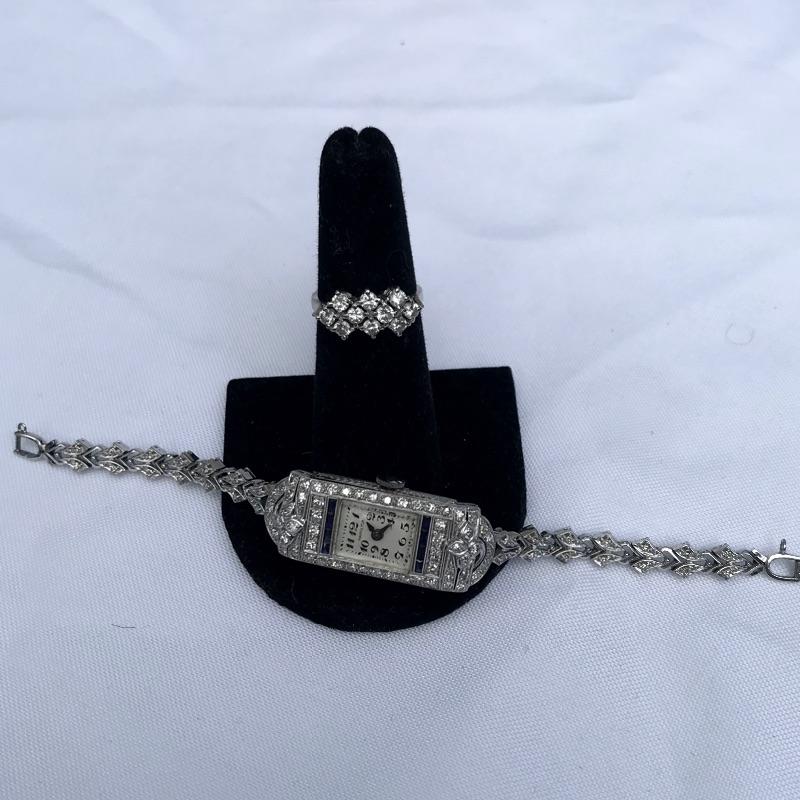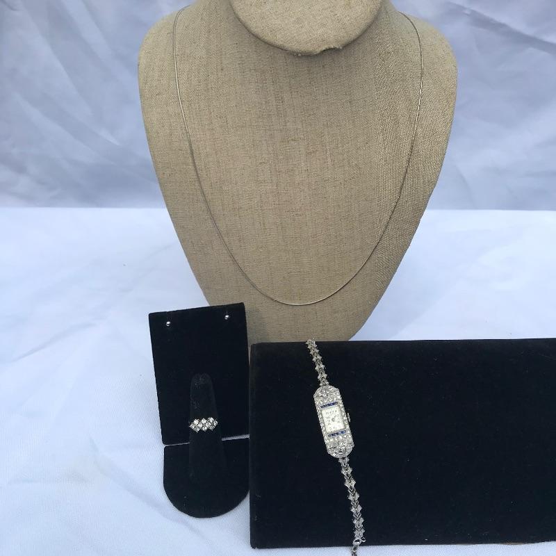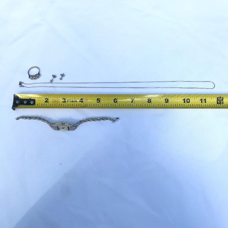 Stunning lot full of 14k white gold and diamonds. Lot includes a Hamilton wrist watch with gems testing positive for diamonds all around the face. The band has gems as well, but they are too small for us to test. There are also bright blue sapphire like gems on each end of the face. This watch is small, perfect as is for a very petite wrist. Next a beautiful size 5.5 white gold ring with ten diamonds. Lastly two more white gold pieces to complete your look. A pair of stud earrings and a thin roped necklace with a lobster claps. All pieces are marked 14K, some have more markings, see images. Starting price based on melt value of gold. Shipping available