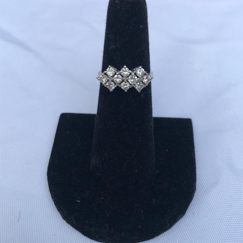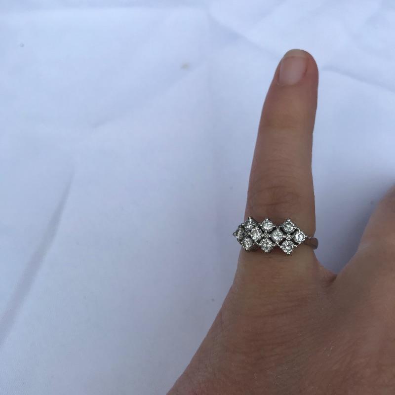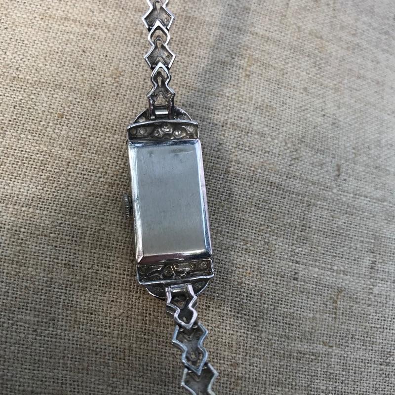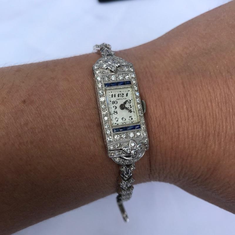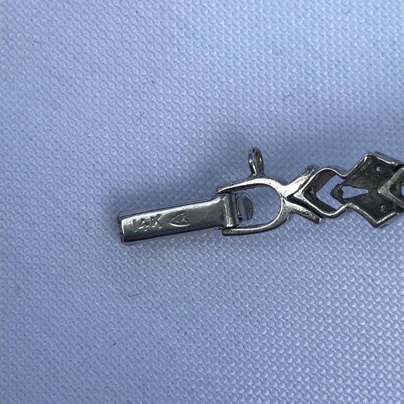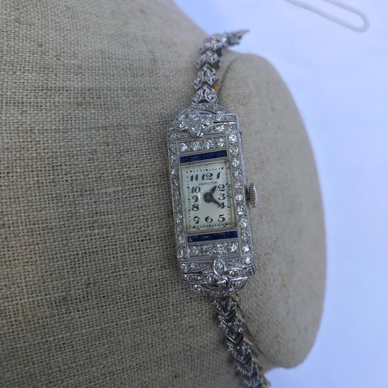 Stunning lot full of 14k white gold and diamonds. Lot includes a Hamilton wrist watch with gems testing positive for diamonds all around the face. The band has gems as well, but they are too small for us to test. There are also bright blue sapphire like gems on each end of the face. This watch is small, perfect as is for a very petite wrist. Next a beautiful size 5.5 white gold ring with ten diamonds. Lastly two more white gold pieces to complete your look. A pair of stud earrings and a thin roped necklace with a lobster claps. All pieces are marked 14K, some have more markings, see images. Starting price based on melt value of gold. Shipping available