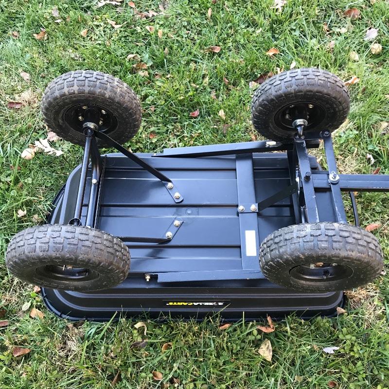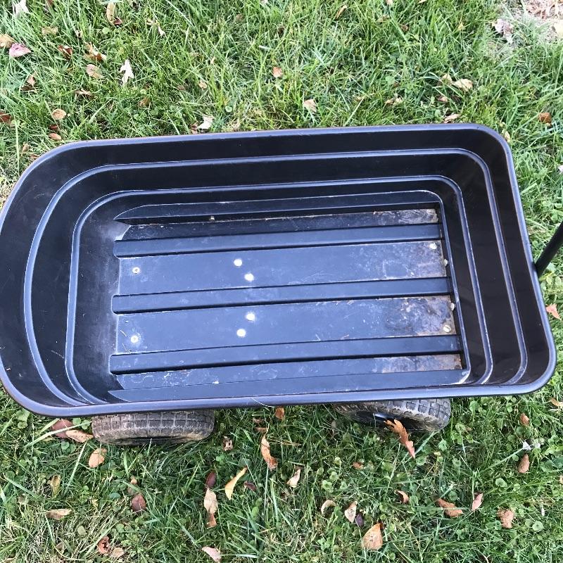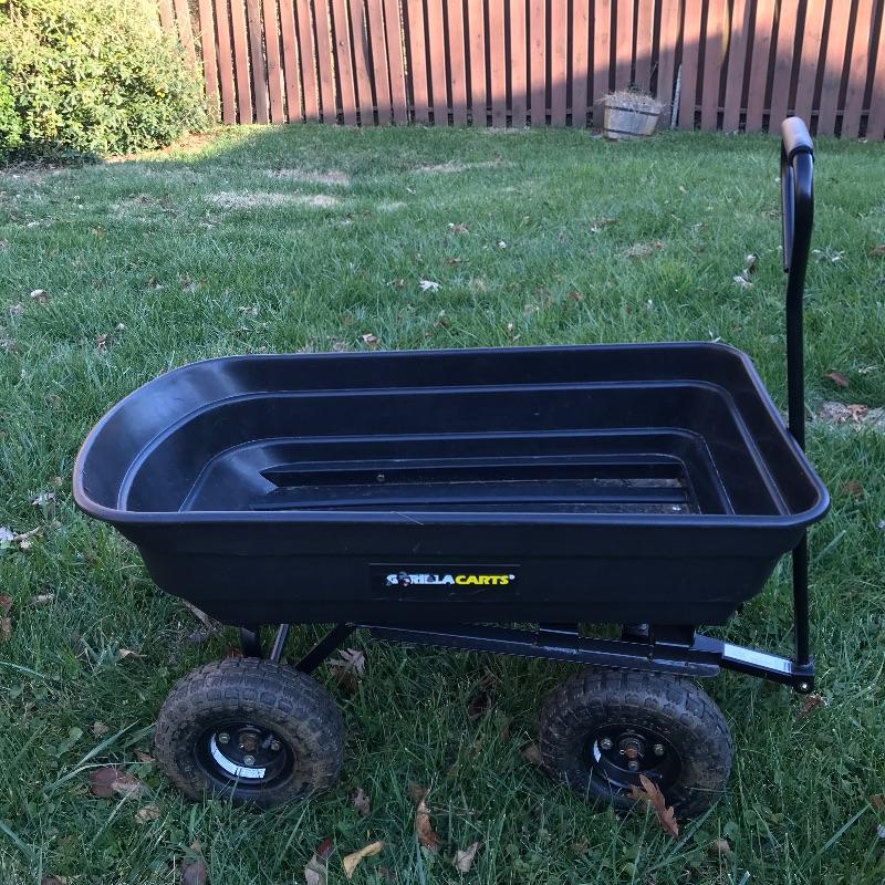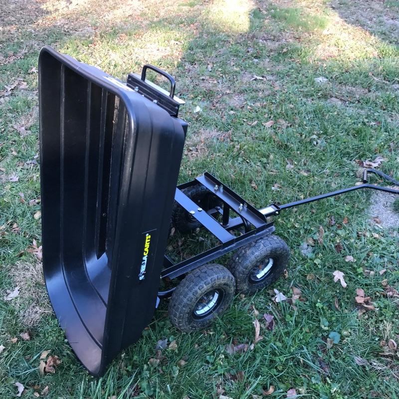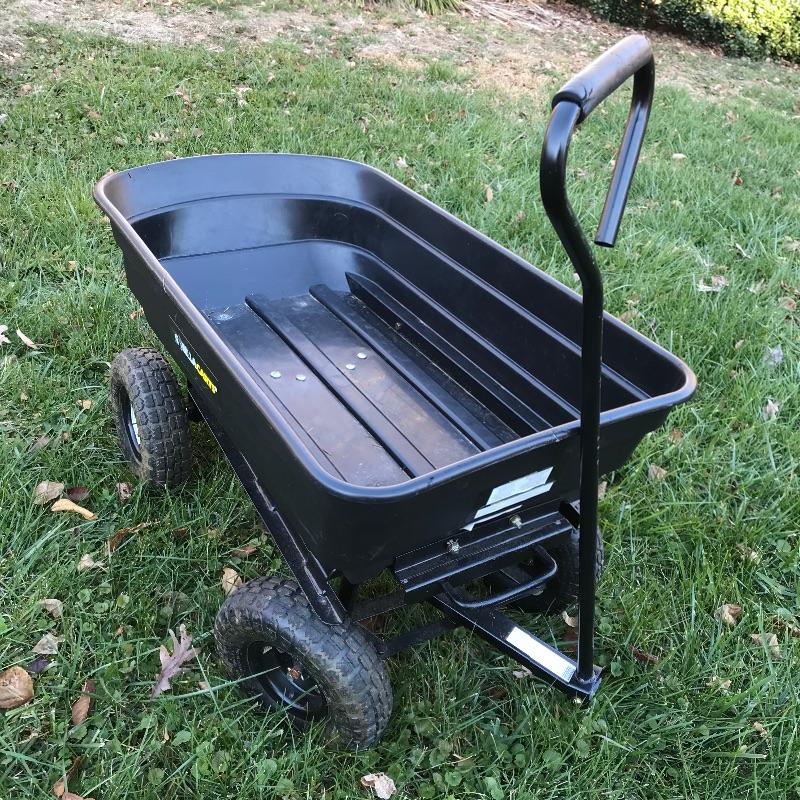 Super handy yard tool here with this Gorilla Garden Dump Cart GOR200B which features a dumping feature for quick unloading. Basin is a rust free heavy duty plastic and steel frame holds steady when maneuvering through the yard. Cart measures approximately 36.5” x 20” x 20”. Cart rolls and maneuvers easily, dump features works well. See photos. No shipping.