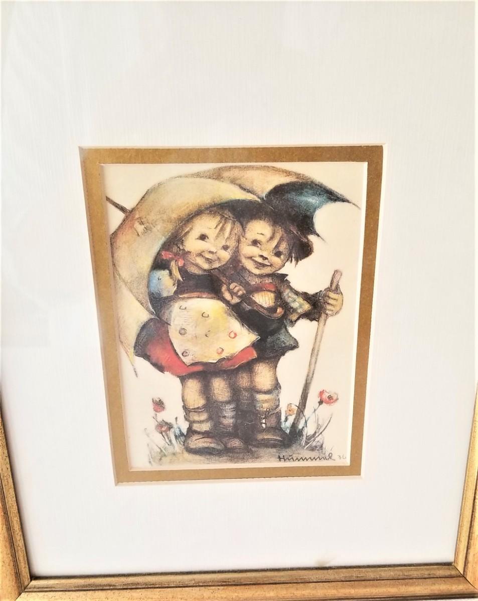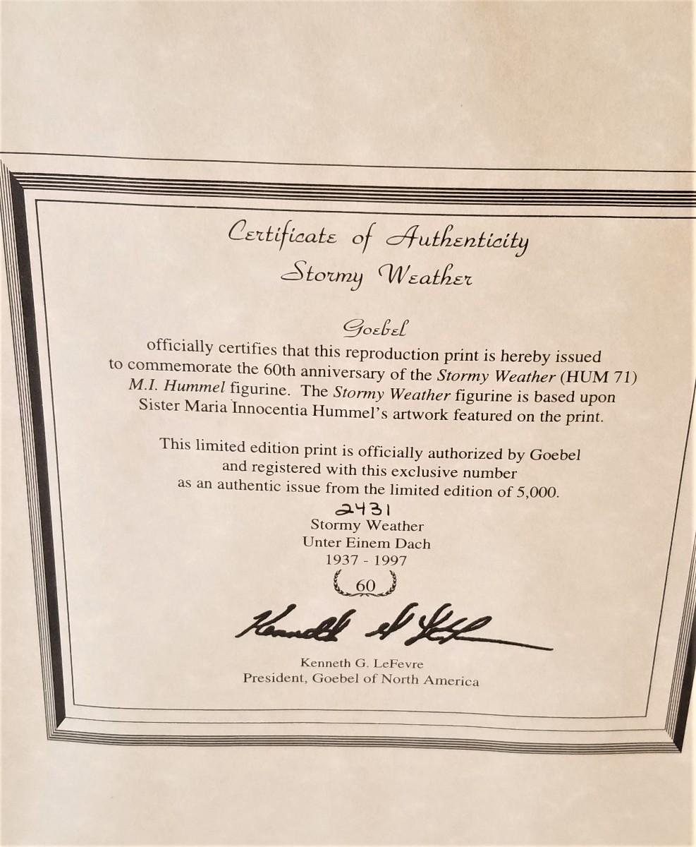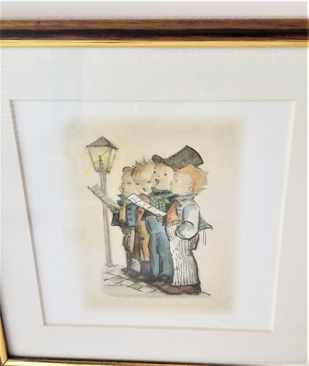 You get all you see here - three HUMELL limited edition prints - the largest "Stormy Weather" commemorates the 60th anniversary, #2431 of 5,000 made, 1997. Carolers is #293 of 500 - Boy in Wagon is #63/500. Both are 7.75" x 7.75". The ceramic ornament comes in the original box and was made in 2005.