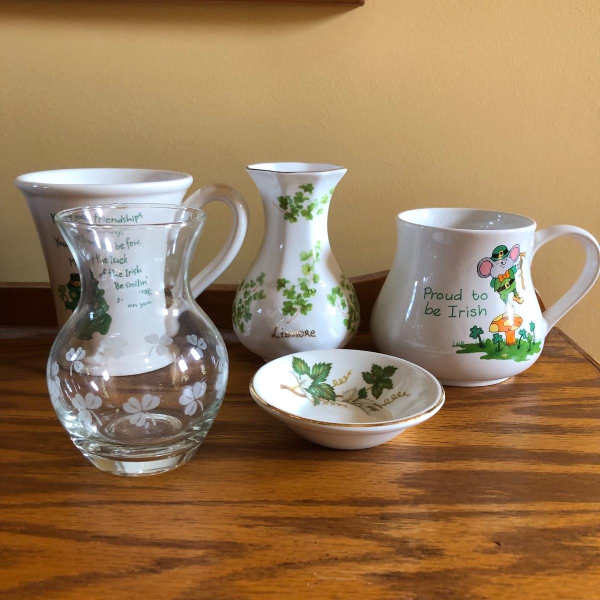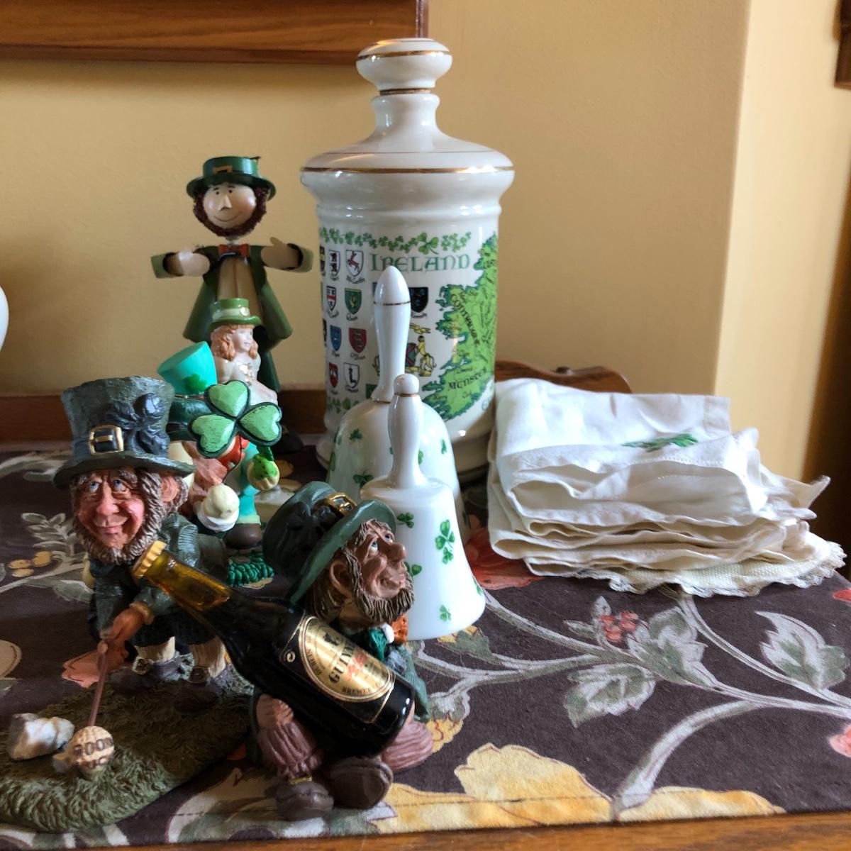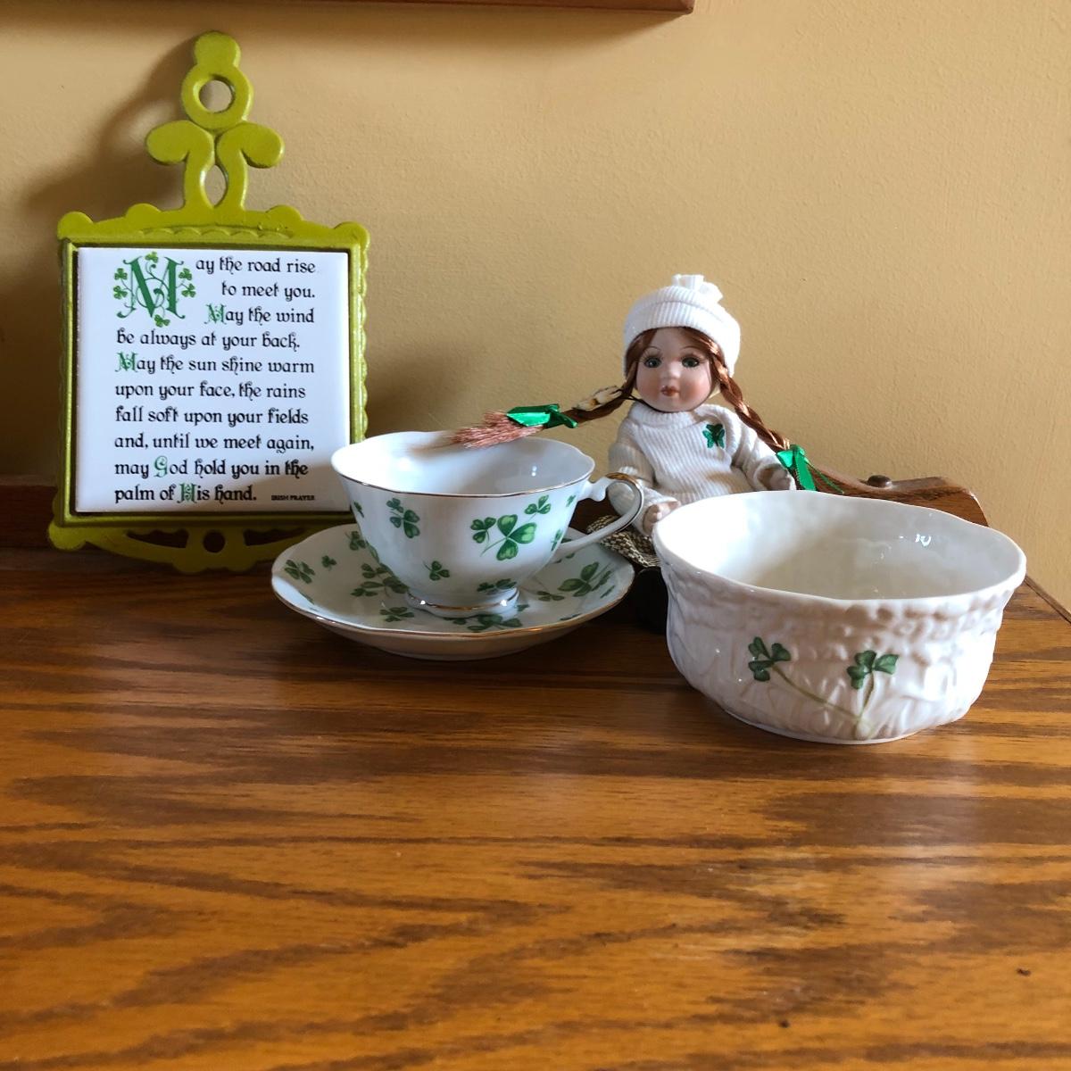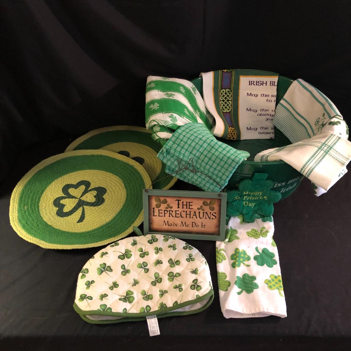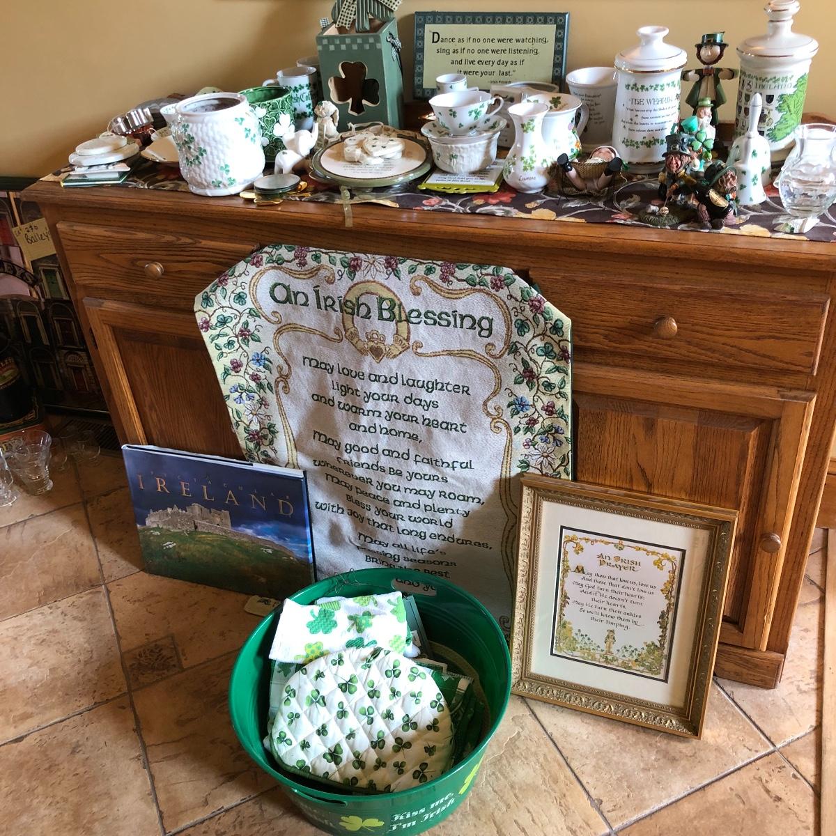 This lot will bring a smile to the face of any Irishman or Irishwoman! This lot includes China by Beeleek, Lefton and Japanese made. It also includes stone coasters, framed artwork, book, tablecloth, napkins, two porcelain decanters, and so much more. Frame measures 13.5” x 16.5”. The furniture pictured is not included in this lot; it is in lot 271.