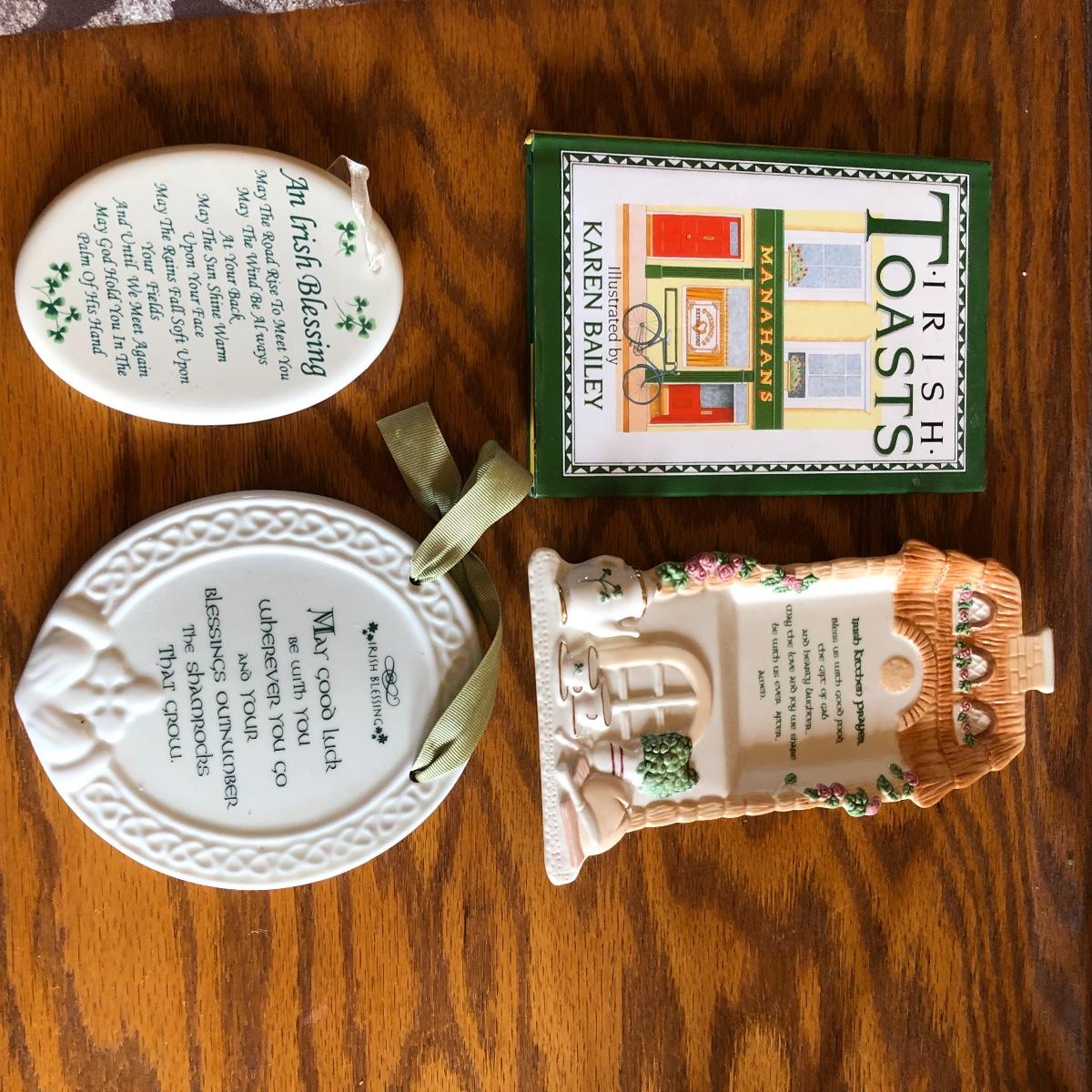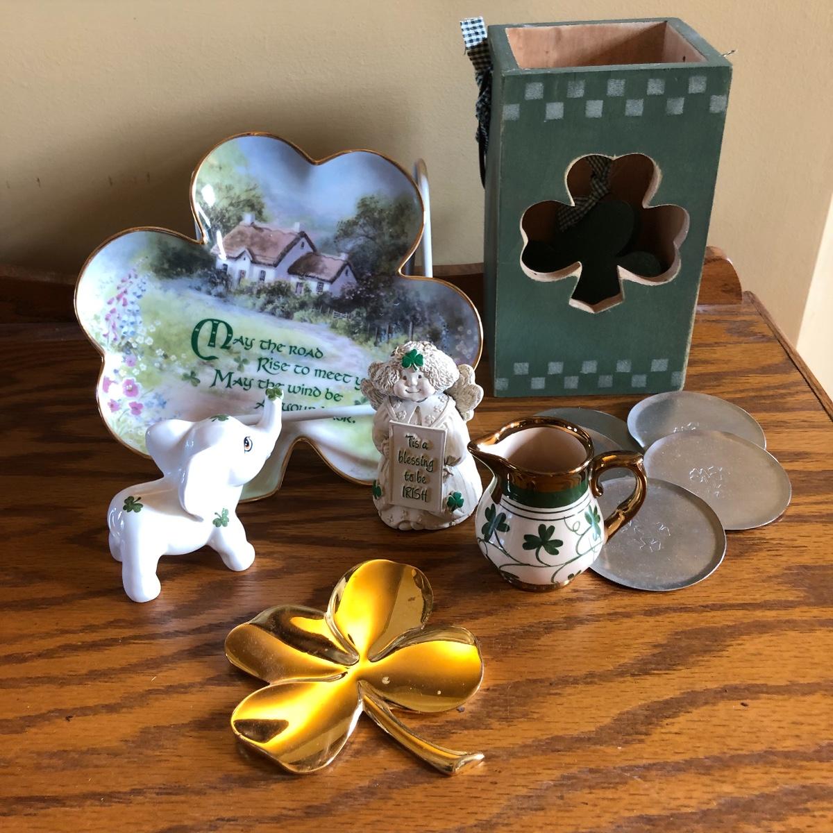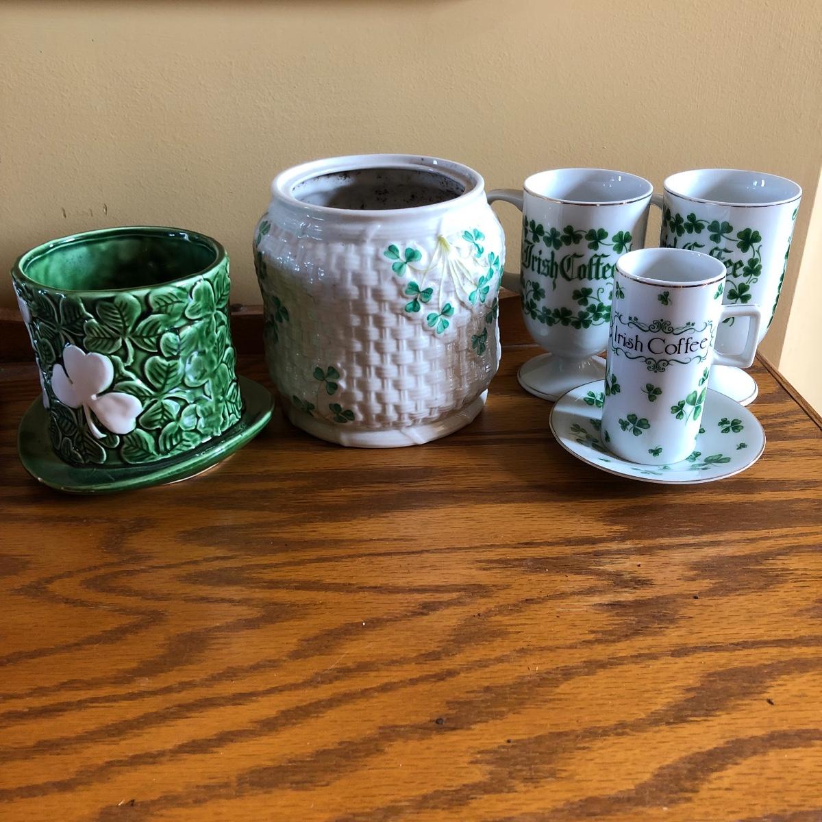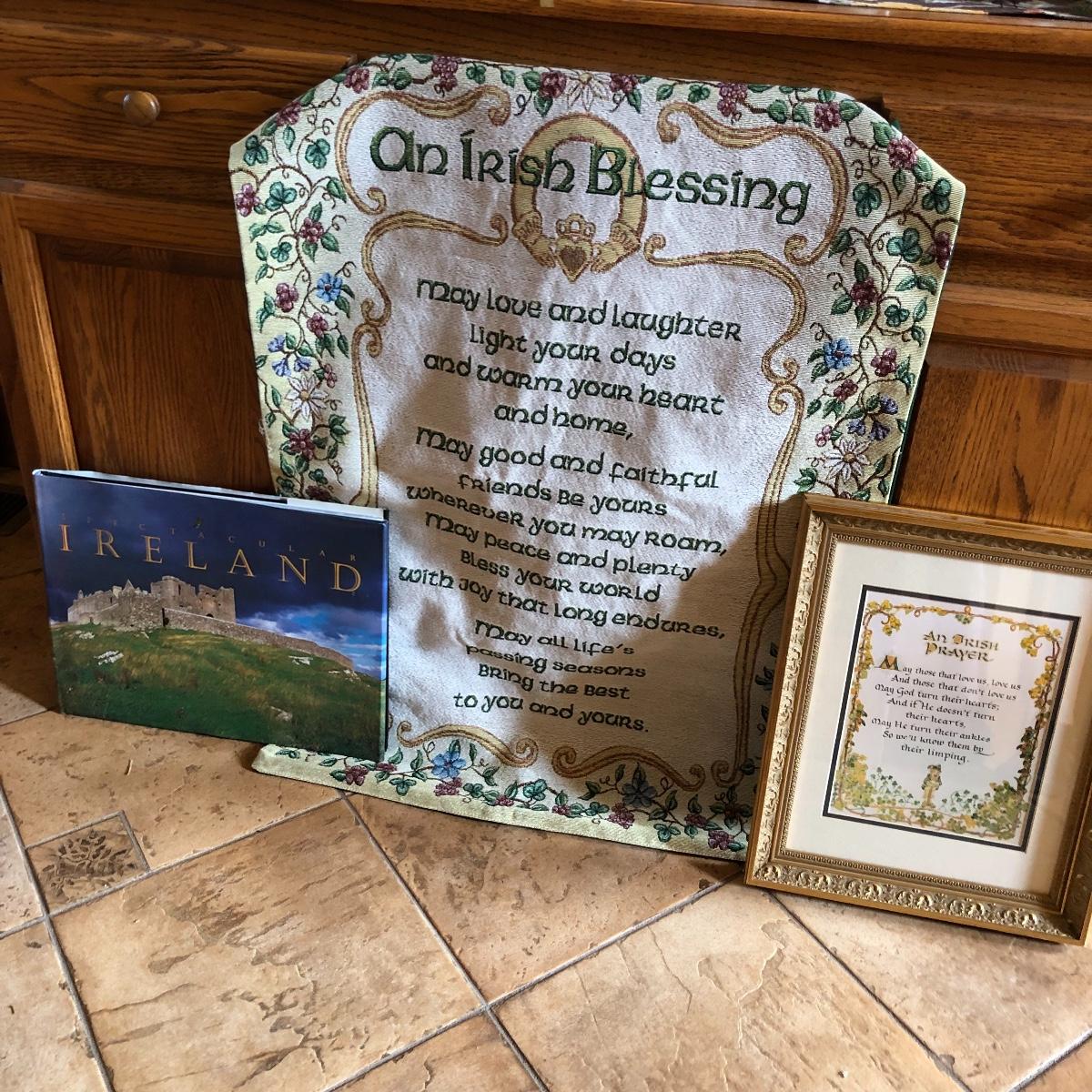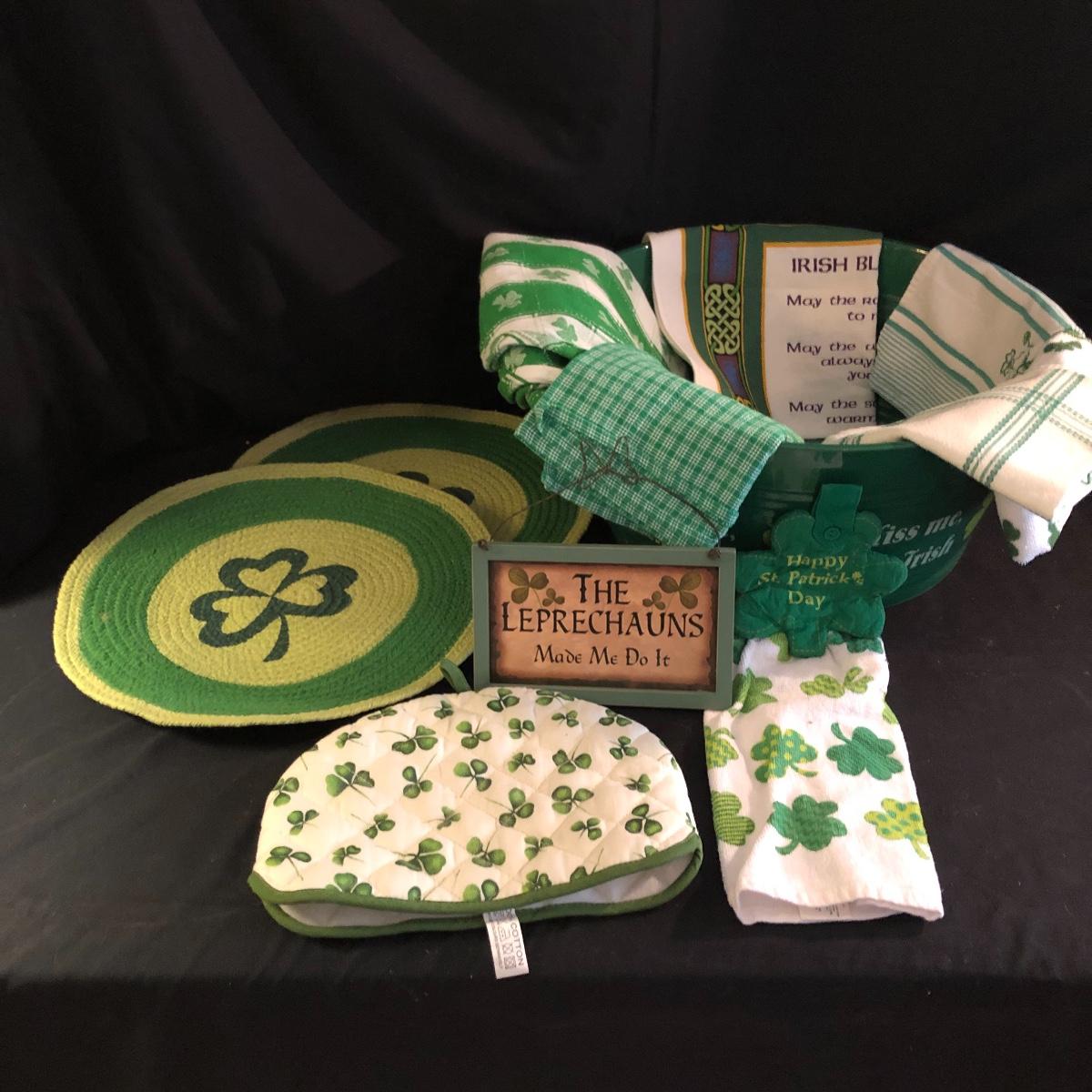 This lot will bring a smile to the face of any Irishman or Irishwoman! This lot includes China by Beeleek, Lefton and Japanese made. It also includes stone coasters, framed artwork, book, tablecloth, napkins, two porcelain decanters, and so much more. Frame measures 13.5” x 16.5”. The furniture pictured is not included in this lot; it is in lot 271.