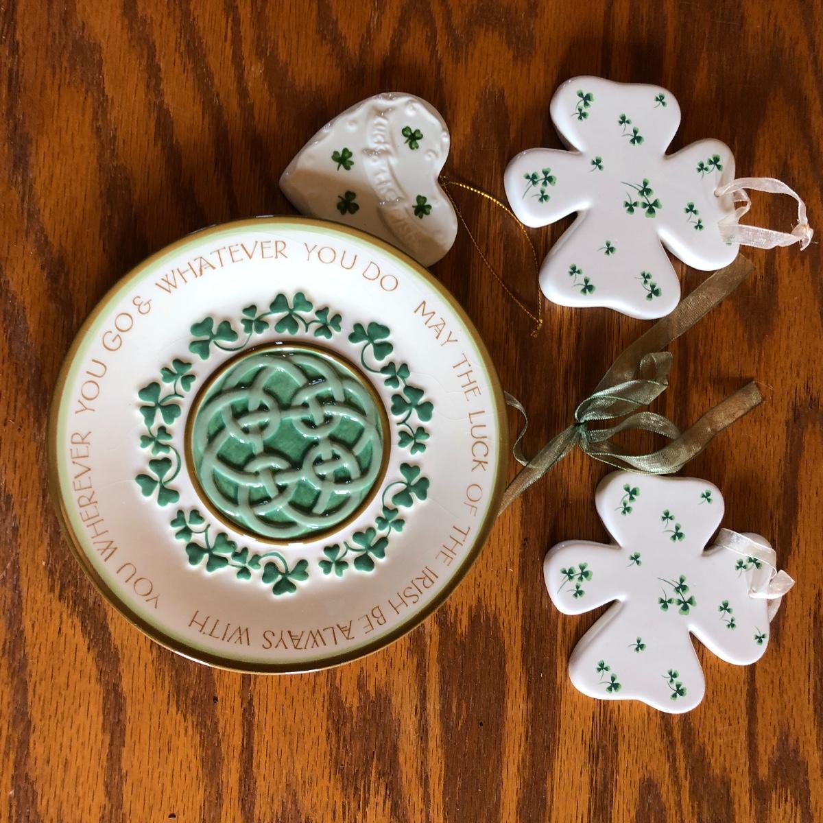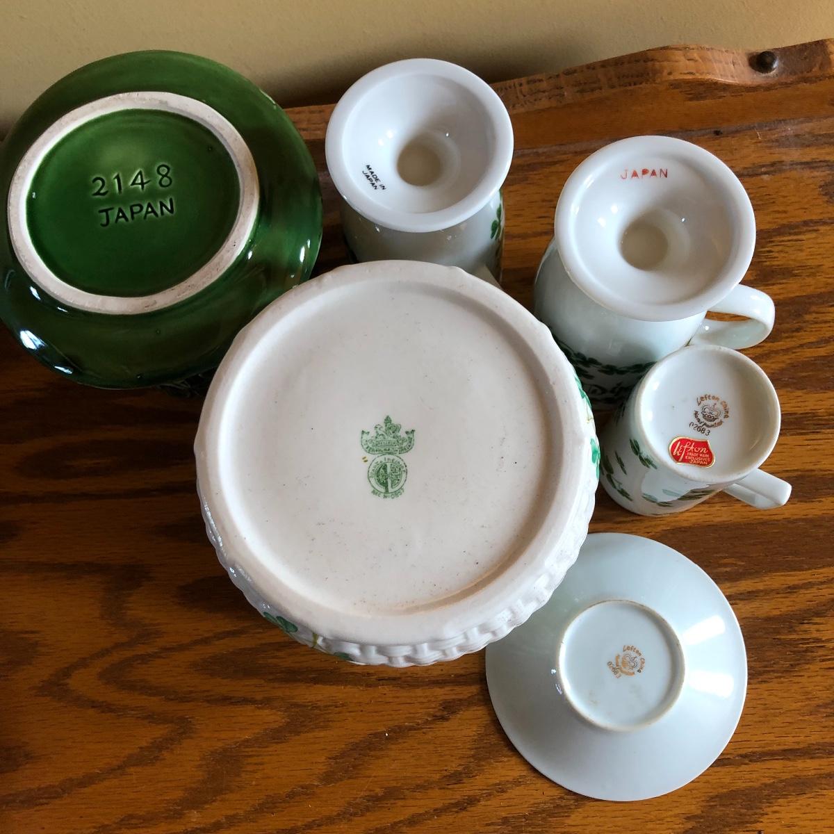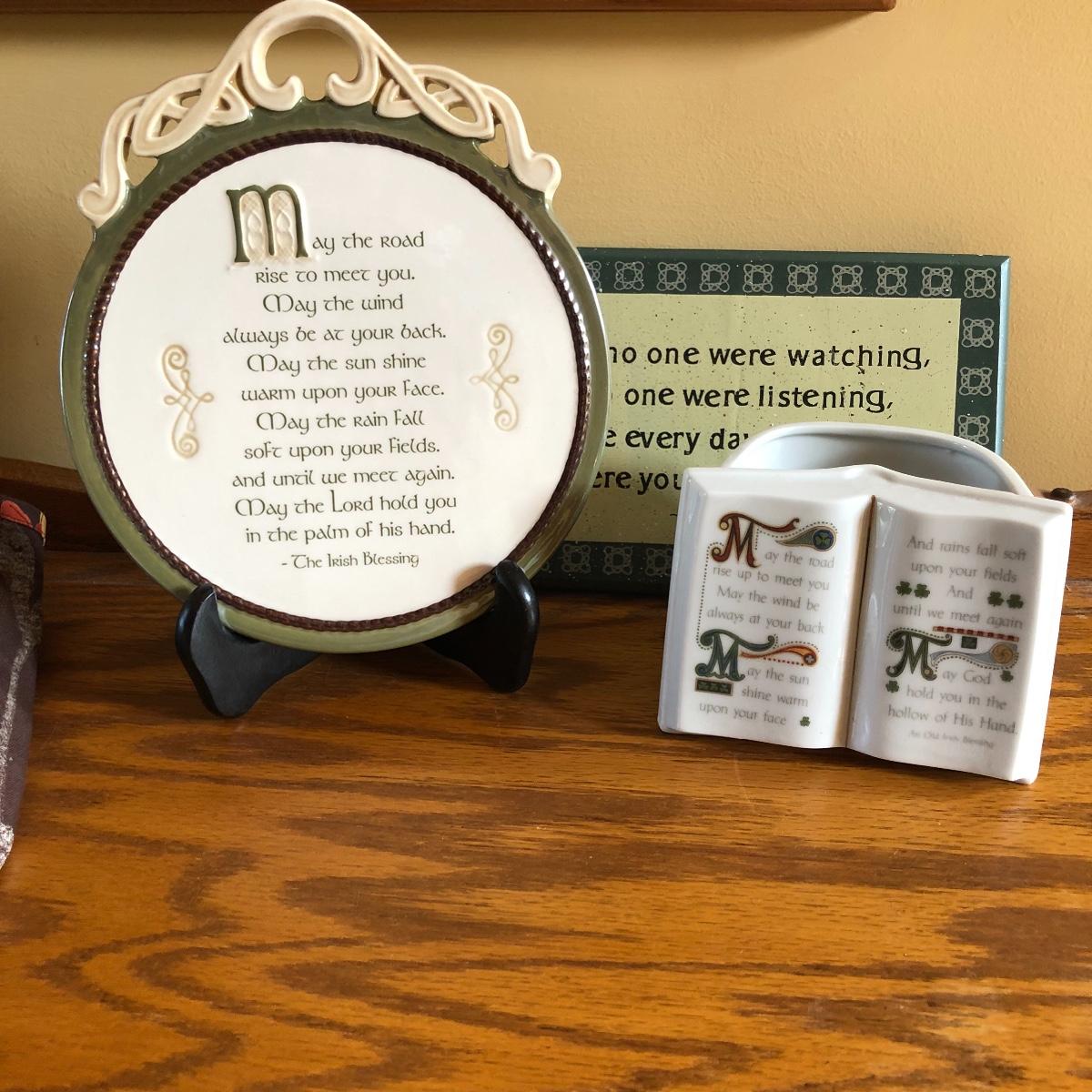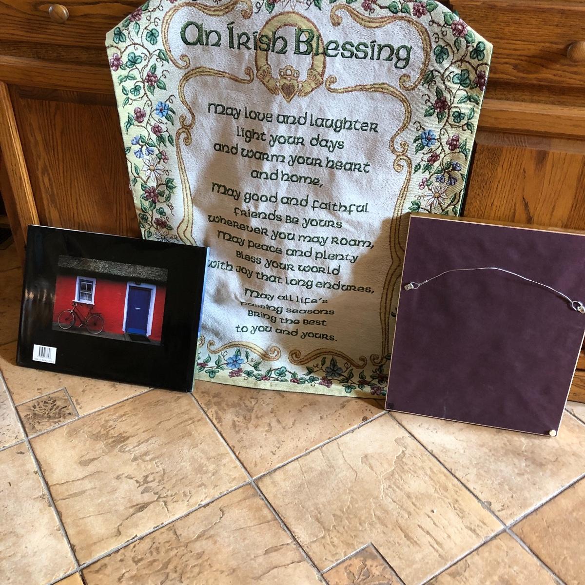 This lot will bring a smile to the face of any Irishman or Irishwoman! This lot includes China by Beeleek, Lefton and Japanese made. It also includes stone coasters, framed artwork, book, tablecloth, napkins, two porcelain decanters, and so much more. Frame measures 13.5” x 16.5”. The furniture pictured is not included in this lot; it is in lot 271.