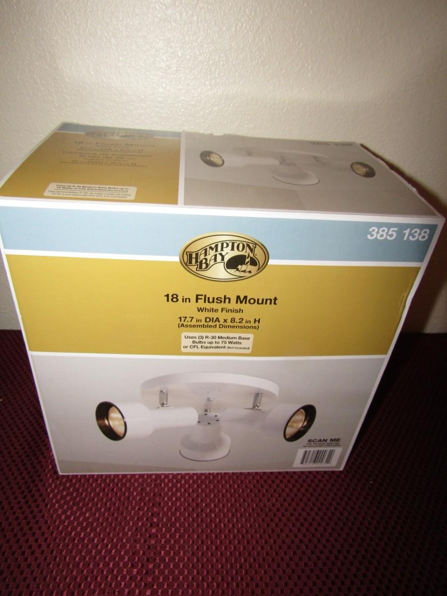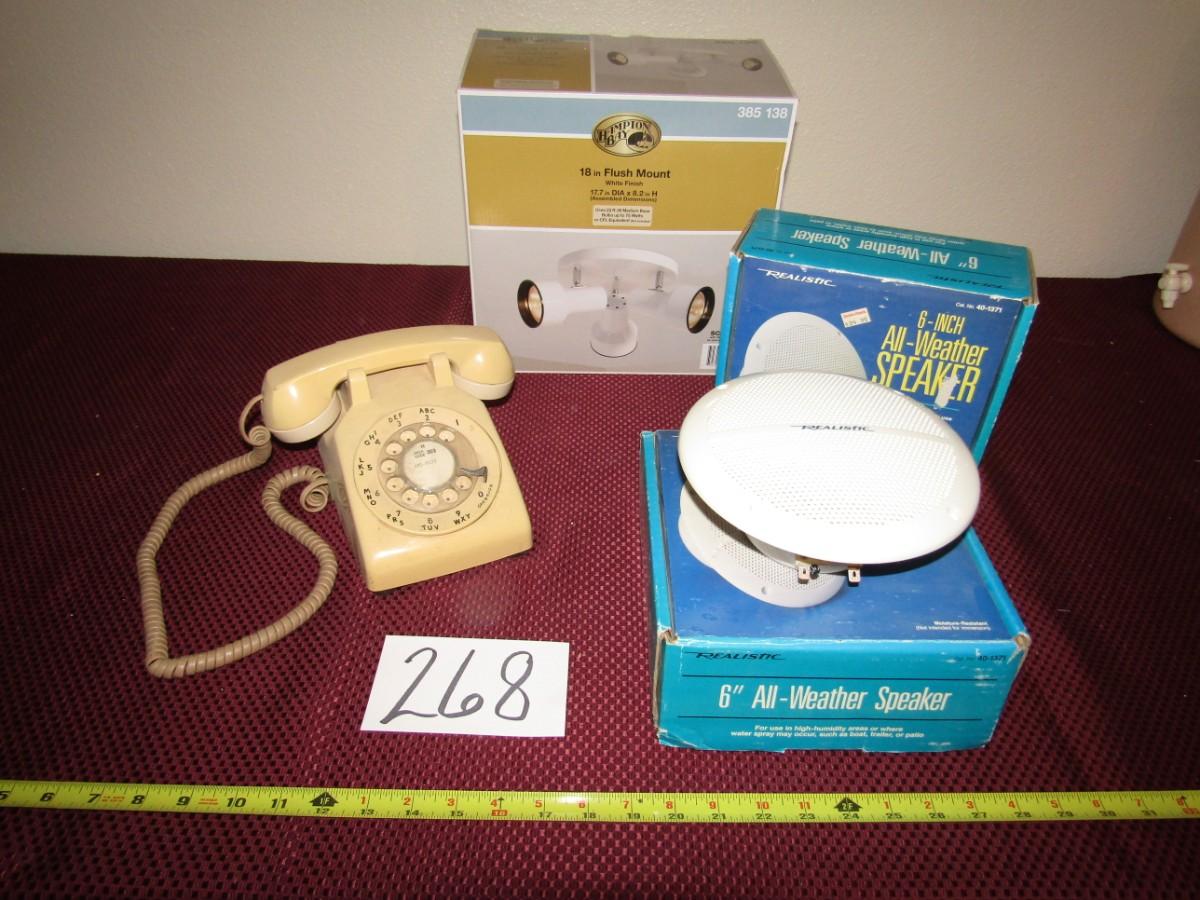 HAMPTON BAY 18" FLUSH MOUNT LIGHT IN BOX, 2 -6" REALIST ALL WEATHER SPEAKERS IN BOX AND ON OLD ROTARY DIAL PHONE
