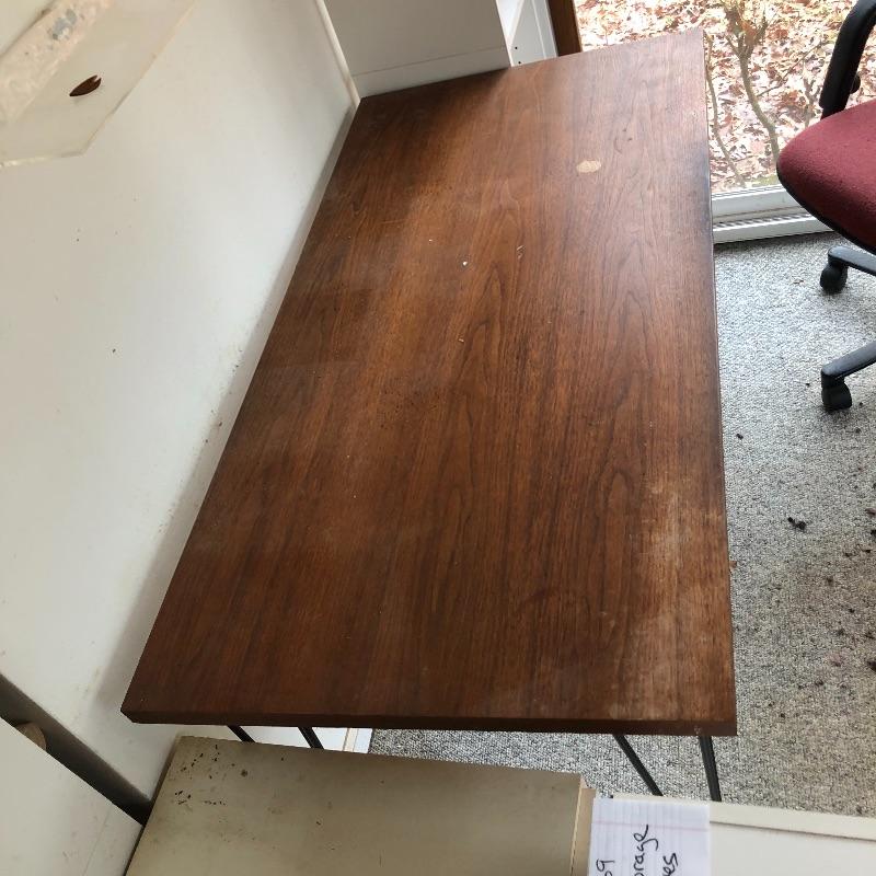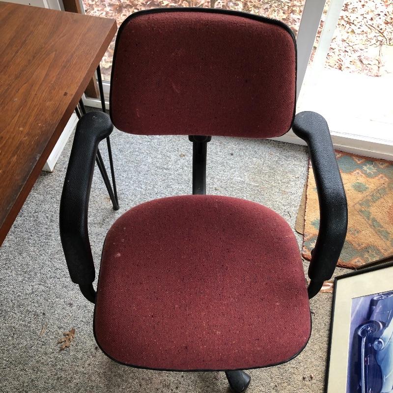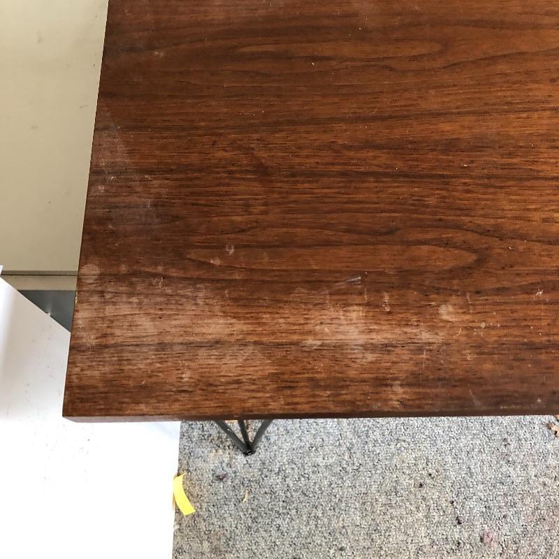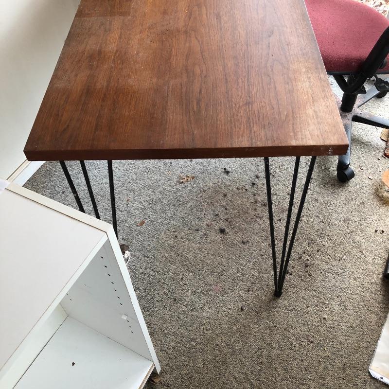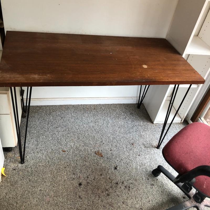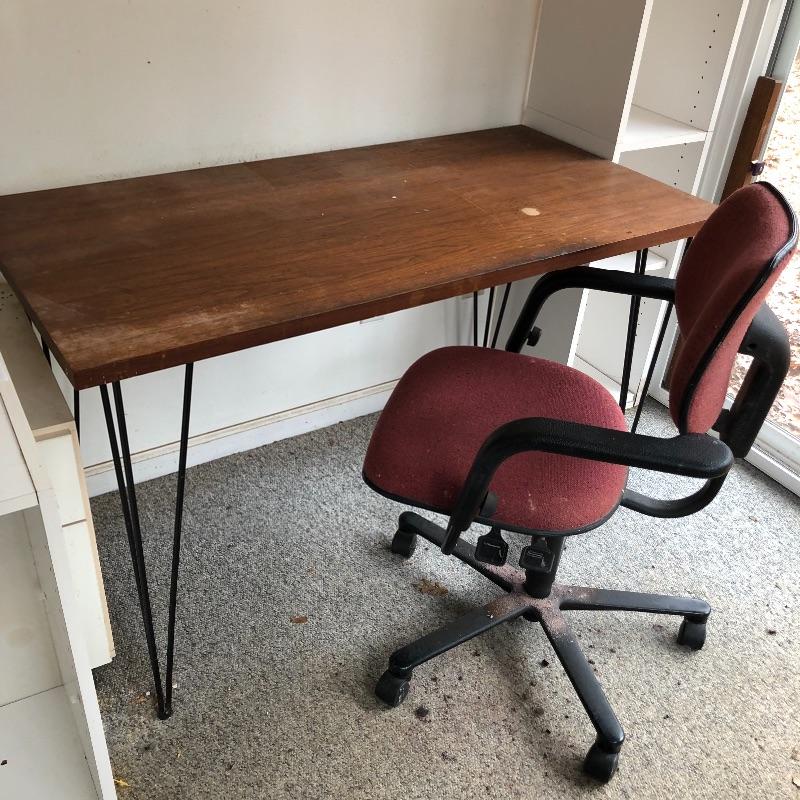 This stylish desk has some wear and tear but would be worth fixing. It’s black metal legs give it a MCM look. The wood surface does have some scratches and marks shown in images and one leg is missing a screw. We have accompanied it with a red fabric office chair.