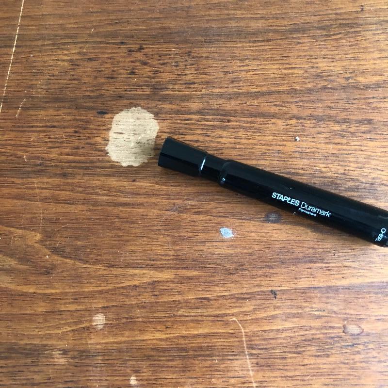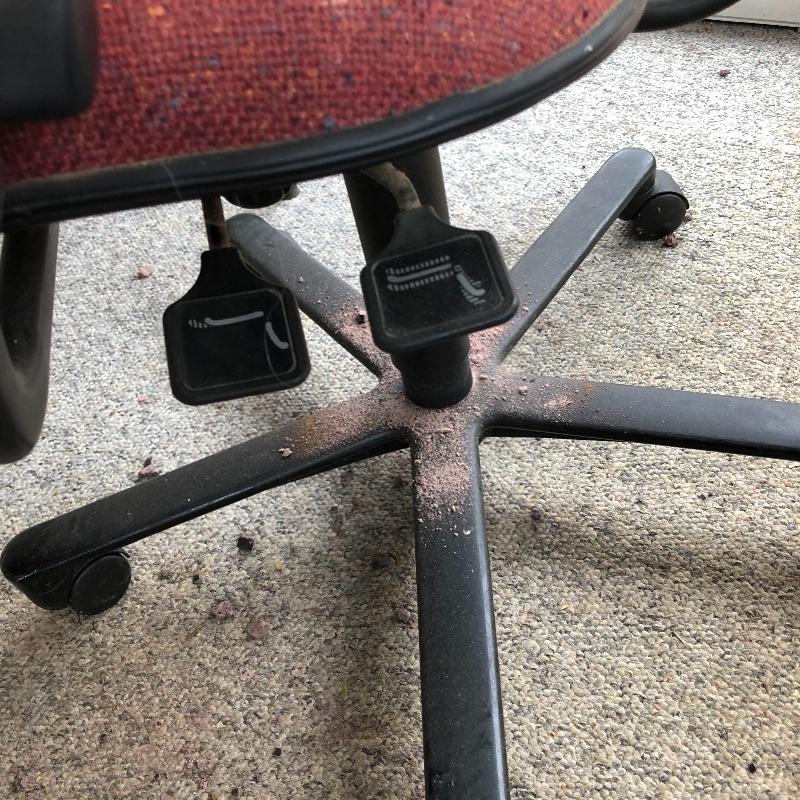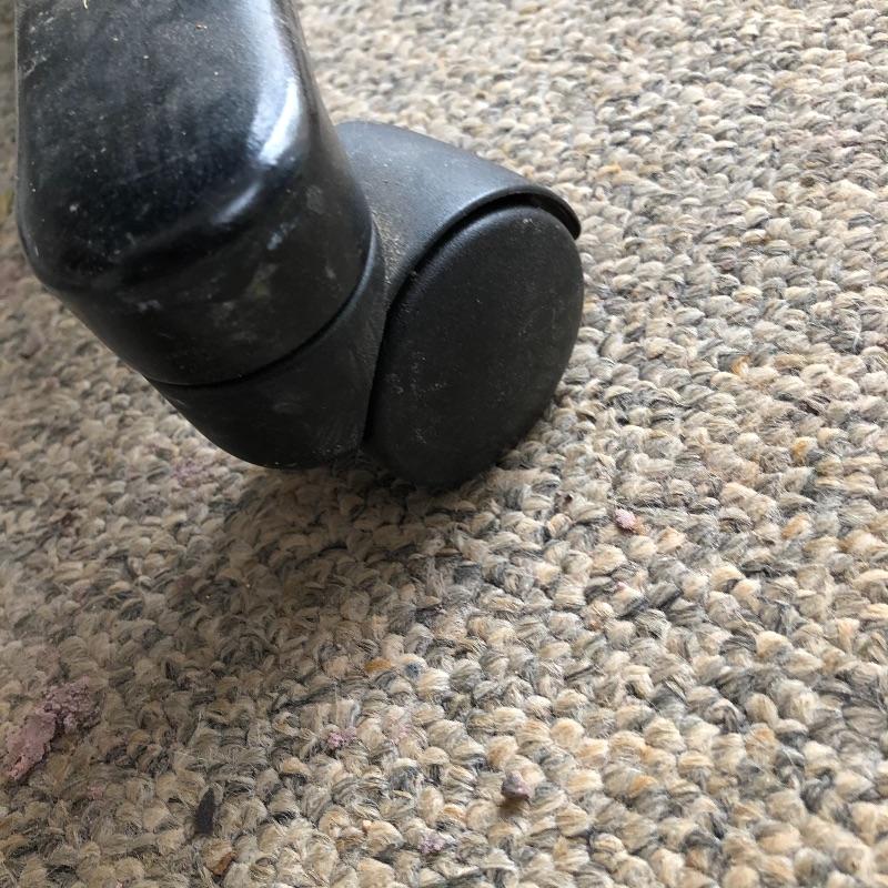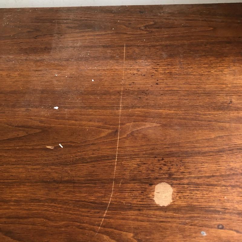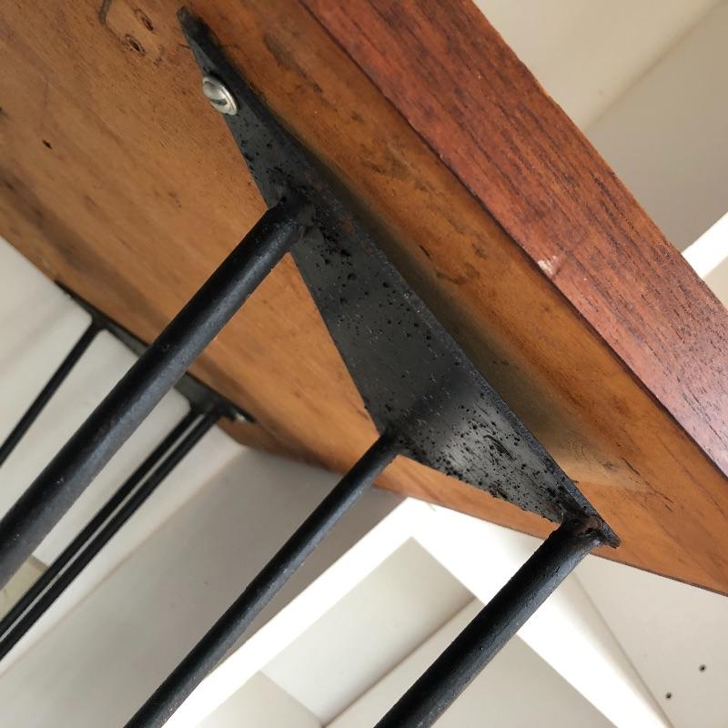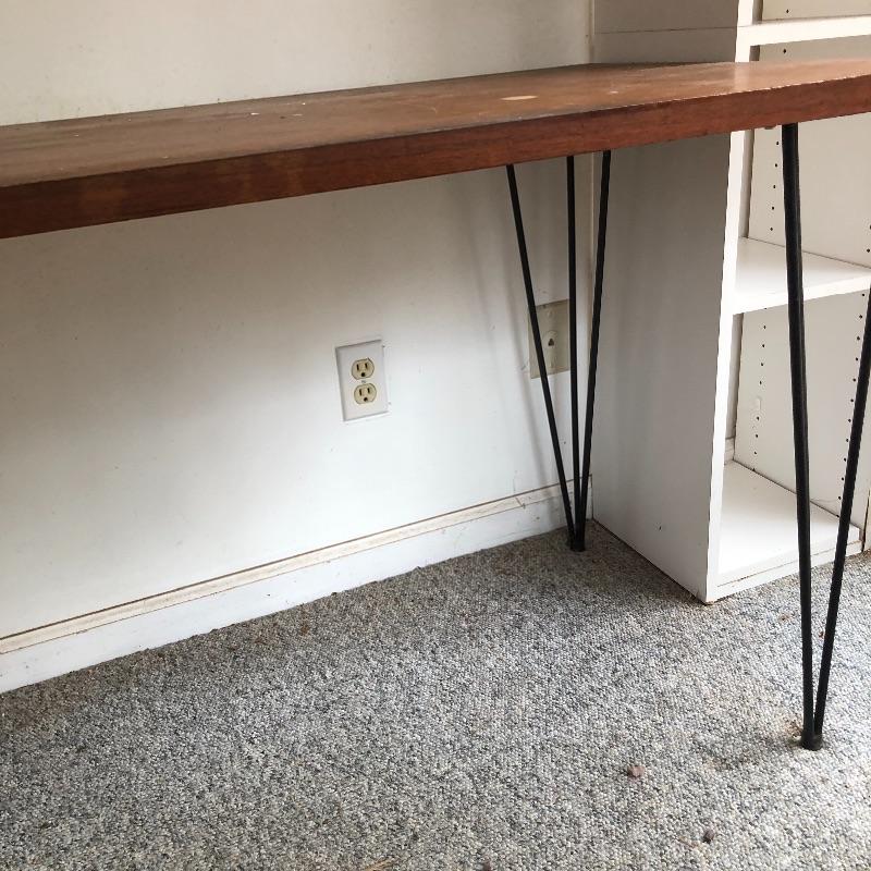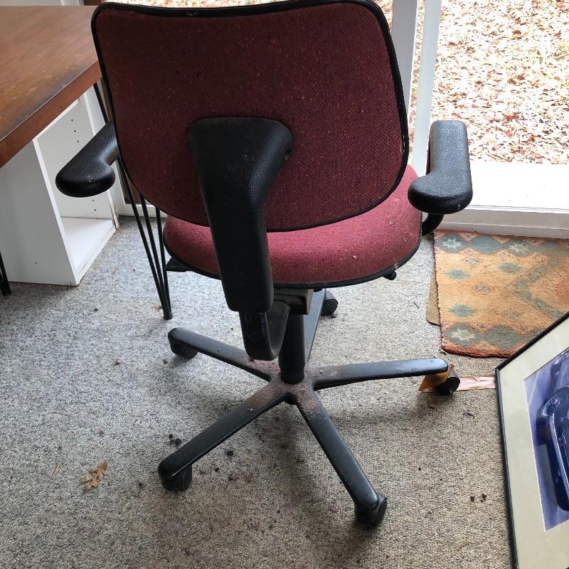 This stylish desk has some wear and tear but would be worth fixing. It’s black metal legs give it a MCM look. The wood surface does have some scratches and marks shown in images and one leg is missing a screw. We have accompanied it with a red fabric office chair.