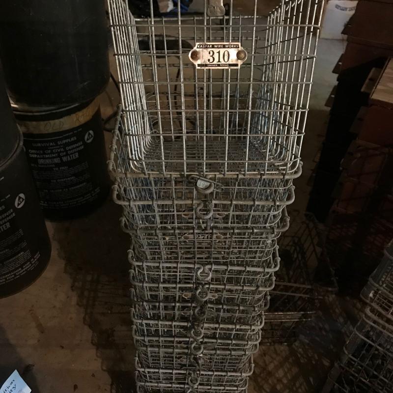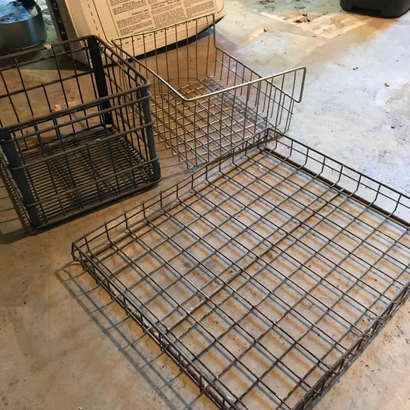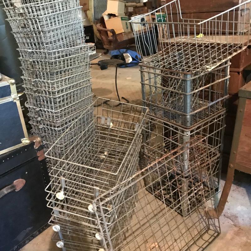 Wire baskets in lots of different shapes and sizes. Some are milk carton shape or larger but the majority are 13” x 9” x 10” and can be hung on wall. See photos. Not shipping. Local pick up only.
