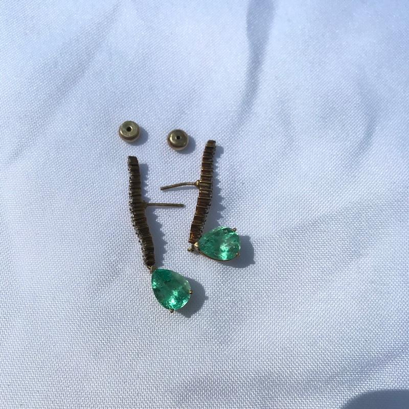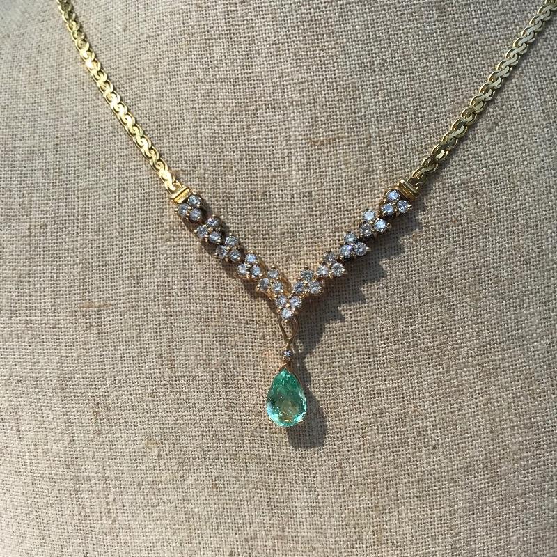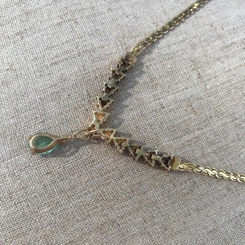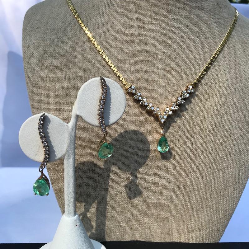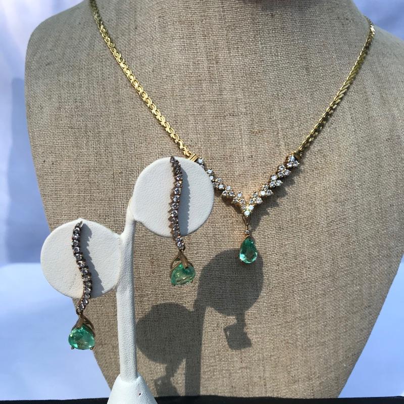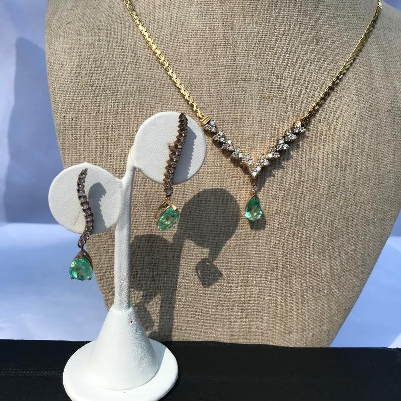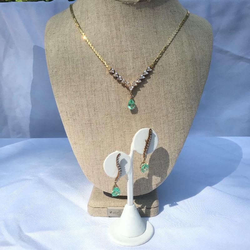 Attractive set to make a statement. Diamonds test positive and necklace and earrings backs marked 14K, we did not find markings on earrings, although diamonds also registered positive. Both earrings and necklace feature a light yet bright green stone similar to a green fluorite centerpiece. Starting price based on melt value of gold. Shipping available.