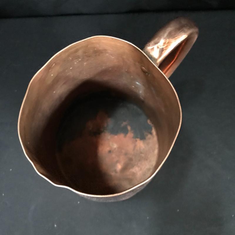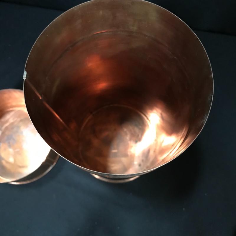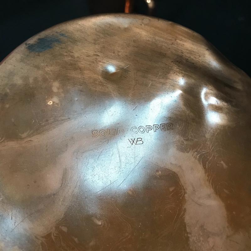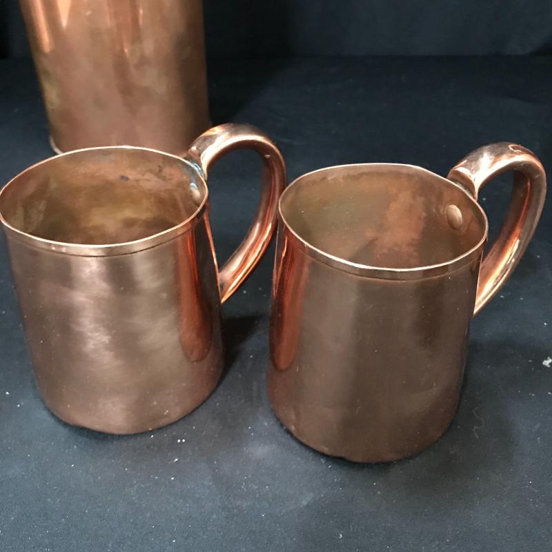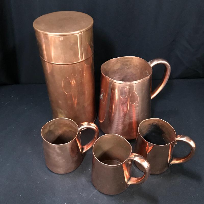 Lidded canister is approx. 10.5” tall. Lid is tight and hard to remove. Pitcher is approx. 6.5” tall. Cups are approx. 4” tall. Pitcher and cups match. Markings read “Solid Copper WB.” Shipping available or local pickup in Asheville, NC.