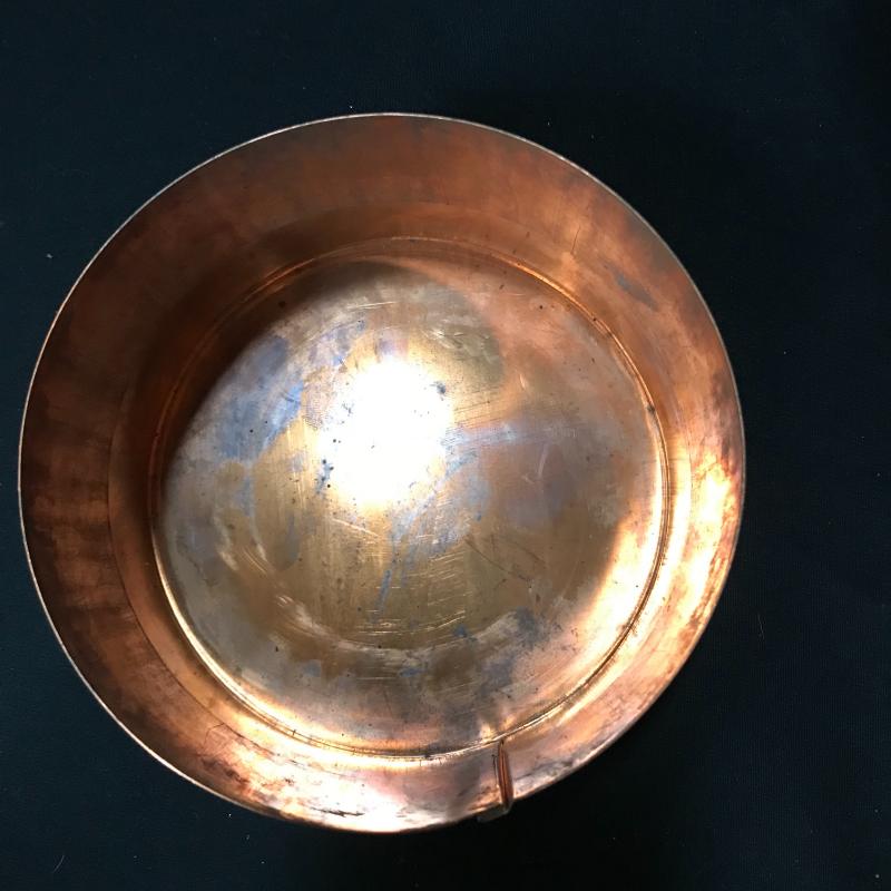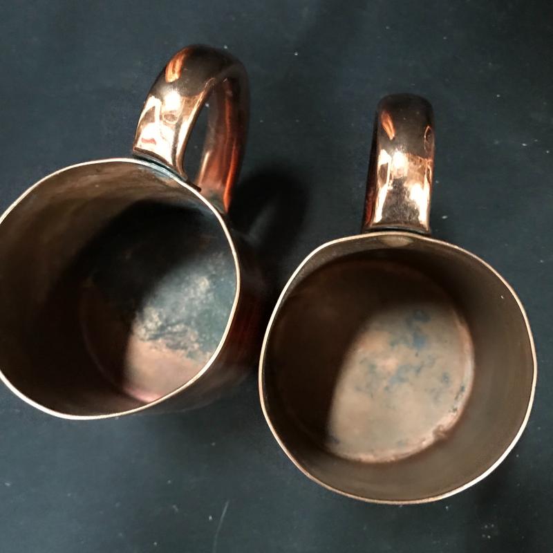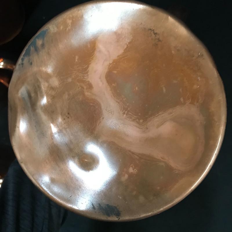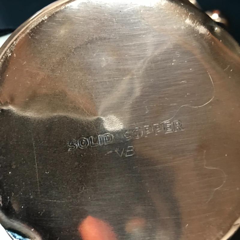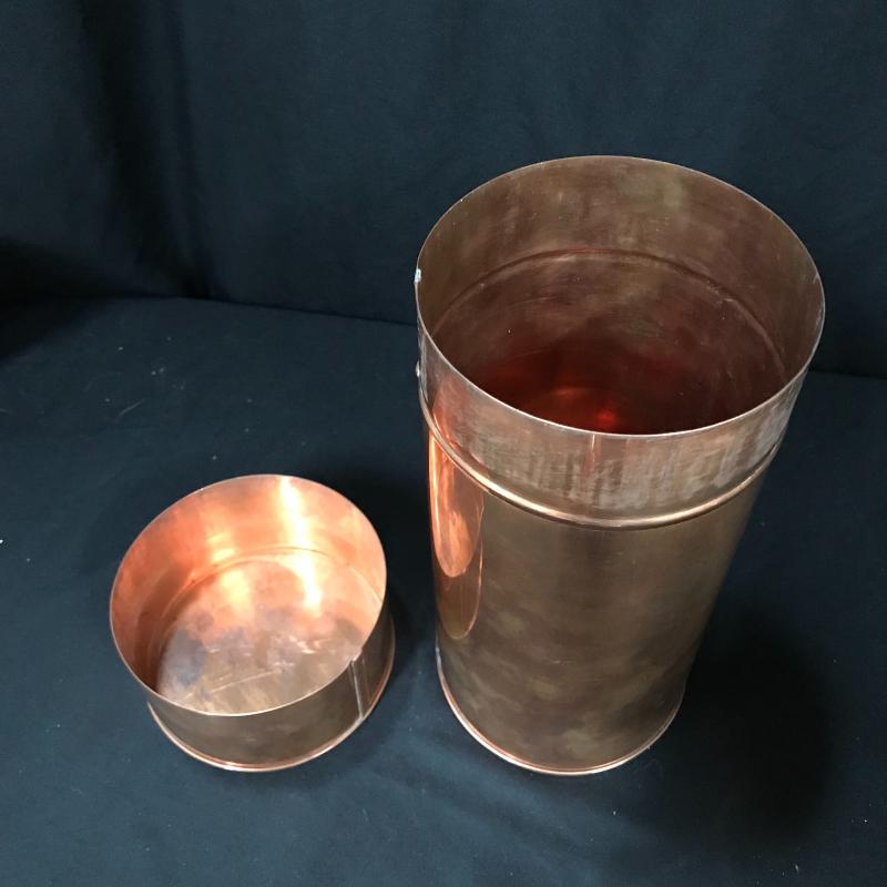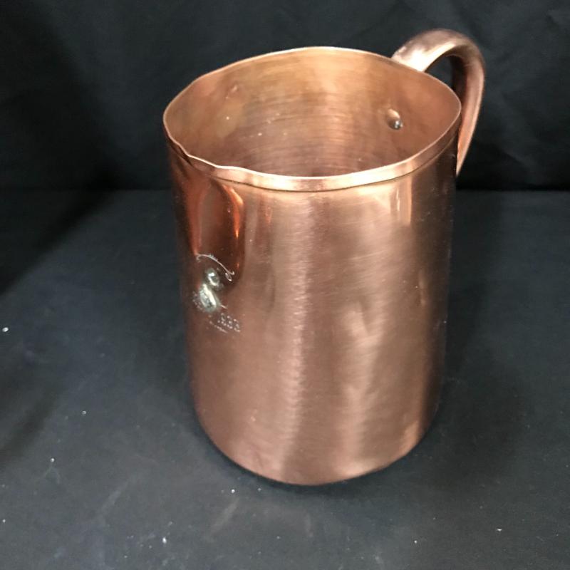 Lidded canister is approx. 10.5” tall. Lid is tight and hard to remove. Pitcher is approx. 6.5” tall. Cups are approx. 4” tall. Pitcher and cups match. Markings read “Solid Copper WB.” Shipping available or local pickup in Asheville, NC.