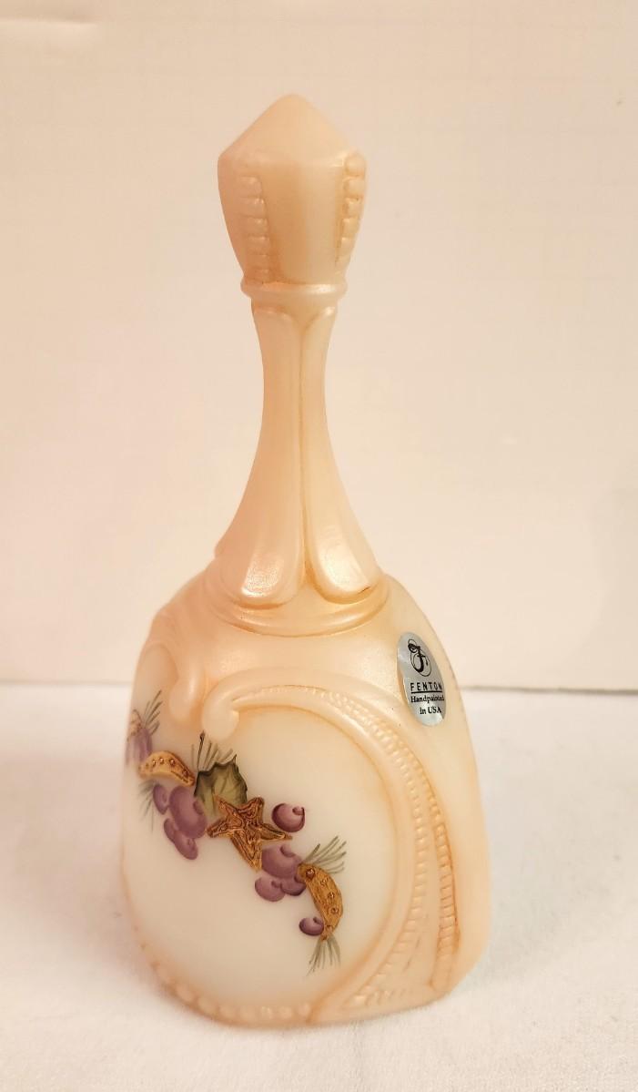 Fenton Art Glass Bell, Cream Satin glaze, 7" tall, heavy. Has label, signed, hand painted.