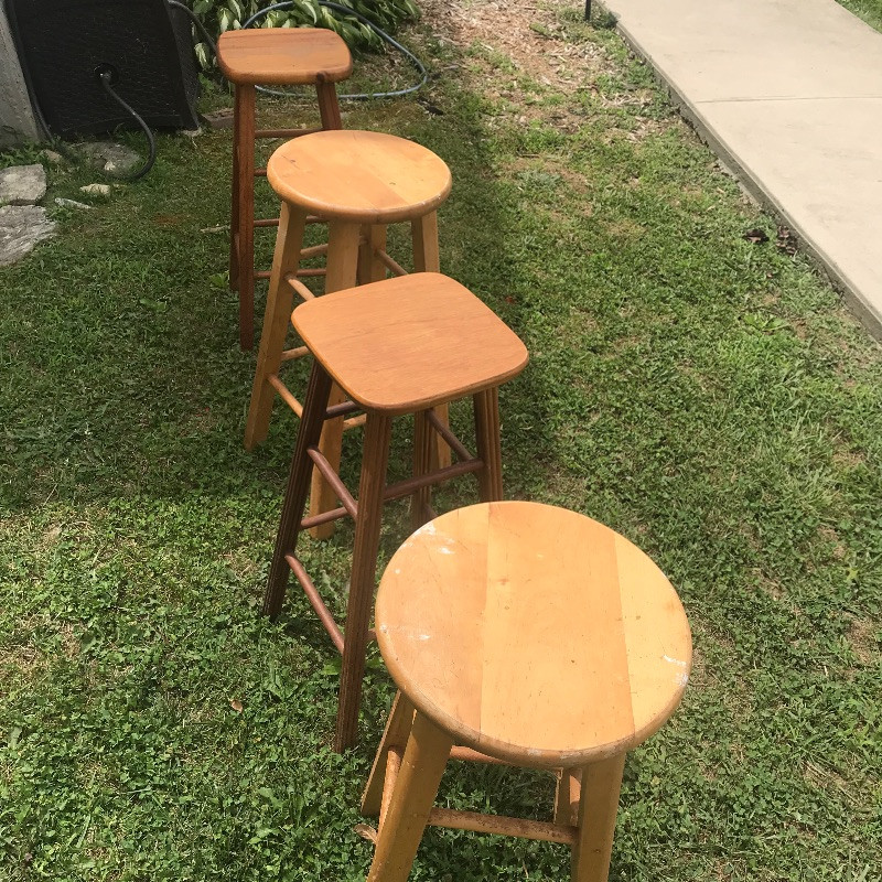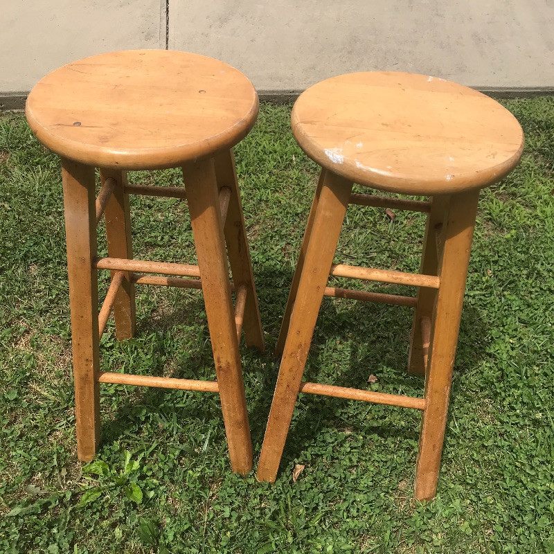 This collection of two round wood stools and two square wood stools is perfect for a shop, bar space or even kitchen. The two round ones match and the two square ones are similar but do not match. All are 29” tall and need to be cleaned up or even have a fresh new paint color. All are sturdy and in good condition otherwise. Local pick up only.