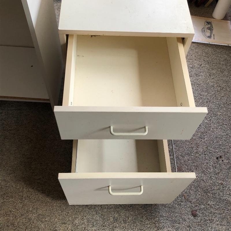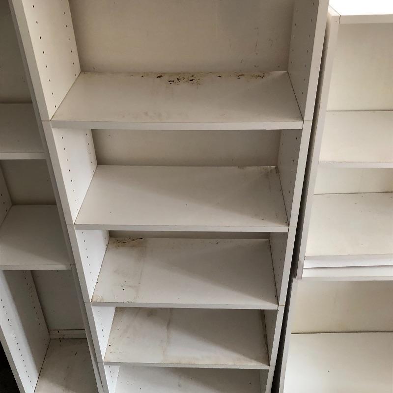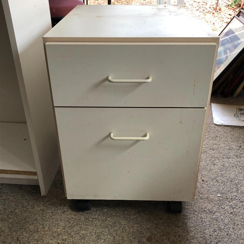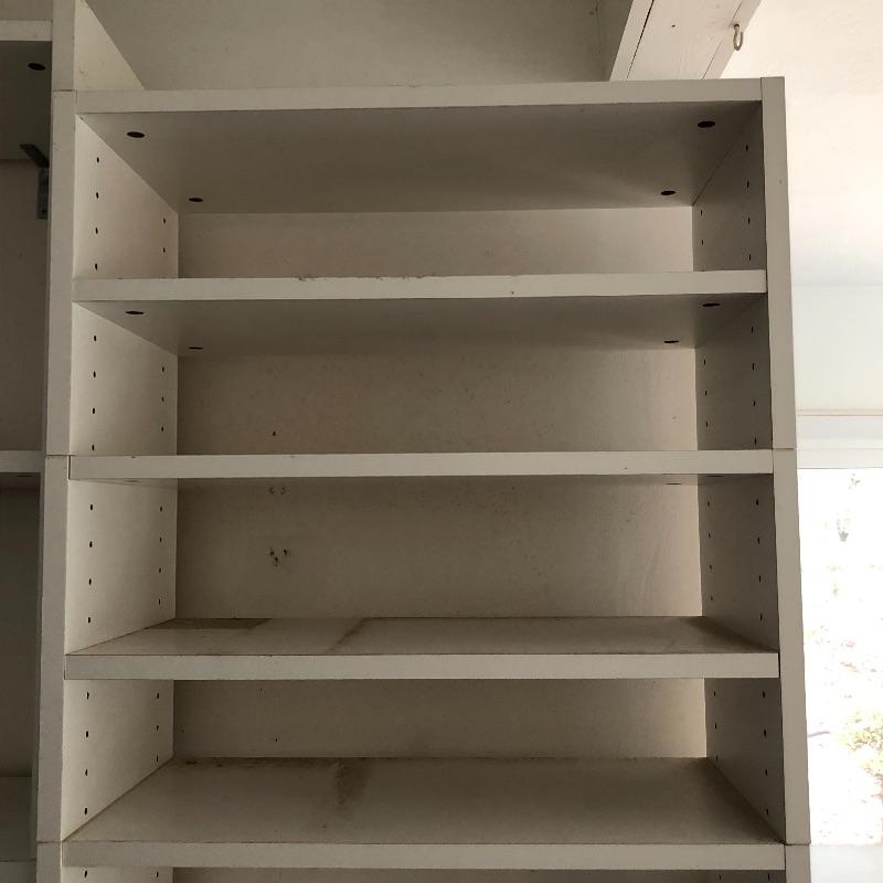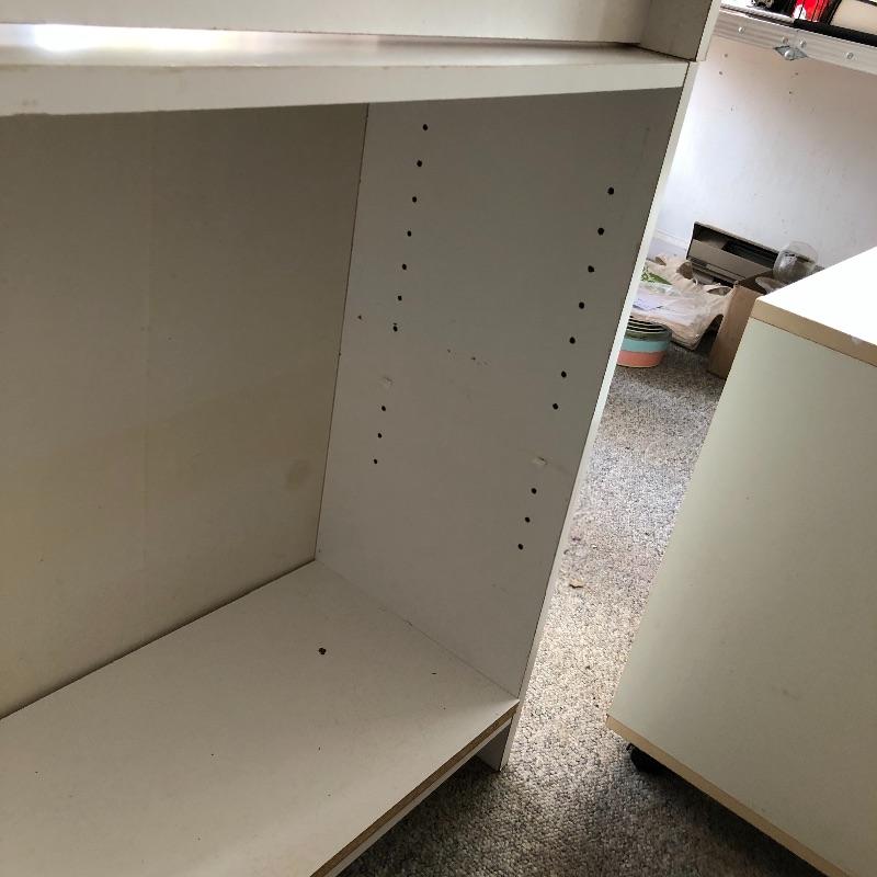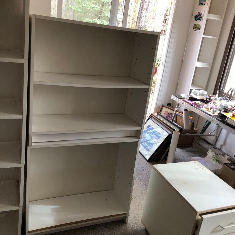 3 sets of white storage shelves and an off white filing cabinet are in this lot. The pressed wood file cabinet comes with one file drawer and a smaller top drawer. Of the 3 shelf units, the 2 pictured to the right, are shorter and can be stacked or placed separately, they can also have shelves added to them. The taller unit contains 9 shelves and measures 11.5” deep x 25” wide x 85” tall. The 2 smaller units each measure 11.5” deep x 30” wide x 28.5” tall. Note a 5th unit shown partially on the left in the main image is not included.