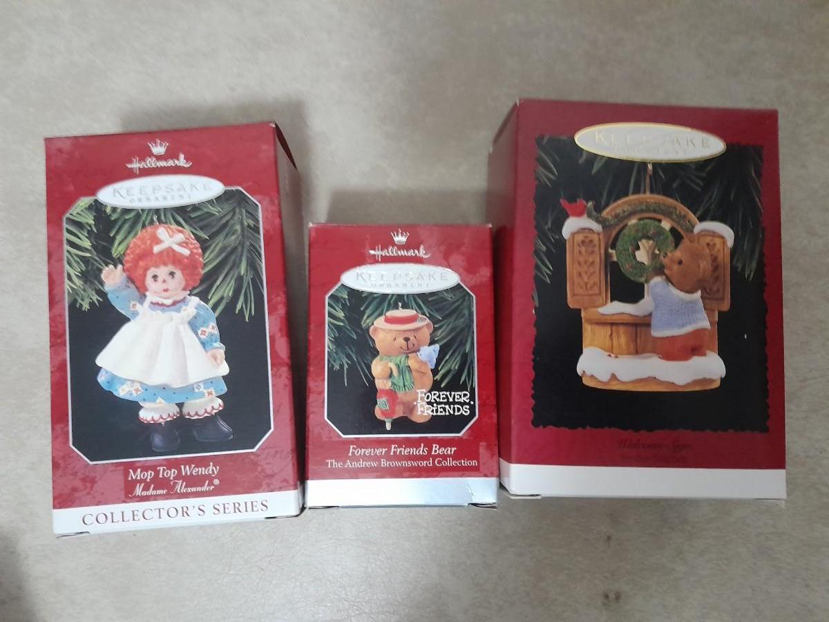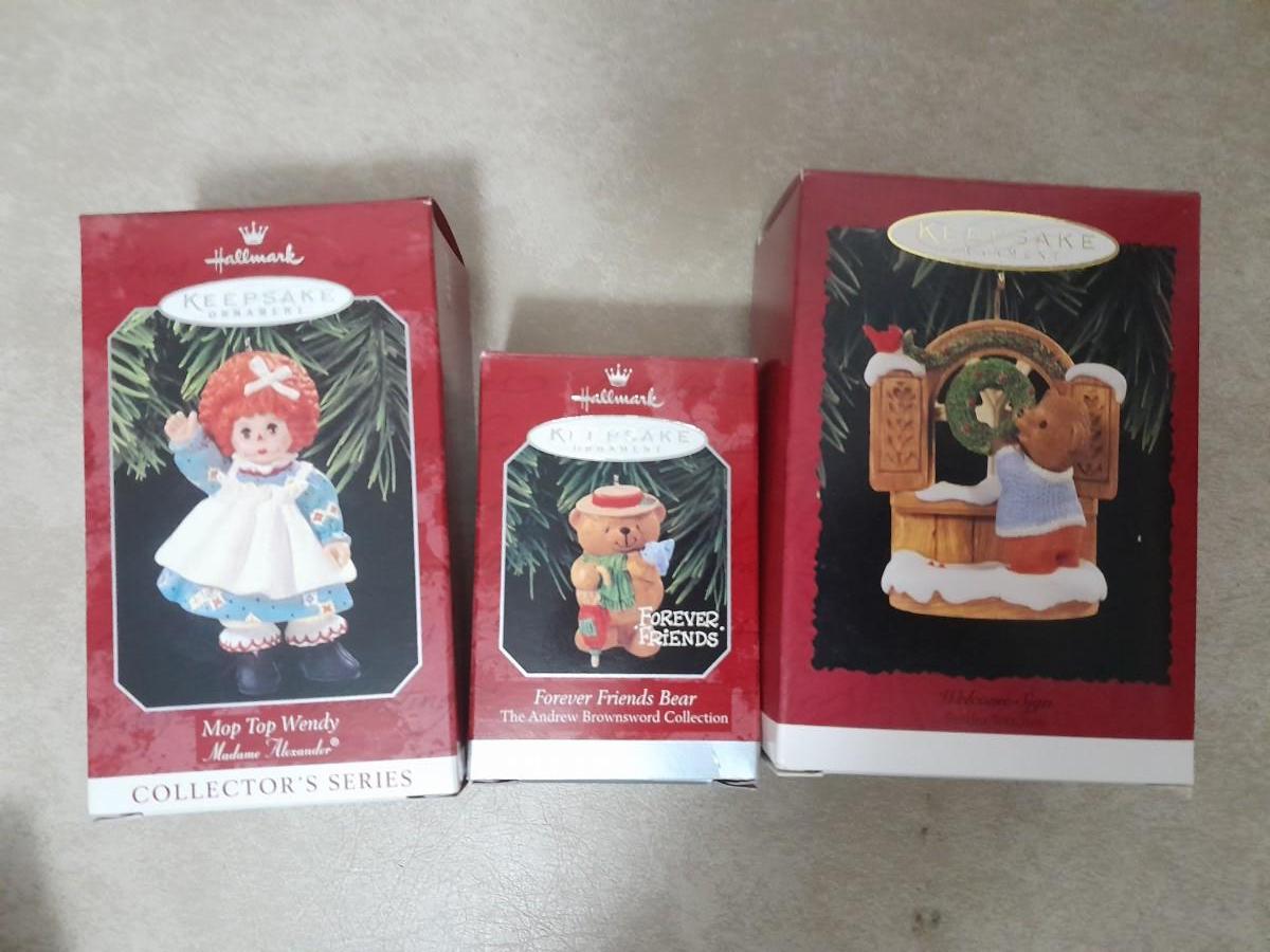 HALLMARK CHRISTMAS ORNAMENTS MOP TOP WENDY, FRIENDS BEAR & WELCOME SIGN