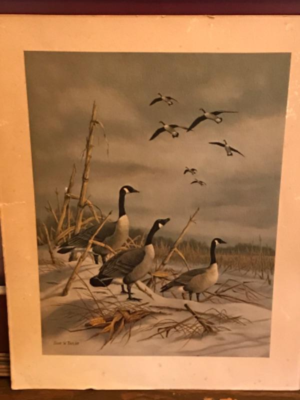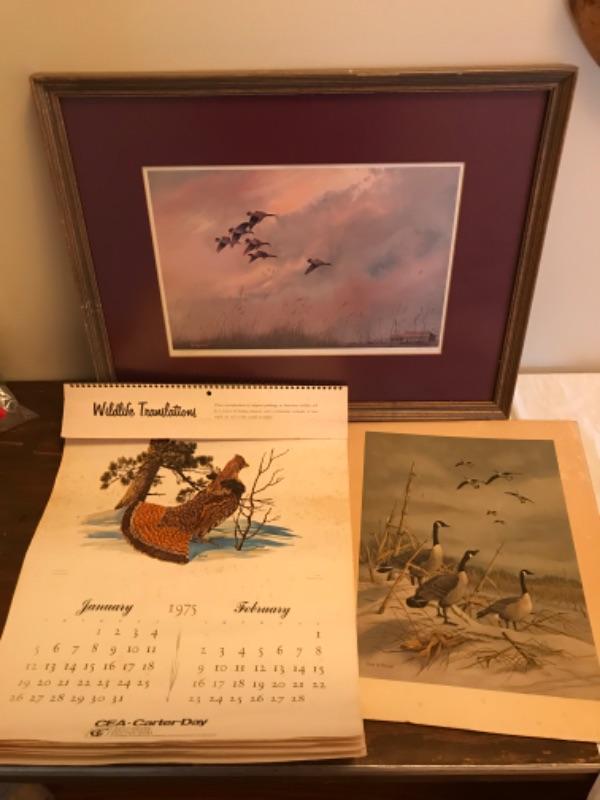 Framed Herb Jones print signed, I framed John W Taylor signed print and a 1975 Wildlife calendar