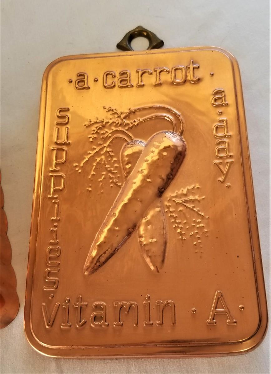 Three nice decorative copper molds - Fish, Wheat, Carrot. Each measures about 10" x 7". Good condition.