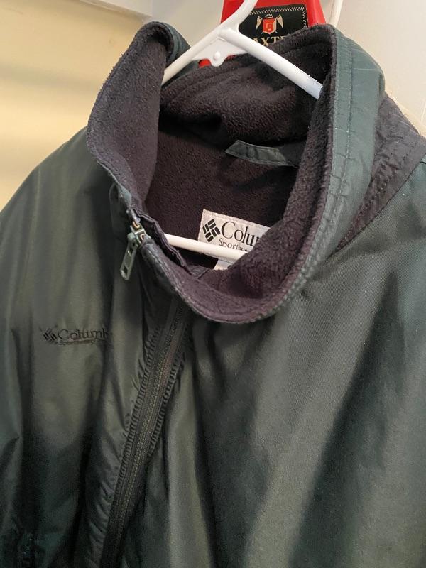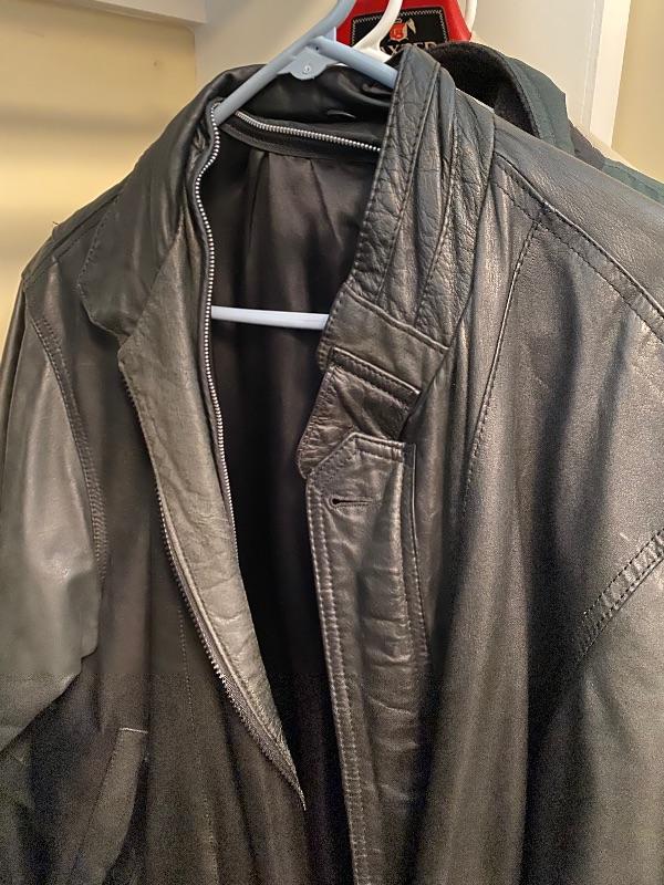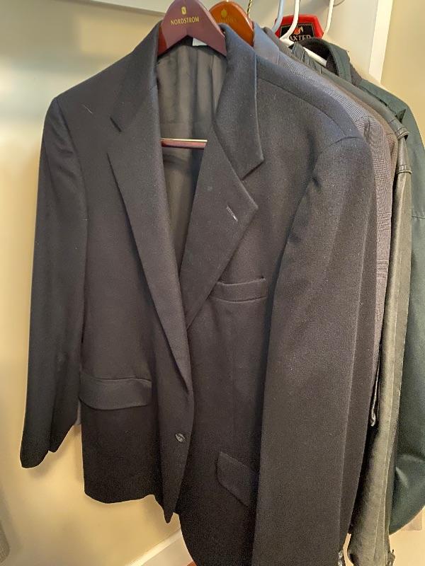Lot of several dress coats measuring 42 inches long and suits one Kashmir John Nordstrom, one leather jacket, size large Columbia sport jacket all in good condition