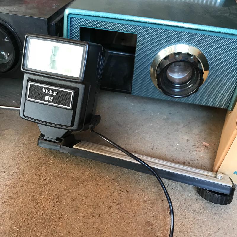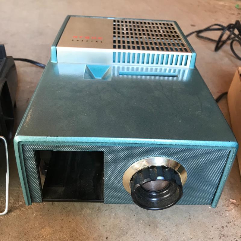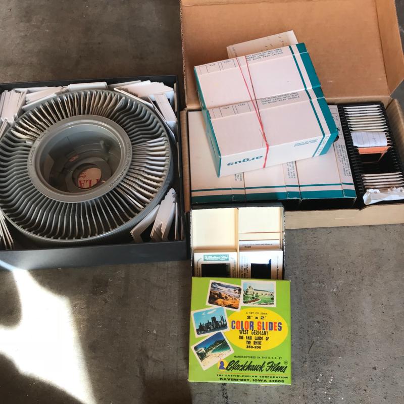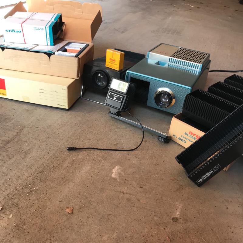 For your viewing pleasure! Two slide projectors- Argus Special and Balmite 50, a Vivitar light and Kodak slide wheel. Lots of cases for storage and even some vintage slides included. Condition and content of slides unknown. See photos for entire inventory. No shipping.