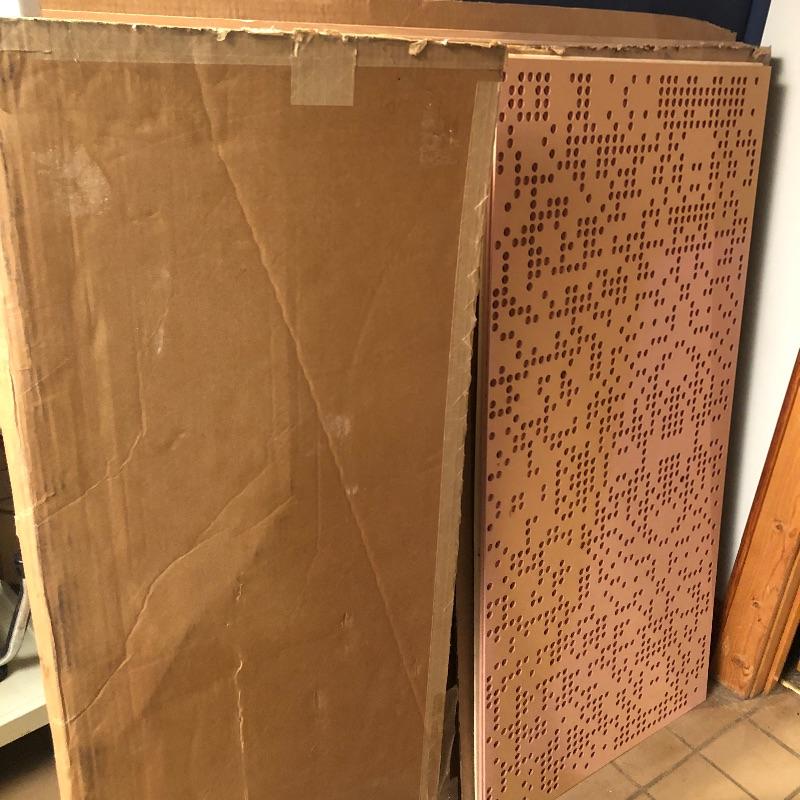 Box of sound diffusing panels. Some have been cut in half sized pieces however there are still 2 full sized panels of the pink panels, and 2 full sized panels of plain colored solid in the original box. Half panels measure 24” x 48”. Local pickup only.