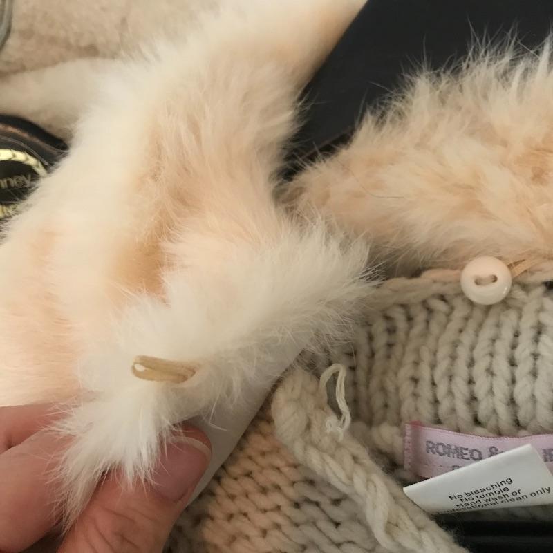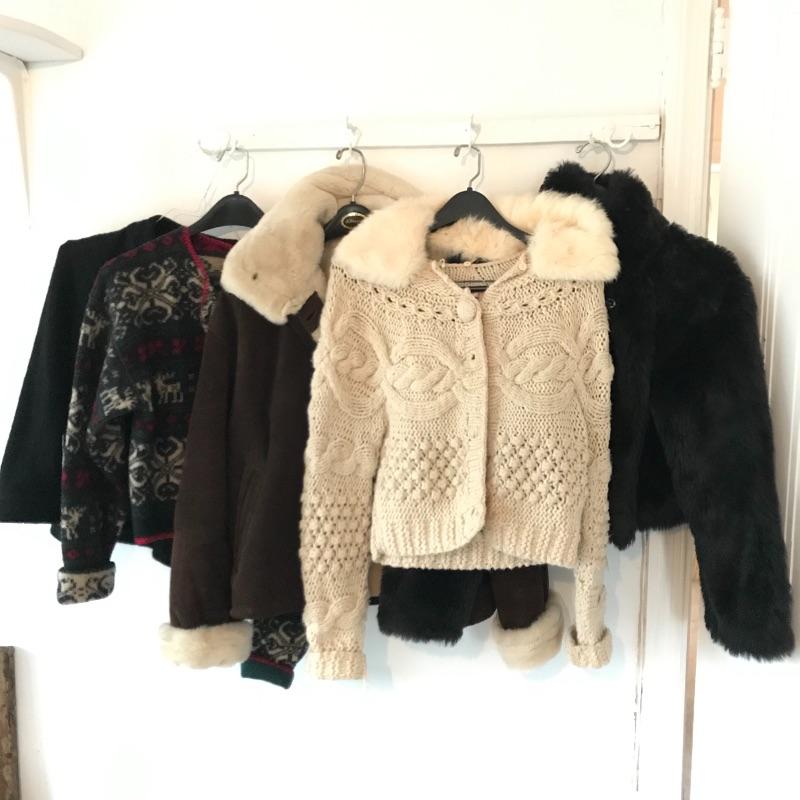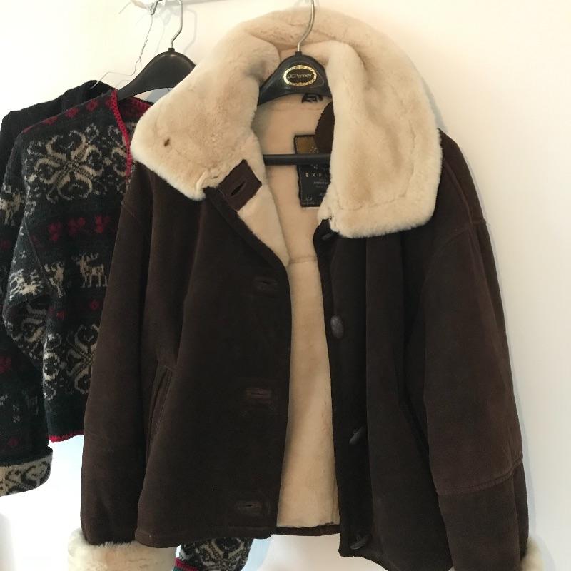 Beautiful and classy collection of womens’ small and medium sized warm winter fashion! First is a beautiful knit ivory sweater with a removable rabbit fur collar. One button is missing from collar and sweater itself. Next, a black faux fur evening coat. The gem of the lot is a brown leather and soft acrylic fur lined Express jacket. Lastly, two 100% wool coats, the Alps coat is missing its top button, but otherwise both in very nice shape. There are some blemishes noted in photos, it is unclear whether professional cleaning would fix, see photos. No shipping.