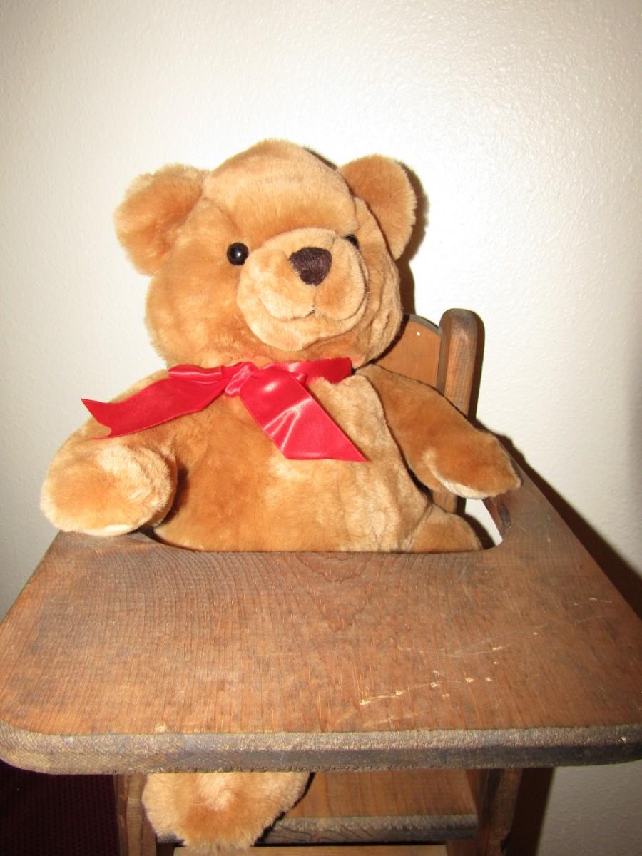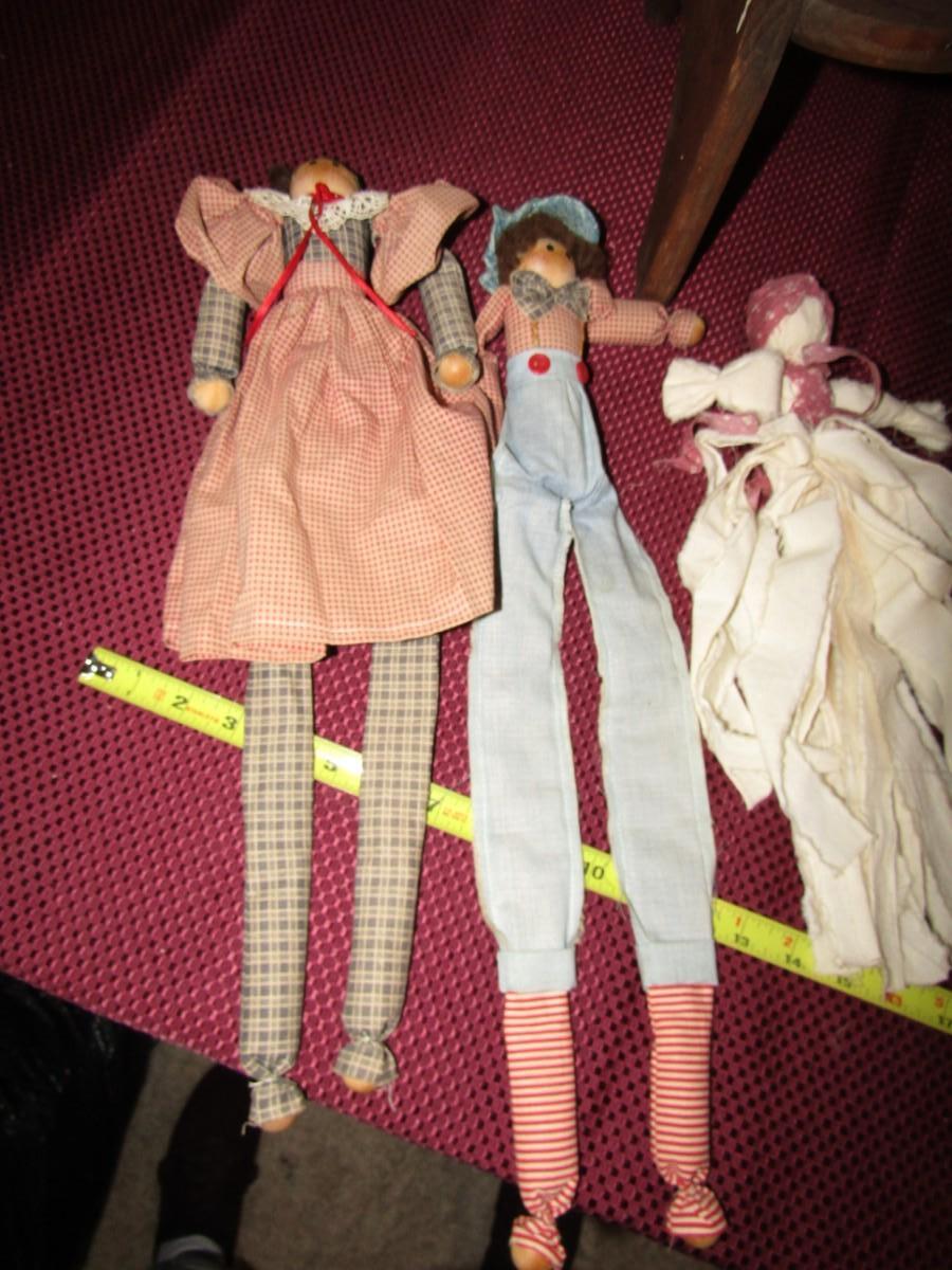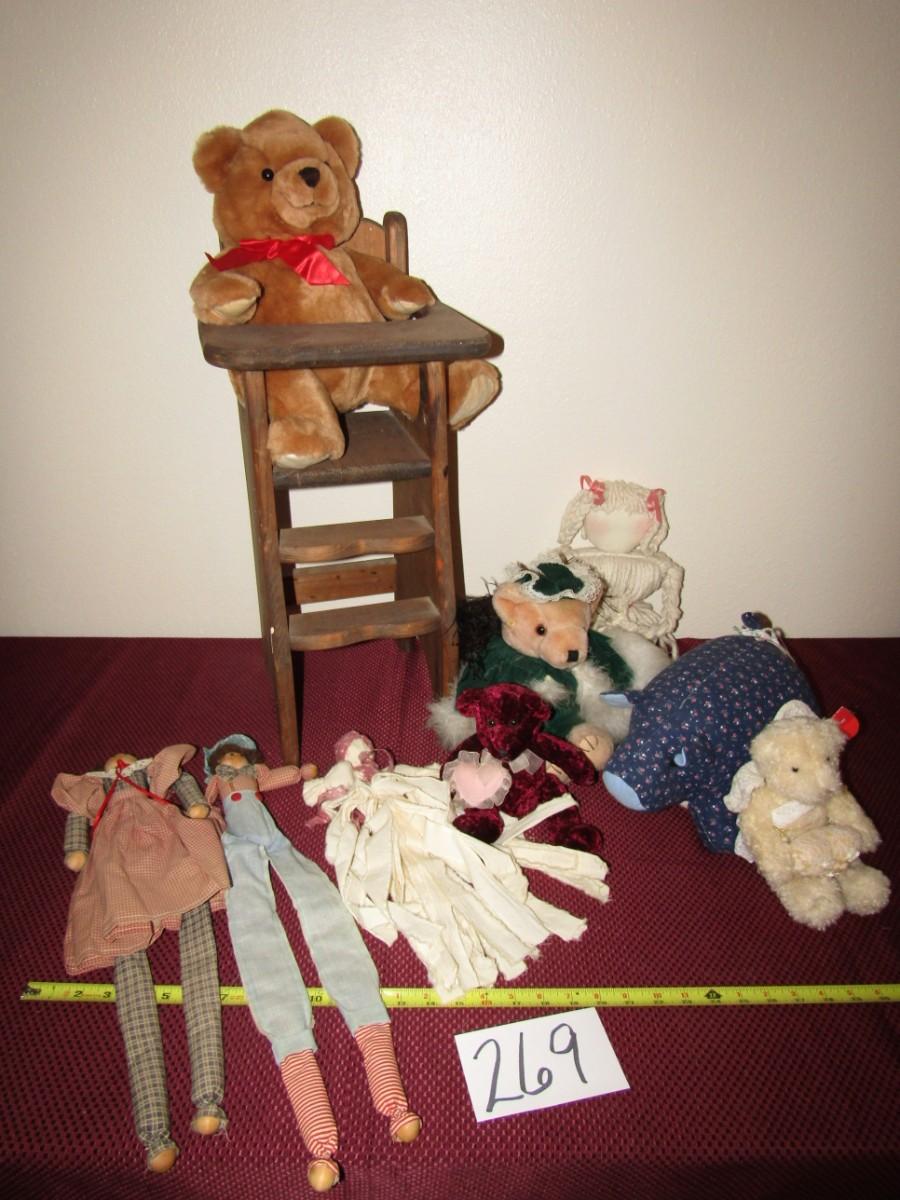 WOODEN DOLL HIGH CHAIR, STUFFED ANIMALS AND A COUPLE OLDER DOLLS.