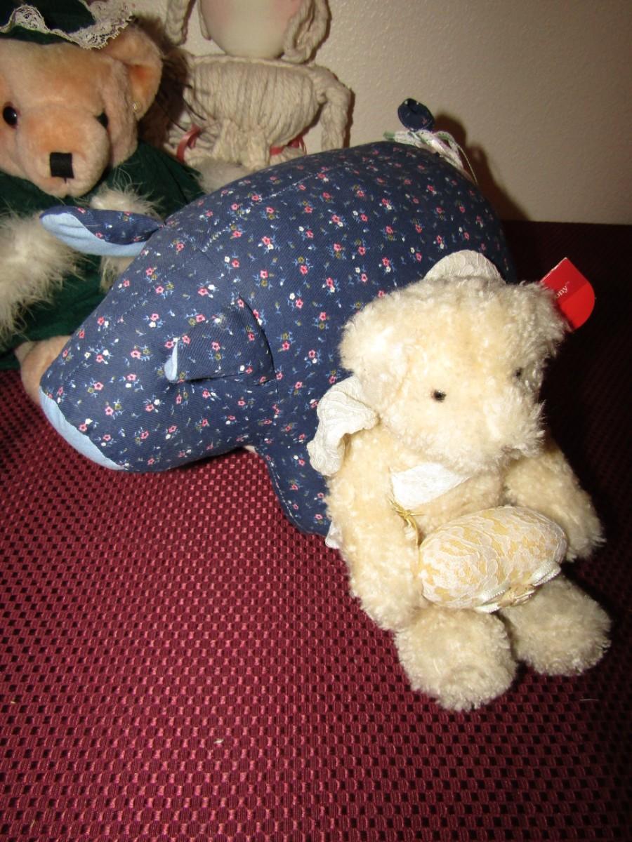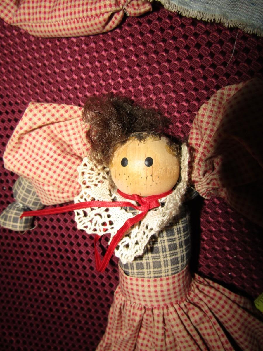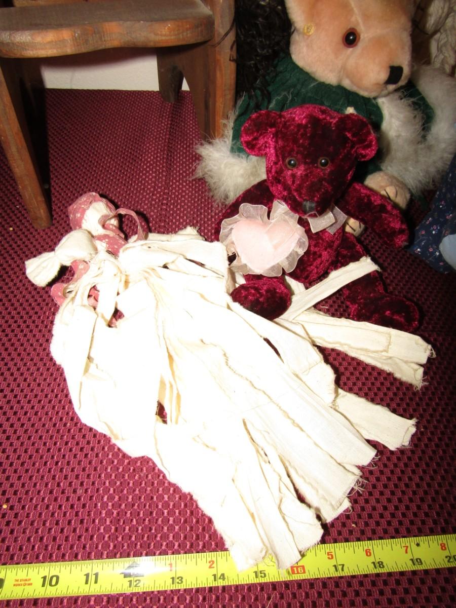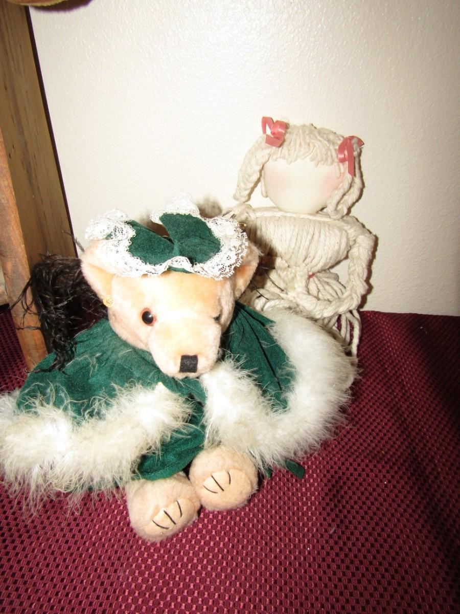WOODEN DOLL HIGH CHAIR, STUFFED ANIMALS AND A COUPLE OLDER DOLLS.