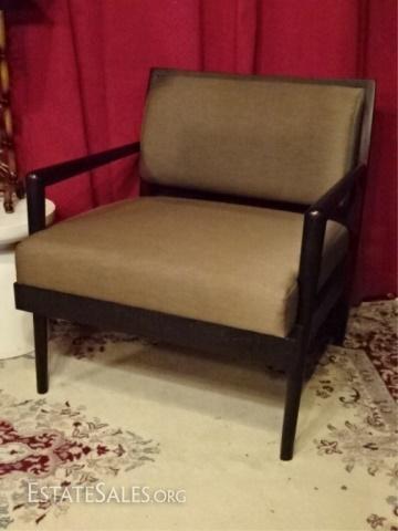 LOT 26C: PAIR MID CENTURY MODERN ARMCHAIRS, BLACK ENAMEL WOOD FRAMES, TAUPE SILK UPHOLSTERY, VERY GOOD CONDITION WITH NO TEARS OR STAINS TO UPHOLSTERY, 30" X 28" X 20", SKU240