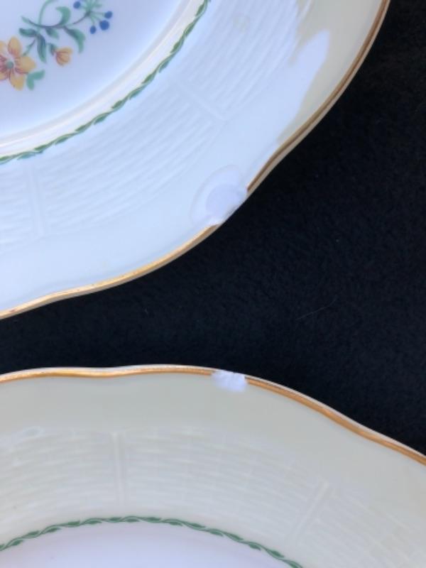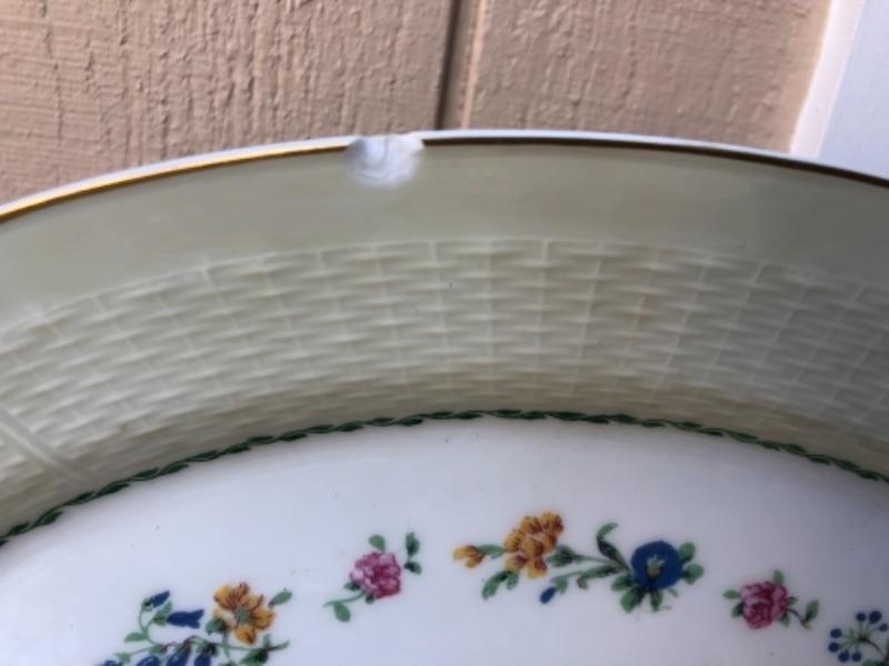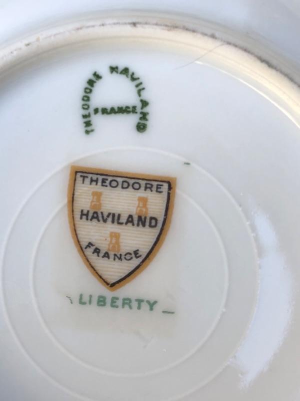 Lot 26P. Haviland China Liberty dinner set: 11 tea cups, 12 saucers, 12 small bowls, 12 soup bowls, 12 bread plates, 11 salad plates, 11 dinner plates, 3 serving platters various sizes, gravy boat, compote, veggie taurine, creamer & sugar, 1 odd saucer plate. Chips on three plates are shown in photos