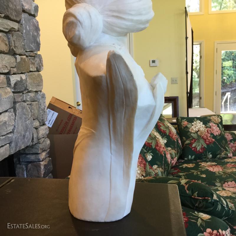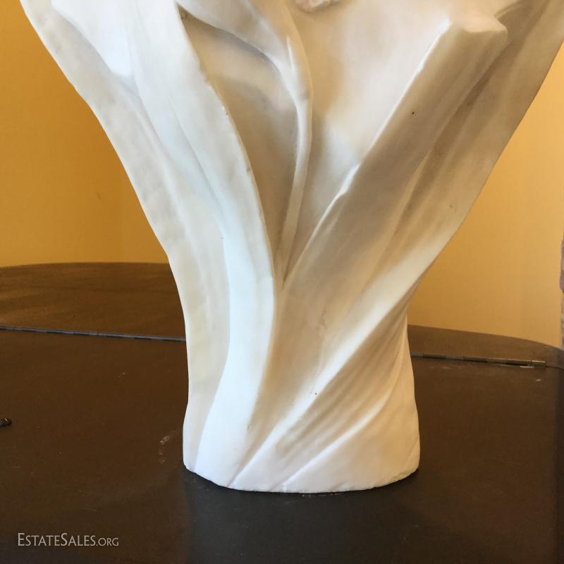 Ethereal young maiden sculpture carved of white marble. 13" L X 6" W X 22" H.