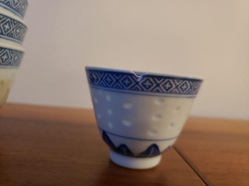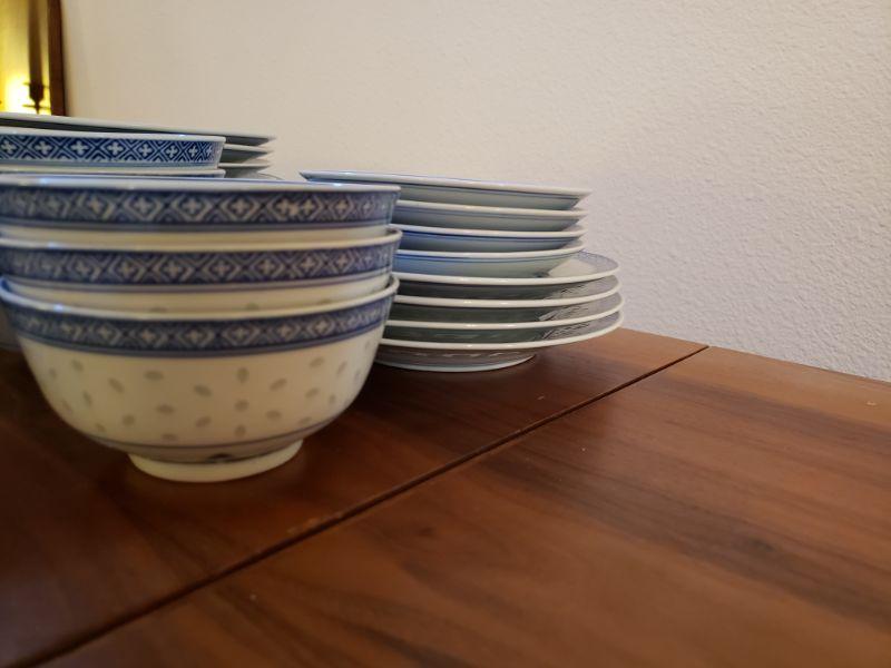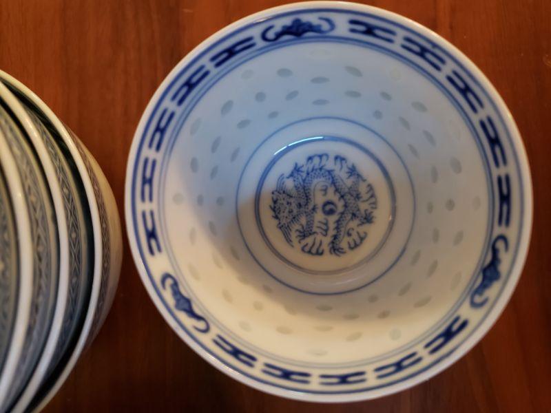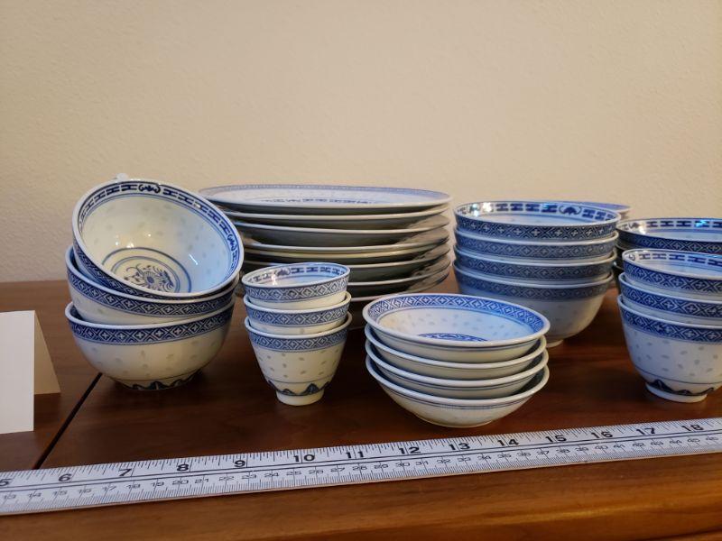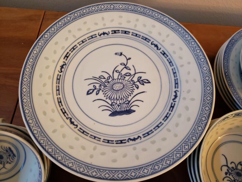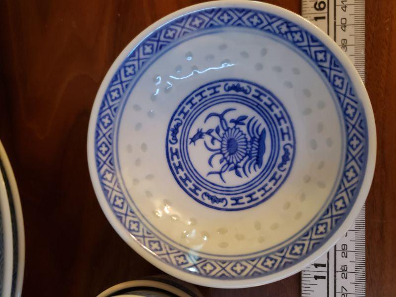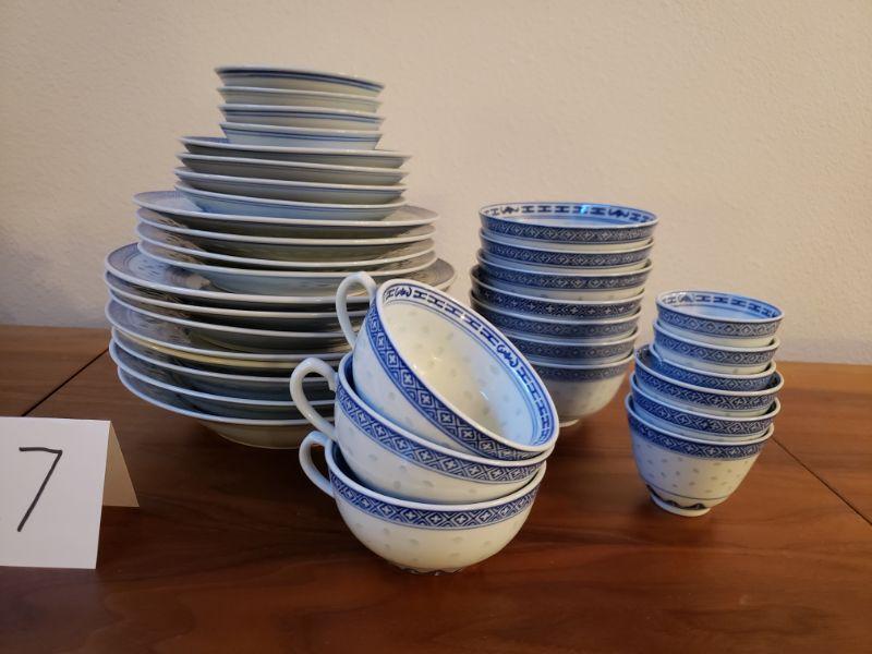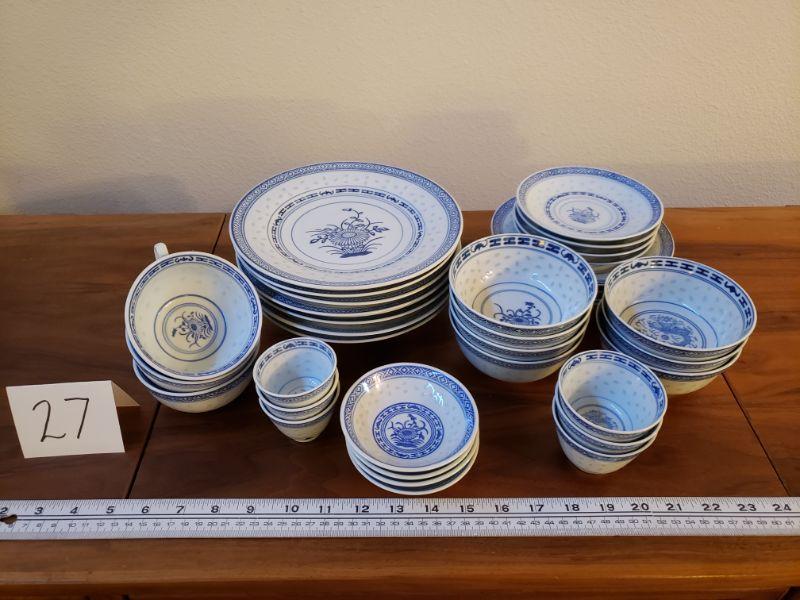 Lot 27: Jingdezhen China Rice Grain Blue & White - Flower & Dragon Porcelain Dish Set