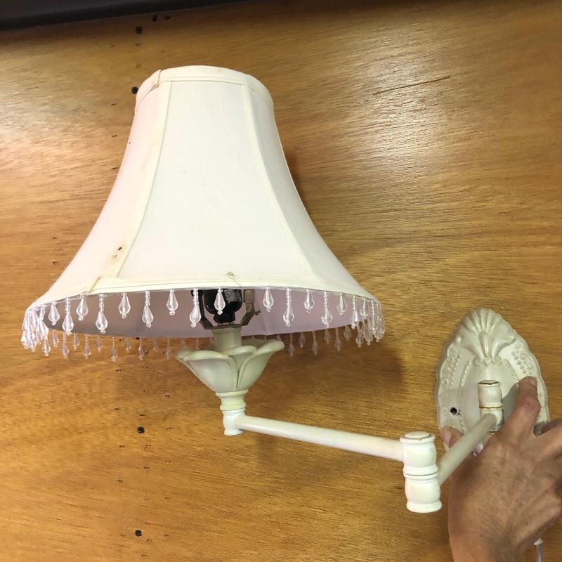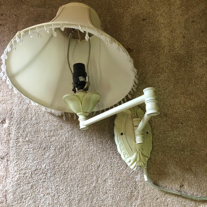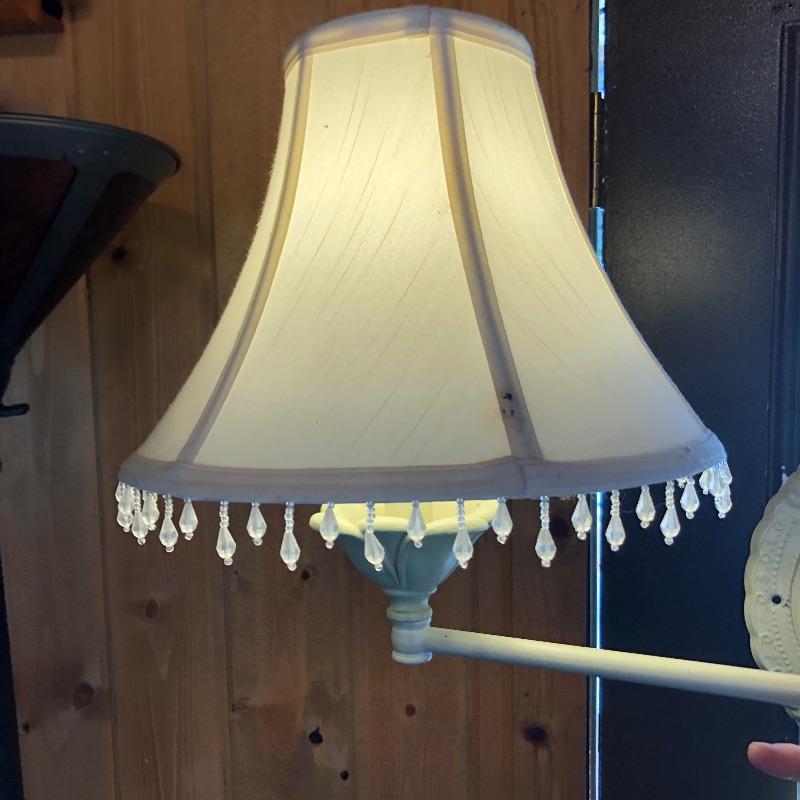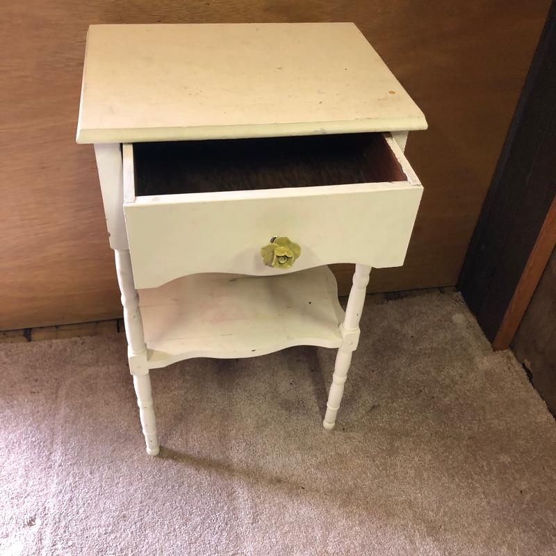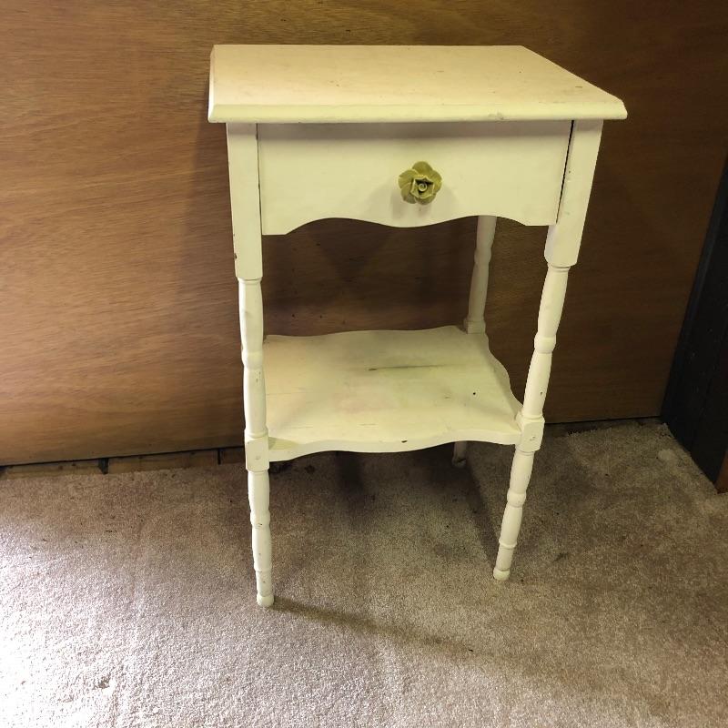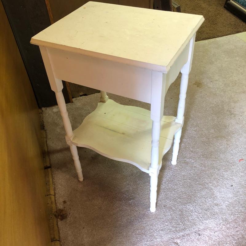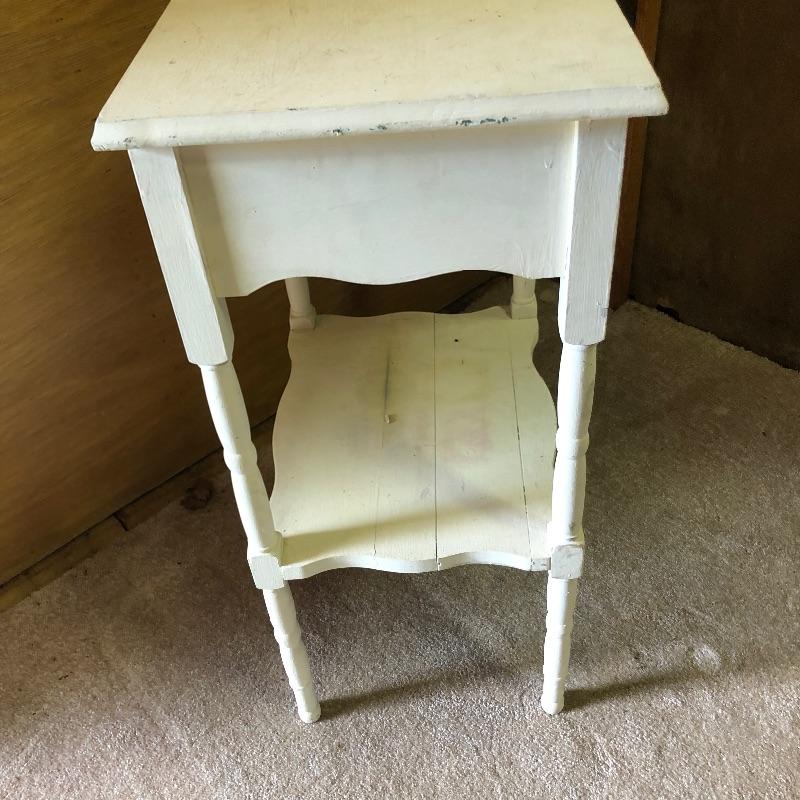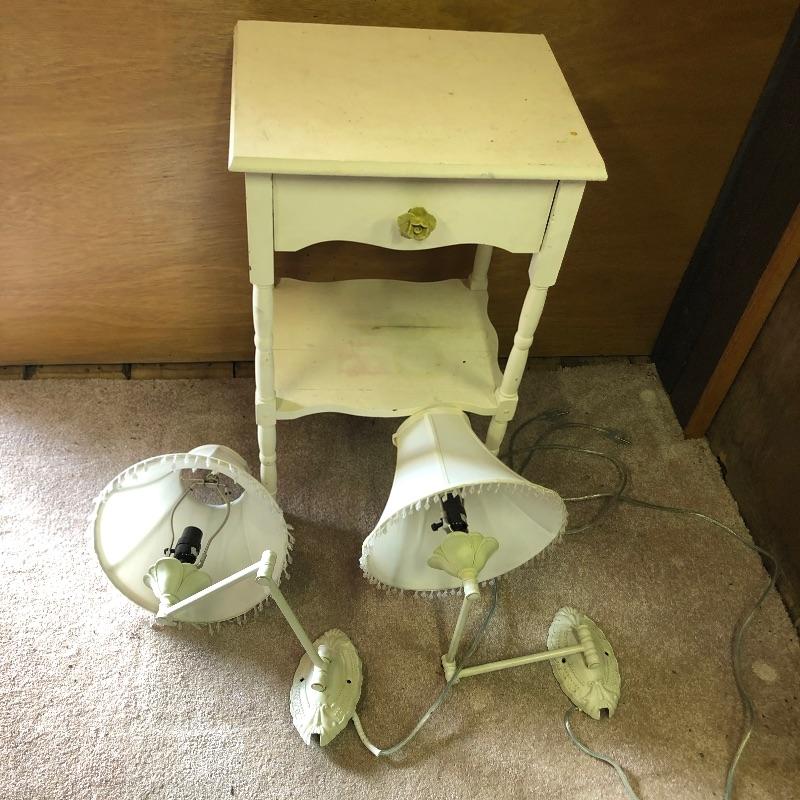 This vintage tall side table is a fine example of shabby chic. It is solid wood that has been painted white and it has a sweet ceramic rose for the pull of its one drawer. A pair of hinged, vintage wall lamps that compliment the table nicely, have been added to this lot. They are in great shape although the shades are possibly due to be retired and replaced.