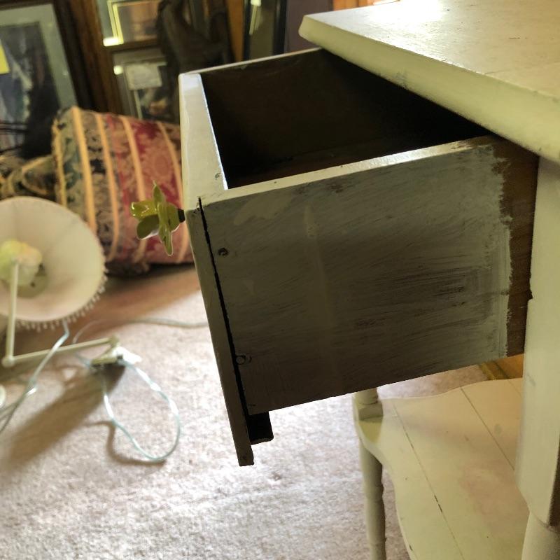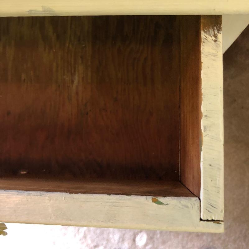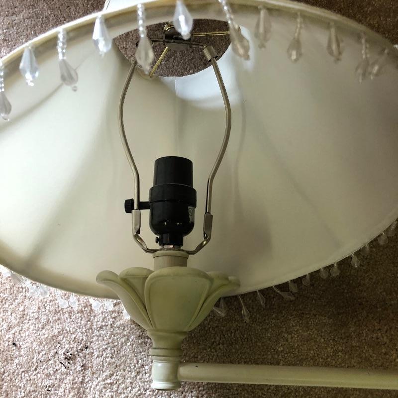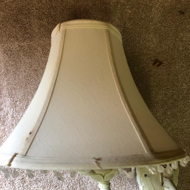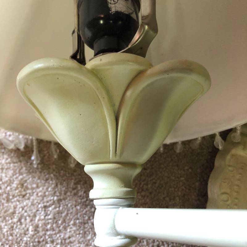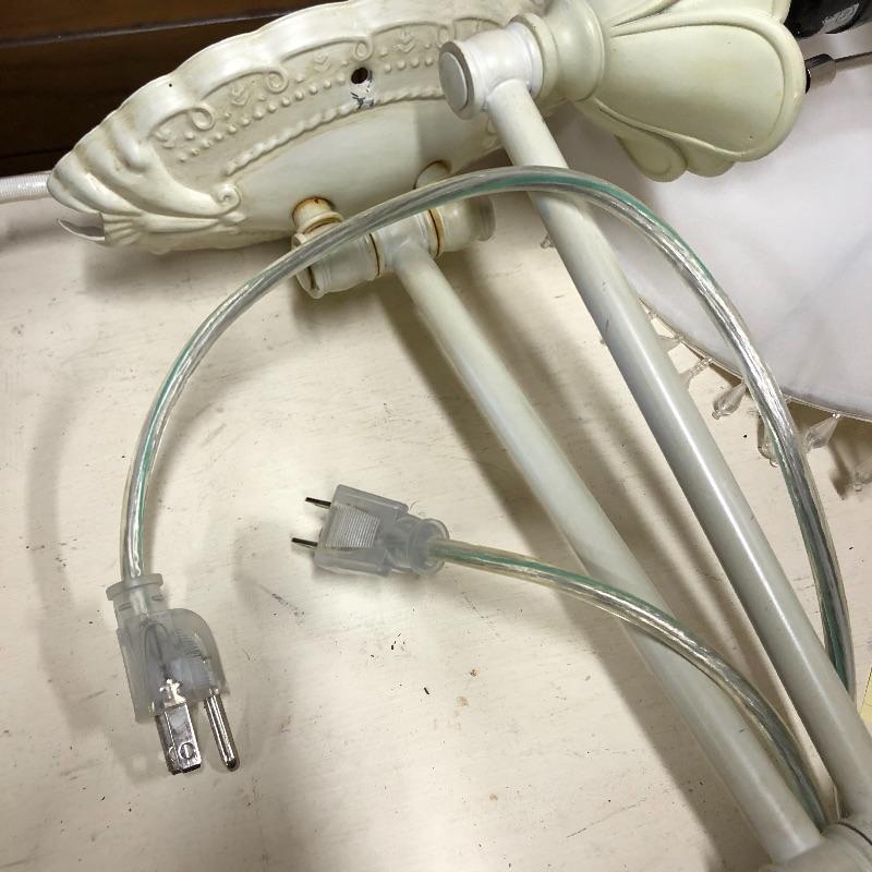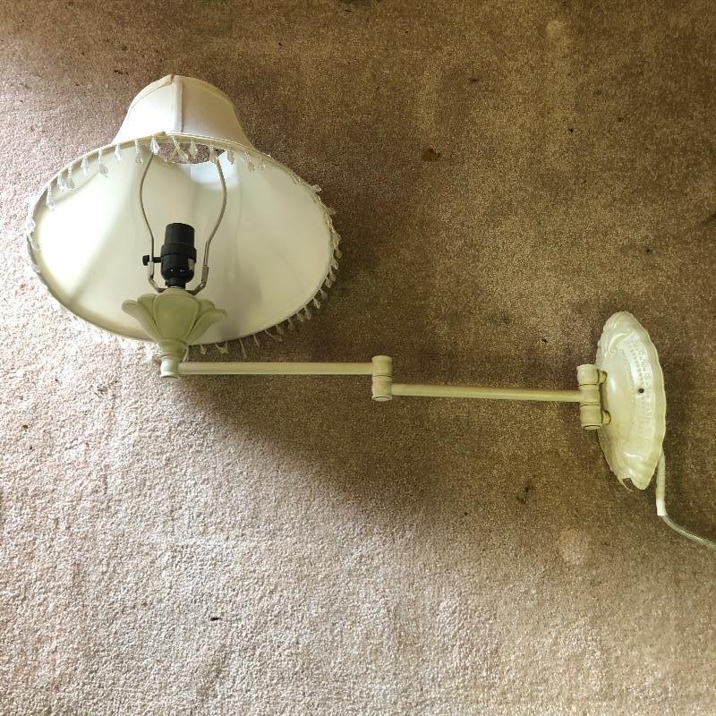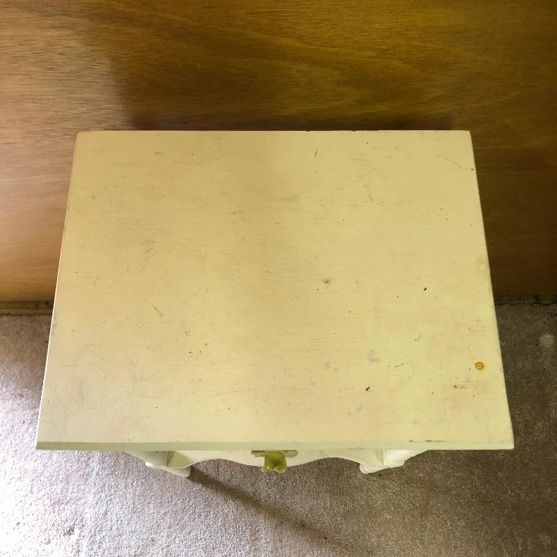 This vintage tall side table is a fine example of shabby chic. It is solid wood that has been painted white and it has a sweet ceramic rose for the pull of its one drawer. A pair of hinged, vintage wall lamps that compliment the table nicely, have been added to this lot. They are in great shape although the shades are possibly due to be retired and replaced.