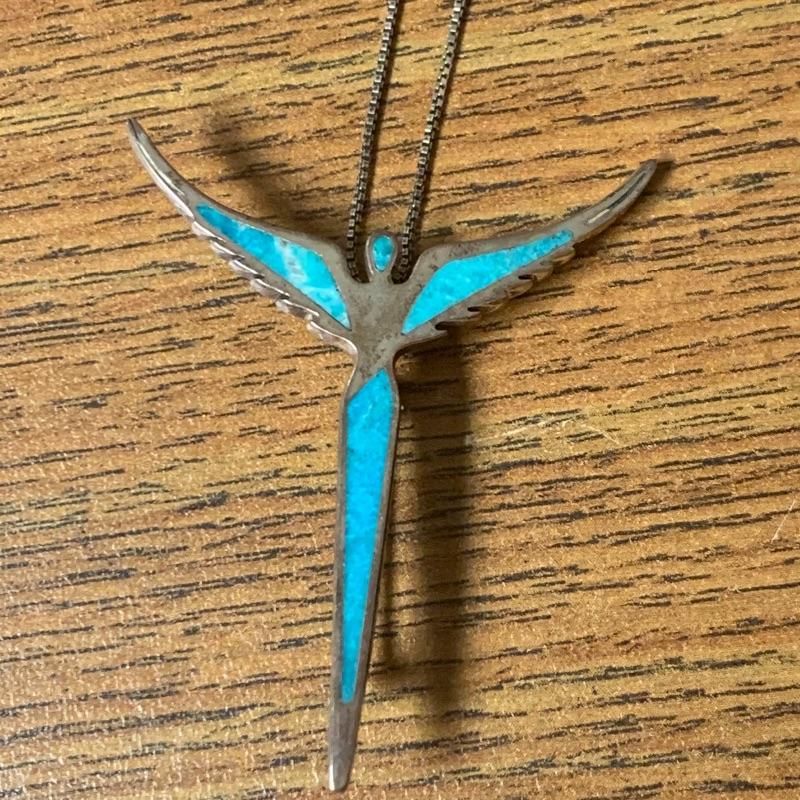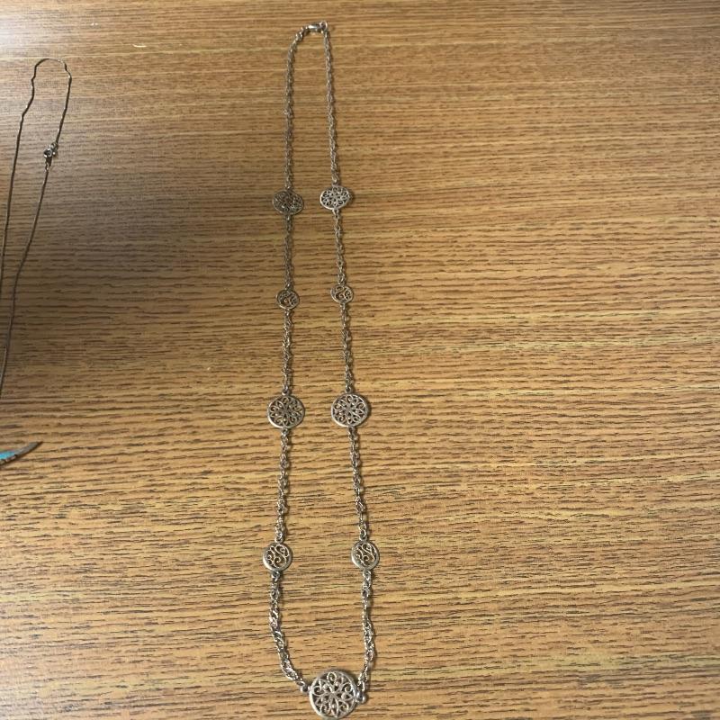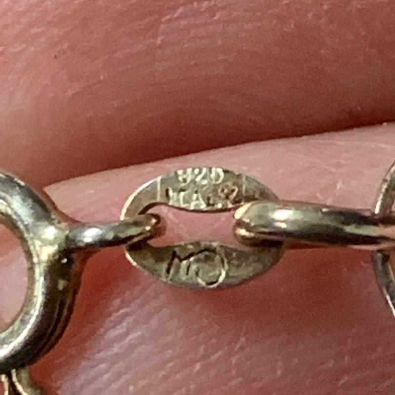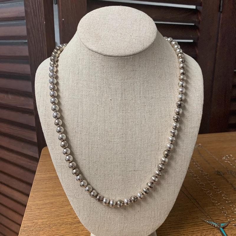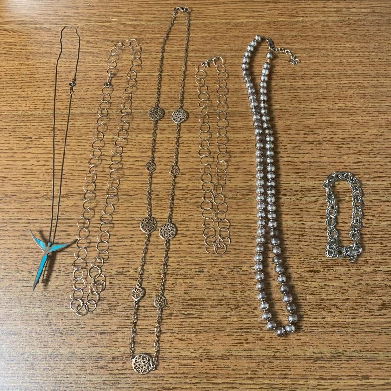 Lot includes five necklaces of 925 with one having beads and two matching but different lengths. A good Sterling bravely with heavy duty clasp. Also includes a Sterling and turquoise pin/pendant on a chain. This nice clean lot of silver is a great addition to any collection. Shipping available. Starting bid based on melt value.
