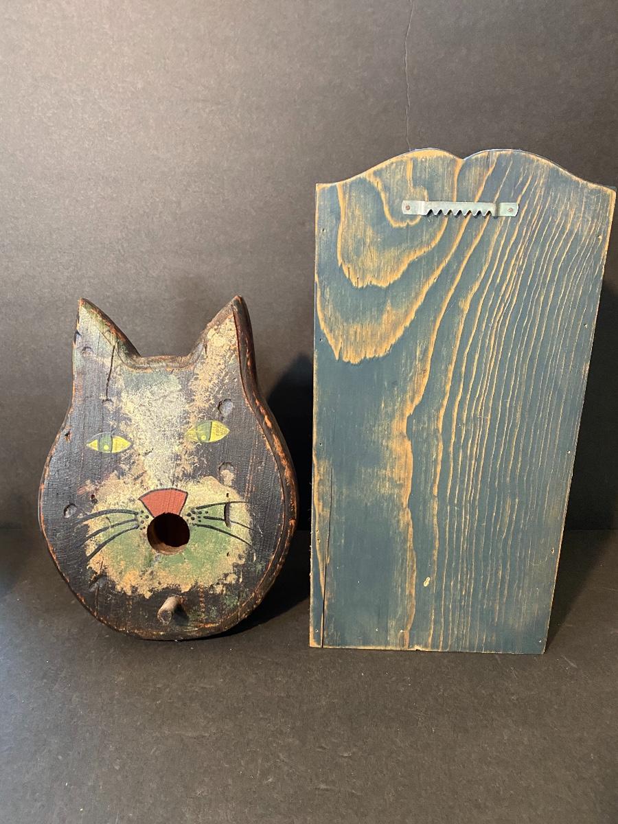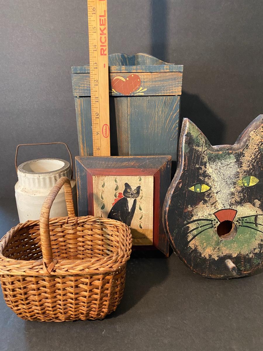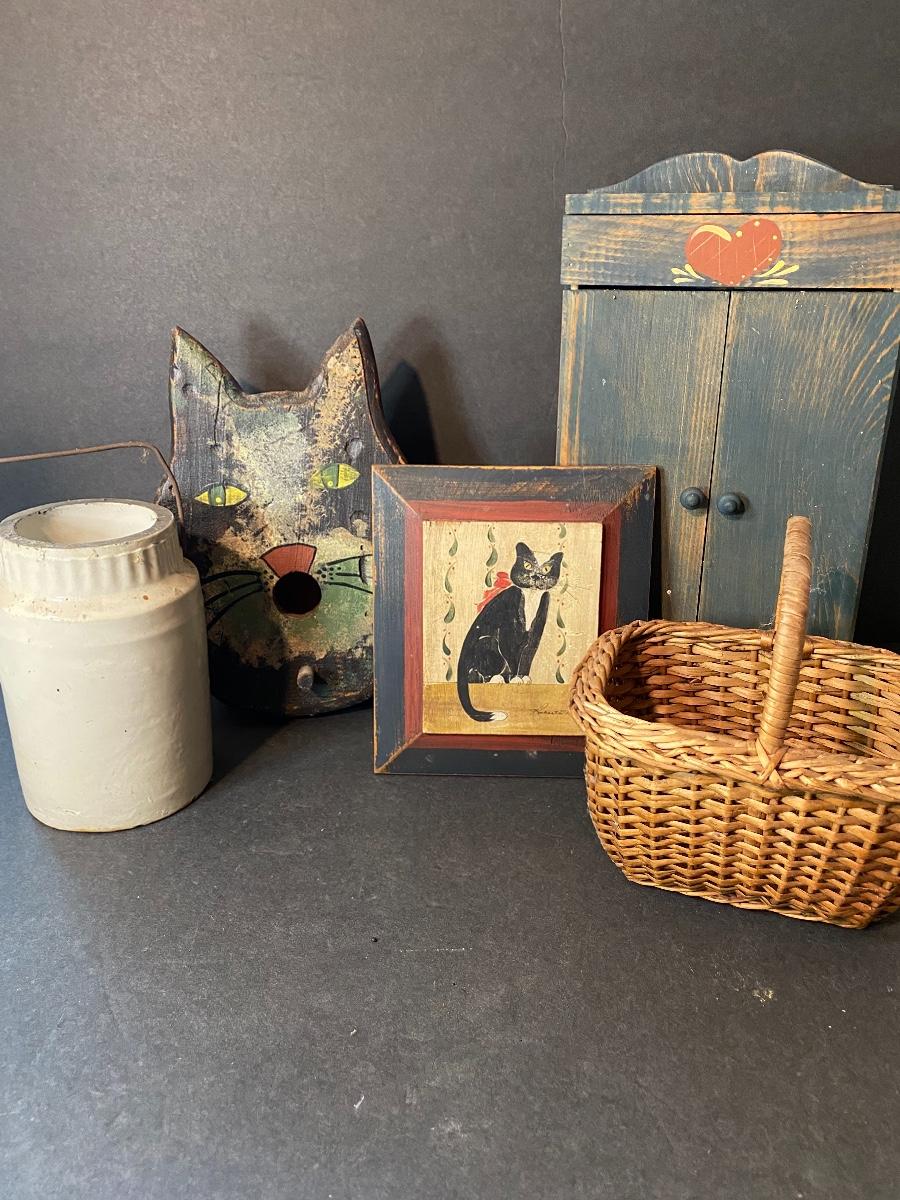 Lot 27: Primitive Decor: Cat Birdhouse, Crock, Painted Cabinet and More