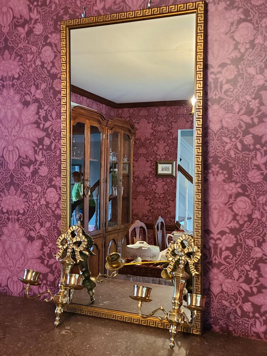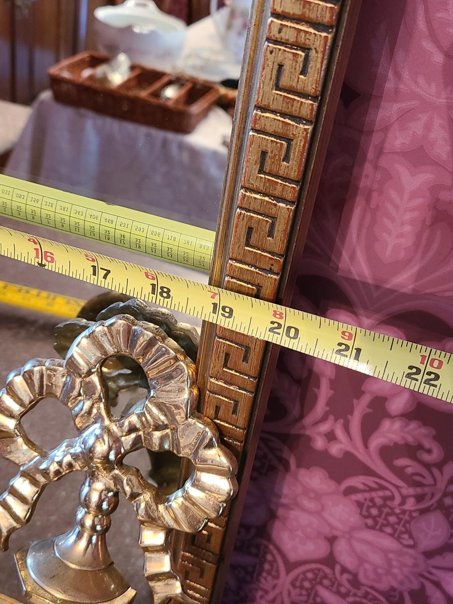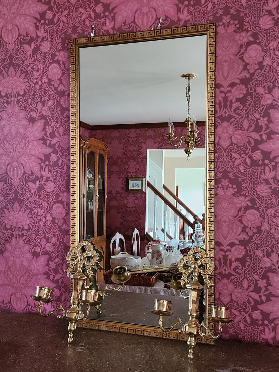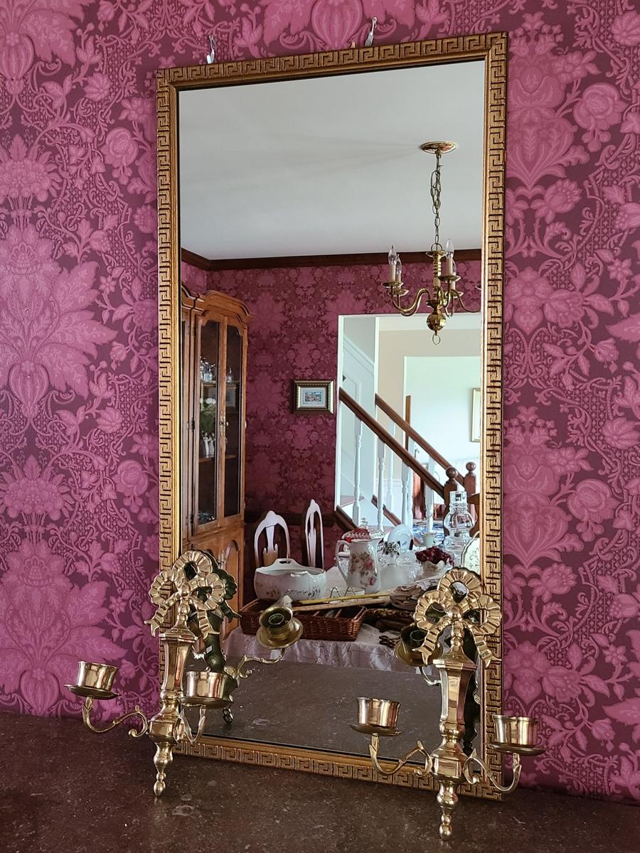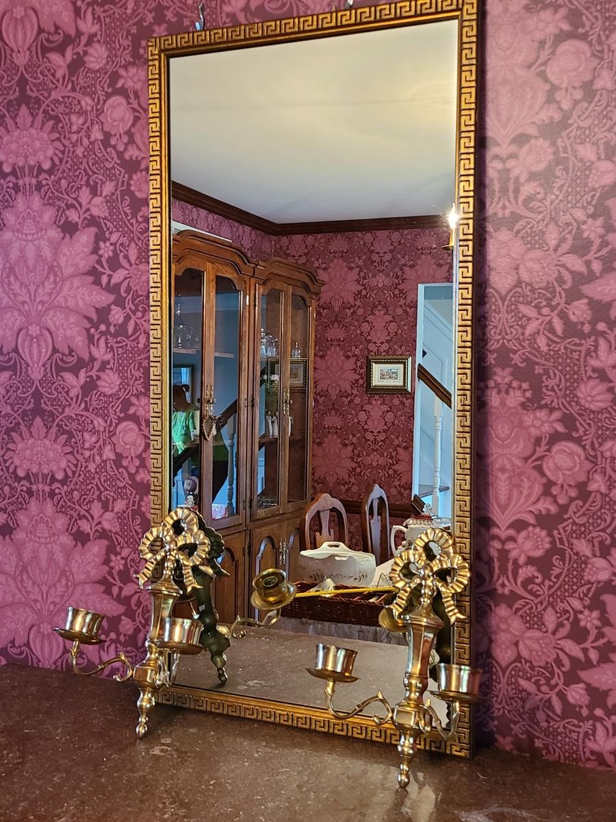 The mirror has a gorgeous wood carved frame and comes with two heavy brass sconces, but the inserts do not look to be brass, but brass colored. Pics show. Please see all pictures as they are the best representation of the items in the lot, the condition of the lot, and will show measurements if taken. If purchasing furniture you must be able to move yourself with your own help, and truck. This is located on the first floor.