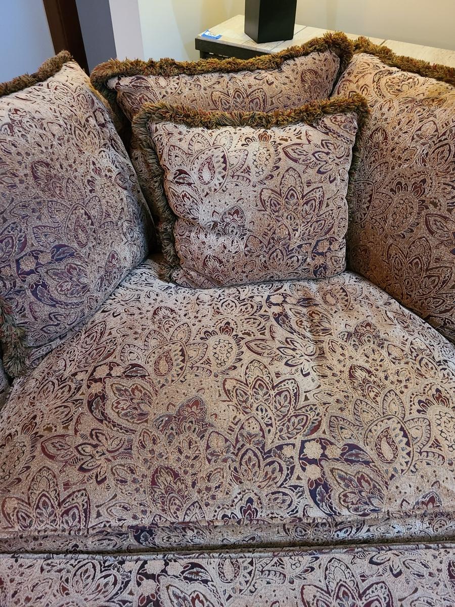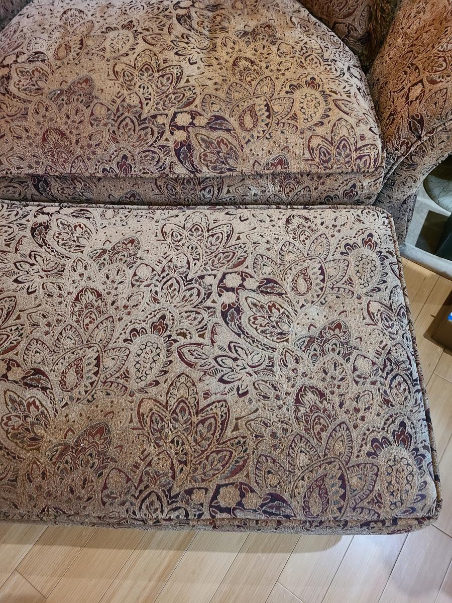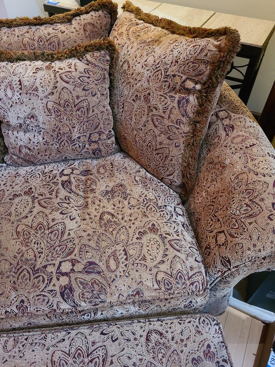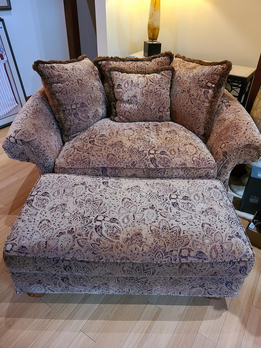 62x48x32 oversized comfy chair and matching ottoman. Browns with hints of red. The ottoman does show some wear as it is faded in spots due to home having large windows with direct sunlight. The beauty of the pattern is that the discoloration actually looks like shadows on the fabric in the lighting. Super comfortable set! Please see all pictures as they are the best representation of the items. The pictures show condition, measurements if taken, and what is included in the lot. Due to the large amount that we photograph and the time frame, we are not always able to take measurements. All items unless noted, are pre-owned and have been used. If you purchased furniture, you must bring help. We do not allow one person to carry large furniture out on their own. Bring help, tools and a truck for the safety of our clients homes, and your personal safety. Company policy. Thank you.