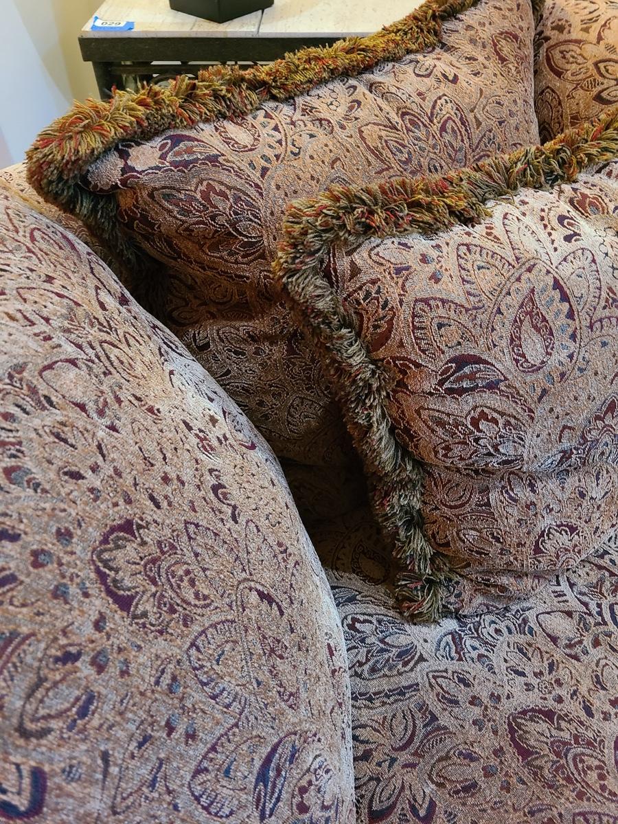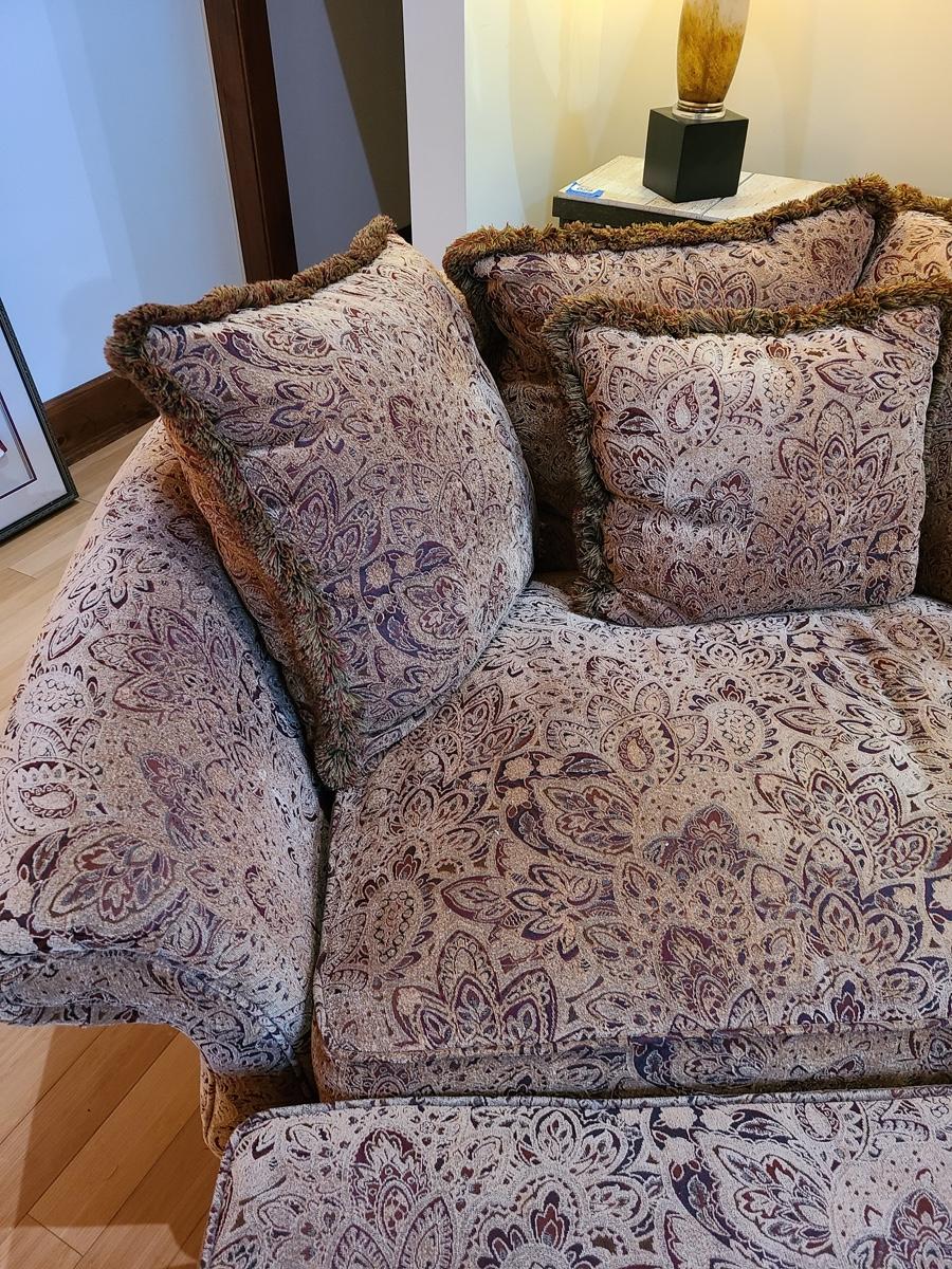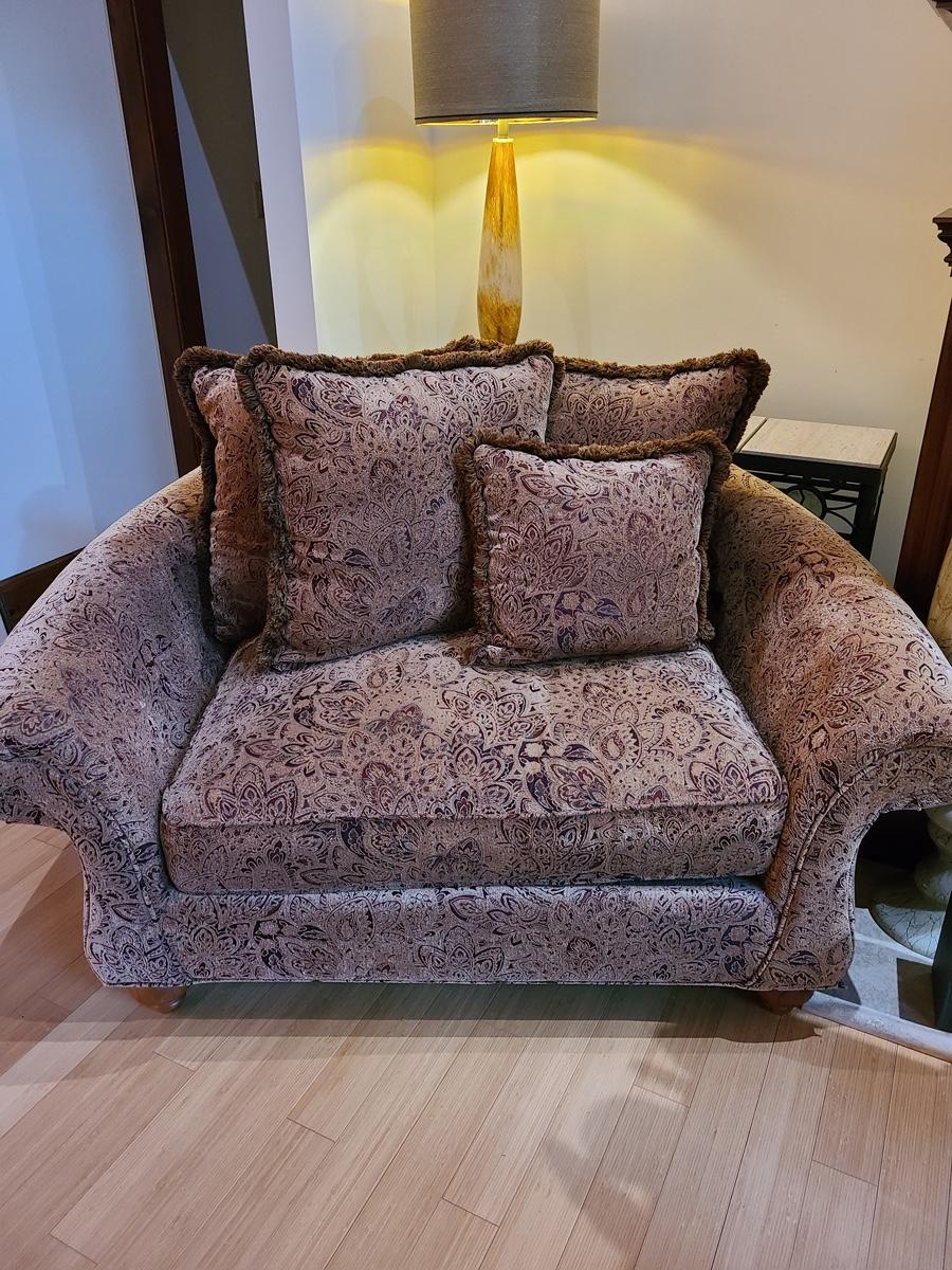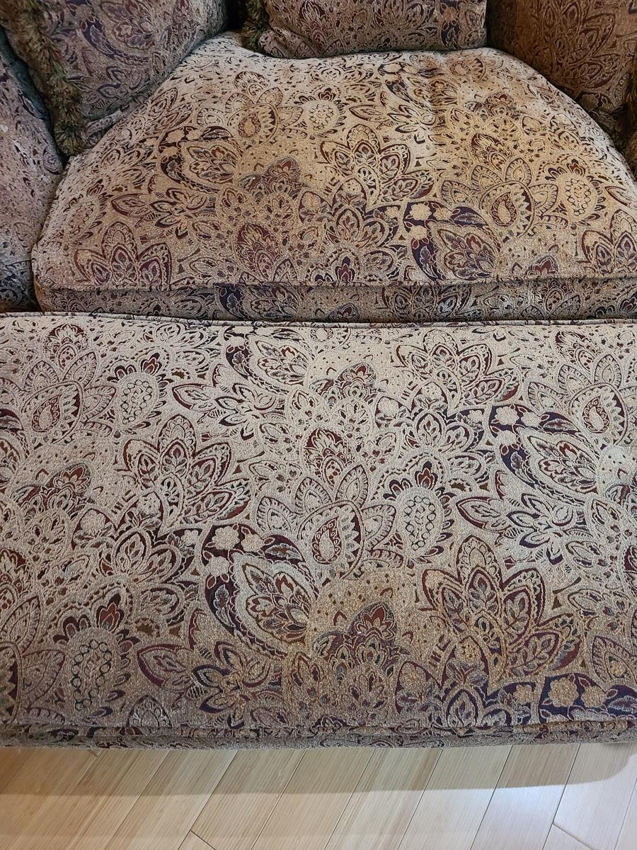 62x48x32 oversized comfy chair and matching ottoman. Browns with hints of red. The ottoman does show some wear as it is faded in spots due to home having large windows with direct sunlight. The beauty of the pattern is that the discoloration actually looks like shadows on the fabric in the lighting. Super comfortable set! Please see all pictures as they are the best representation of the items. The pictures show condition, measurements if taken, and what is included in the lot. Due to the large amount that we photograph and the time frame, we are not always able to take measurements. All items unless noted, are pre-owned and have been used. If you purchased furniture, you must bring help. We do not allow one person to carry large furniture out on their own. Bring help, tools and a truck for the safety of our clients homes, and your personal safety. Company policy. Thank you.