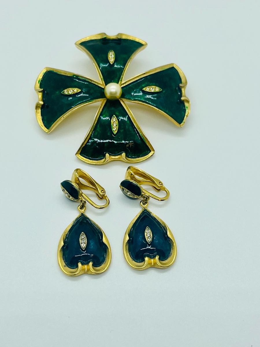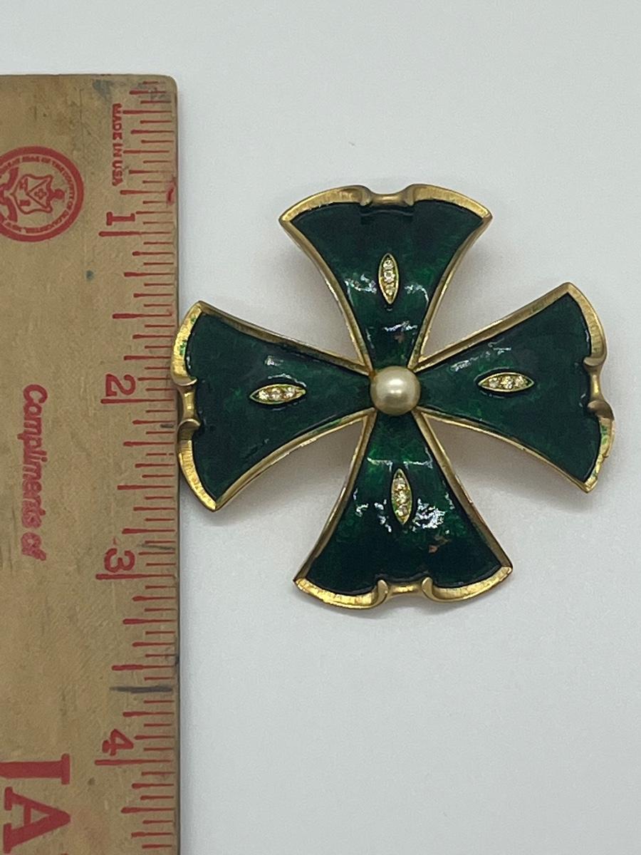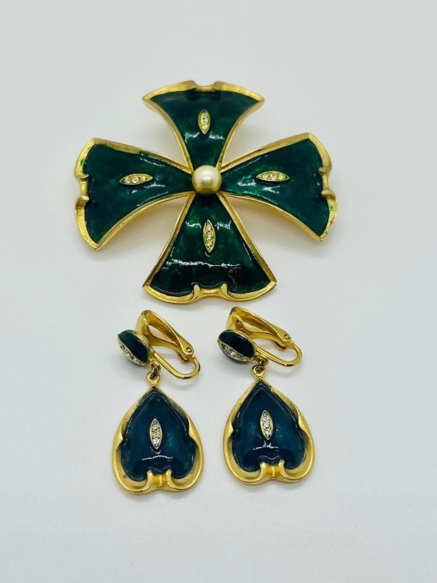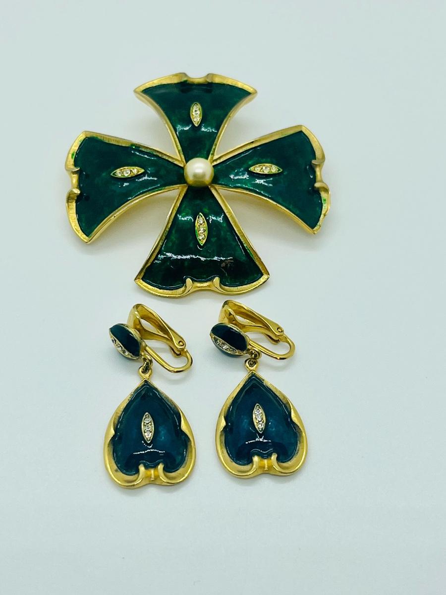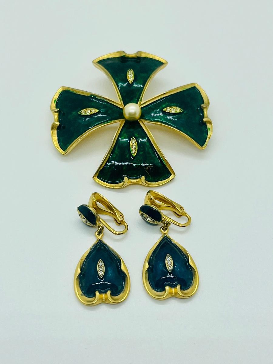 Lot 27: Vintage Marvella Green Enamel Maltese Cross & Rhinestone Brooch w/ Clip-on Earrings