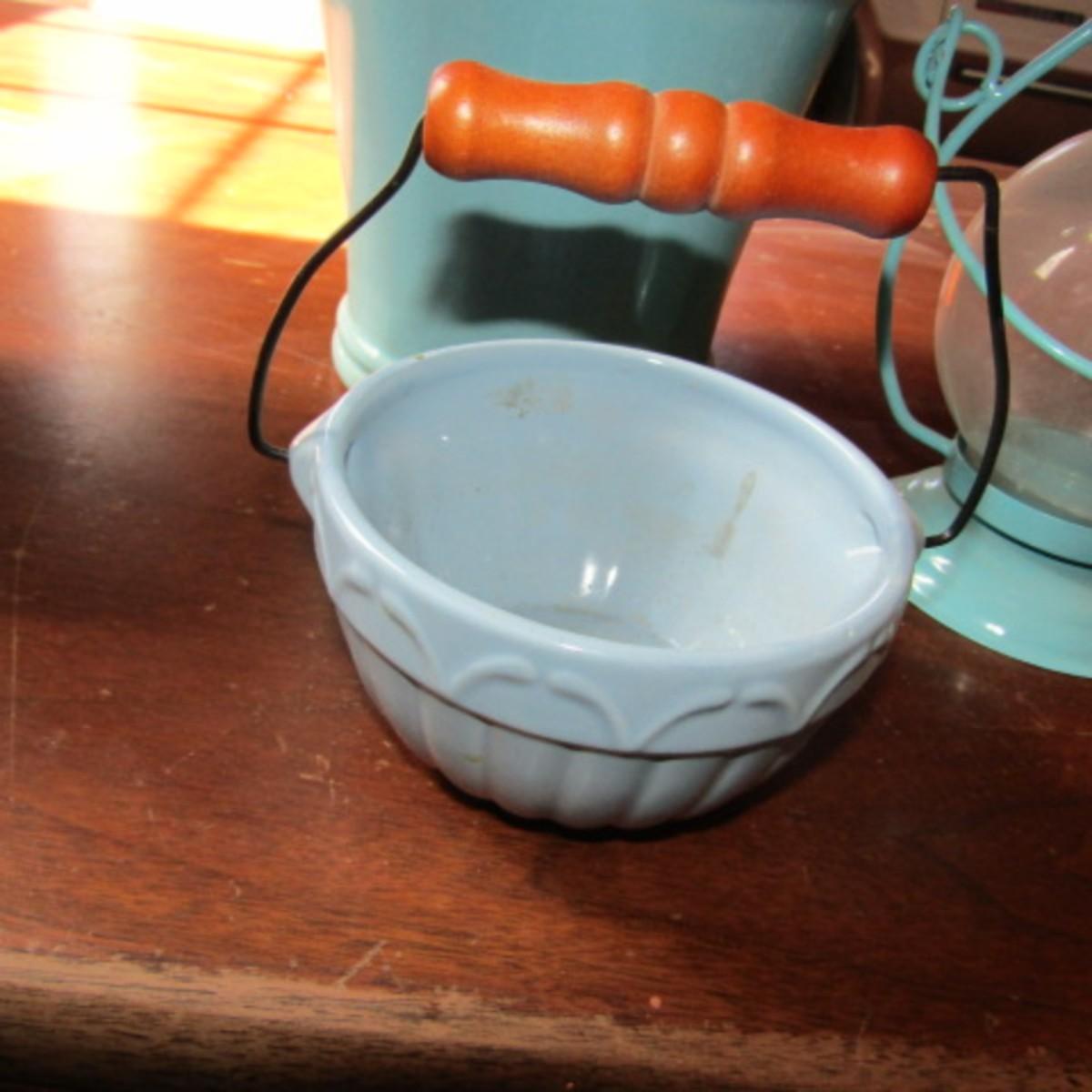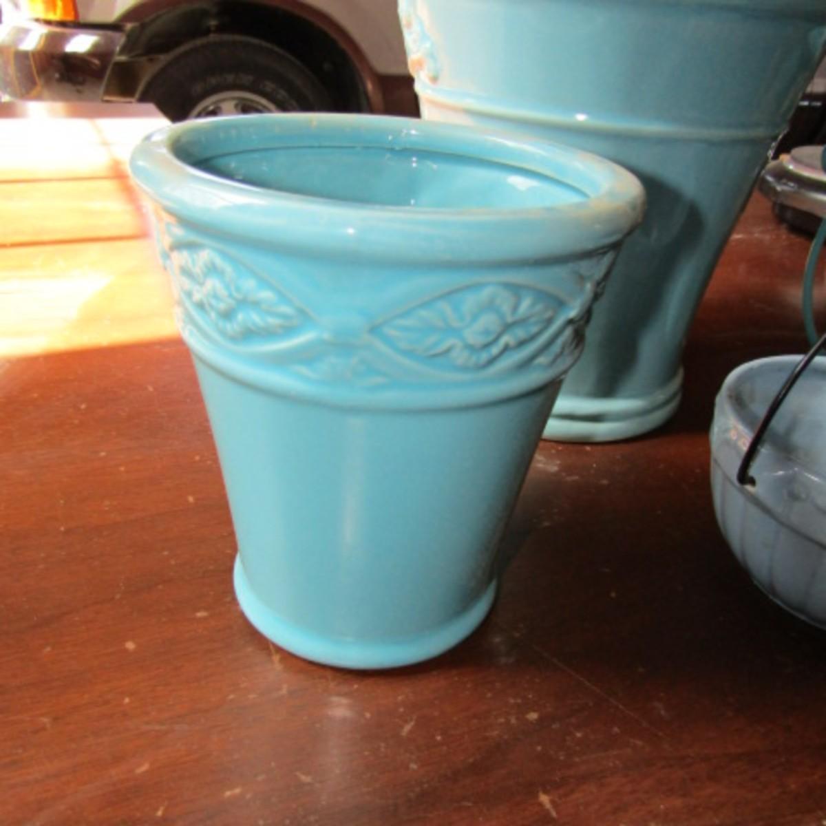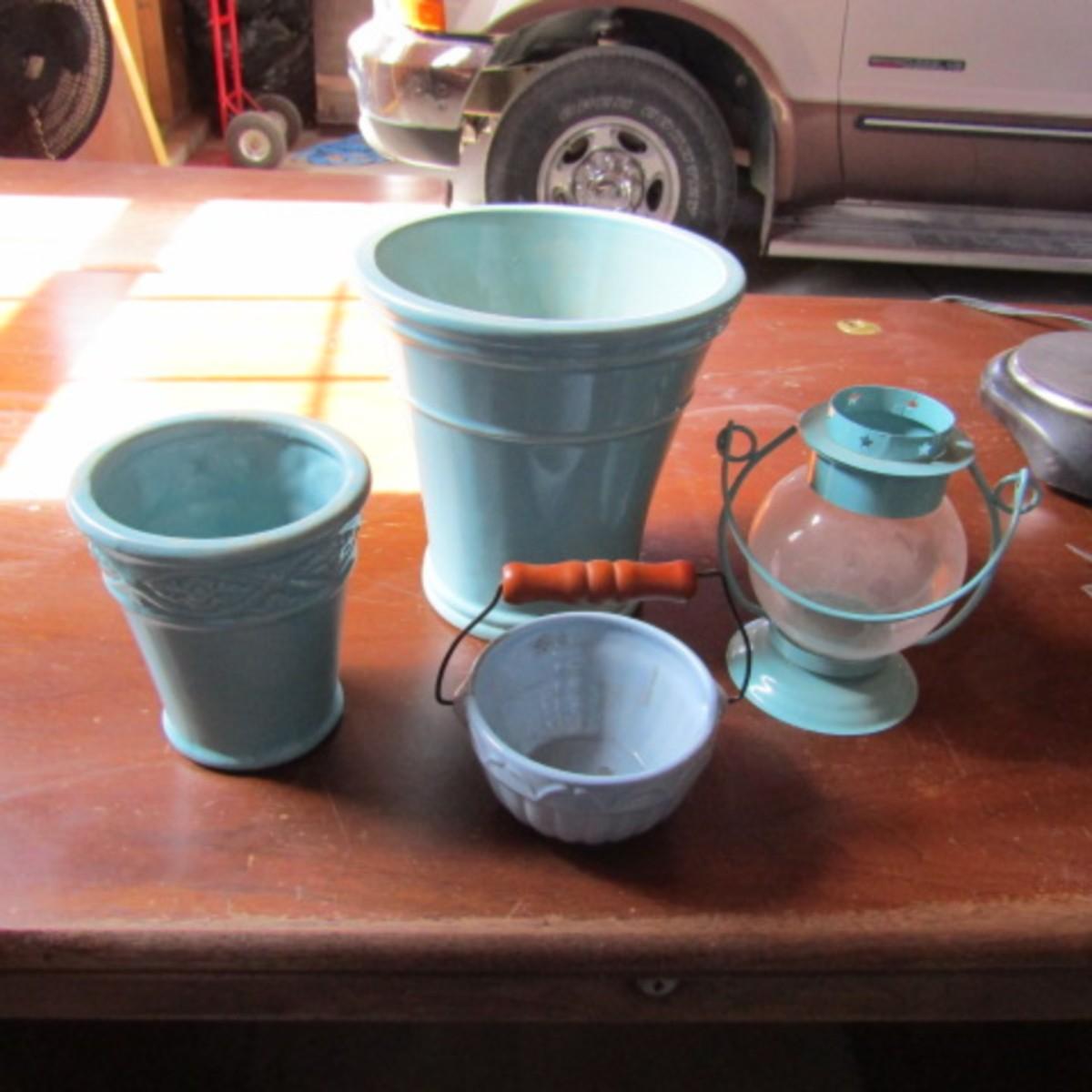 CERAMIC FLOWER POTS THE LARGEST IS 9" TALL, CANDLE LANTERN AND BOWL WITH HANDLE