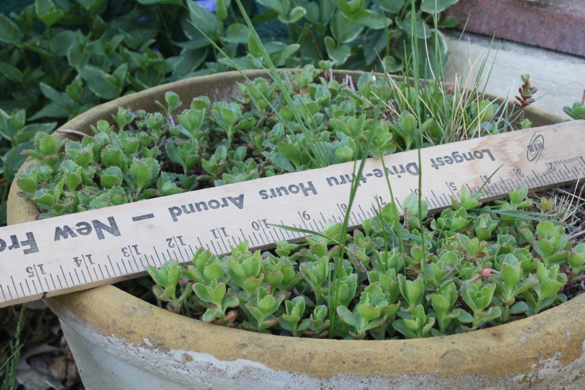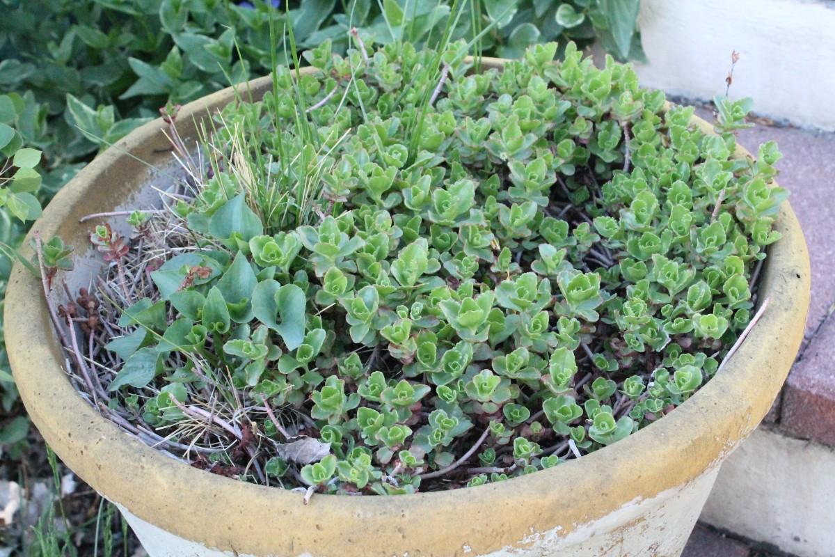 This outdoor garden flower pot made from plaster composition and containing an existing plant.