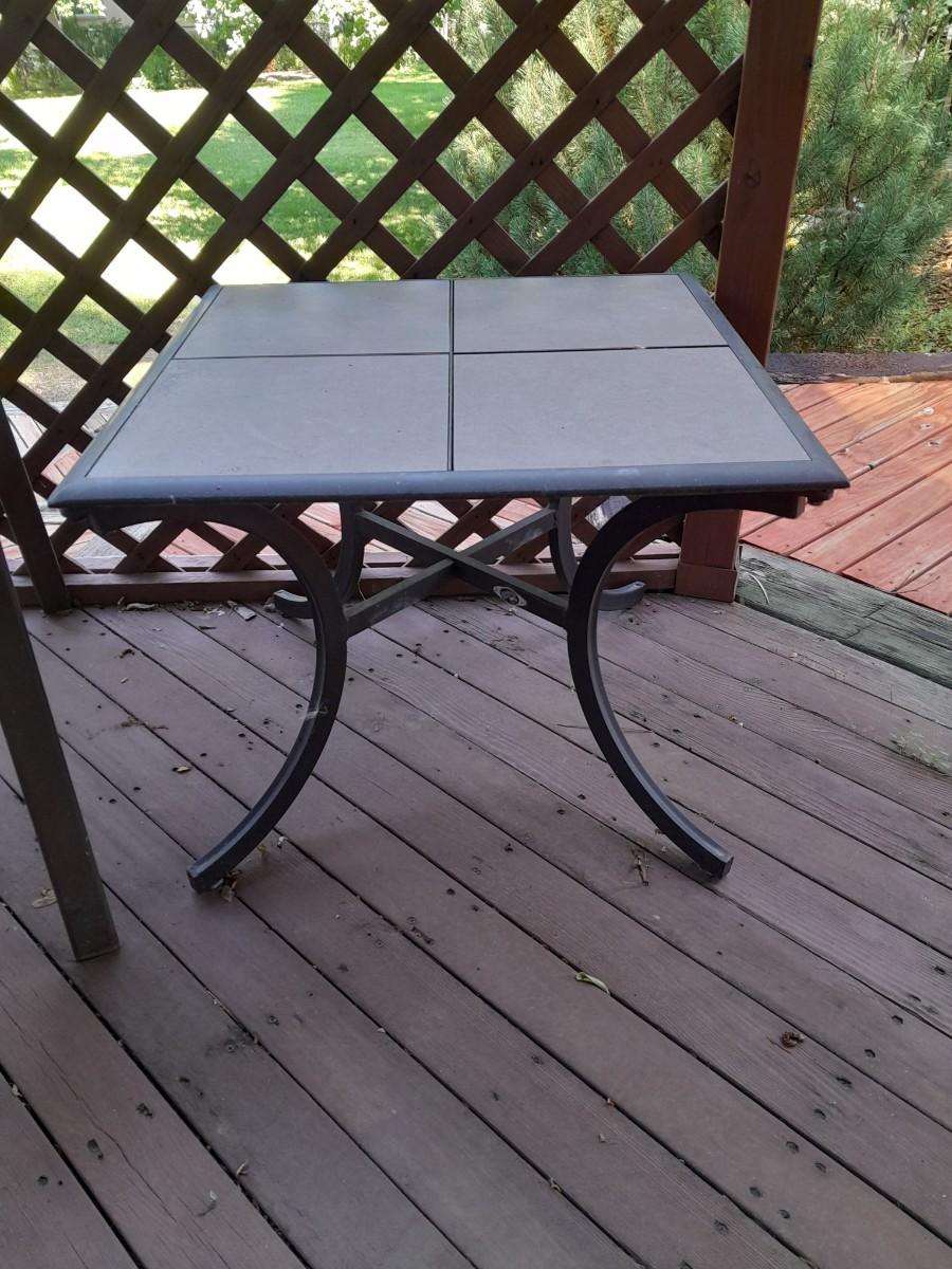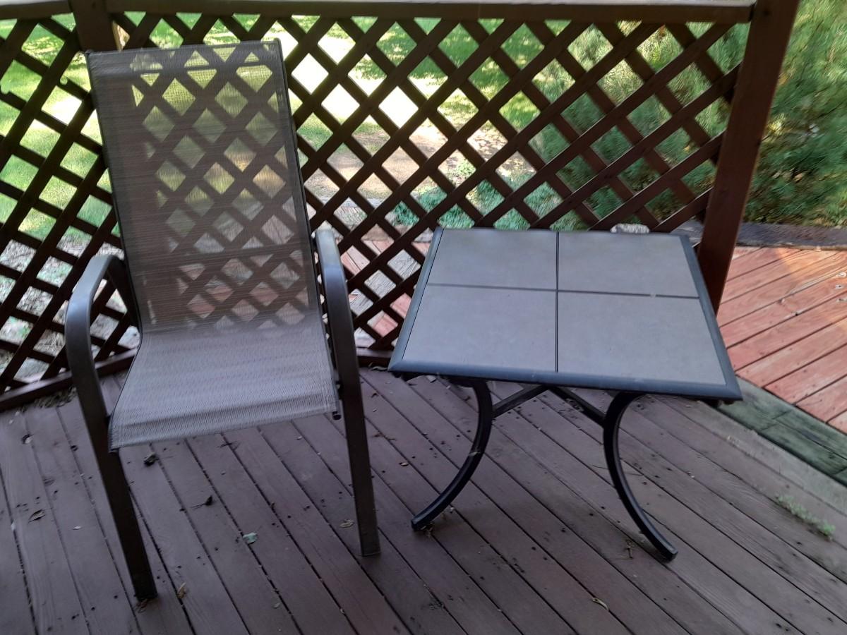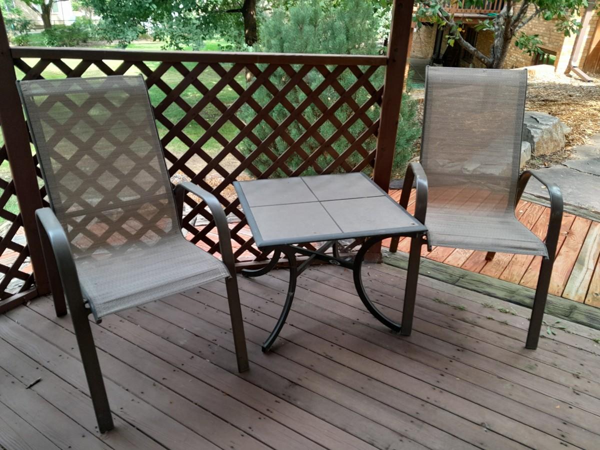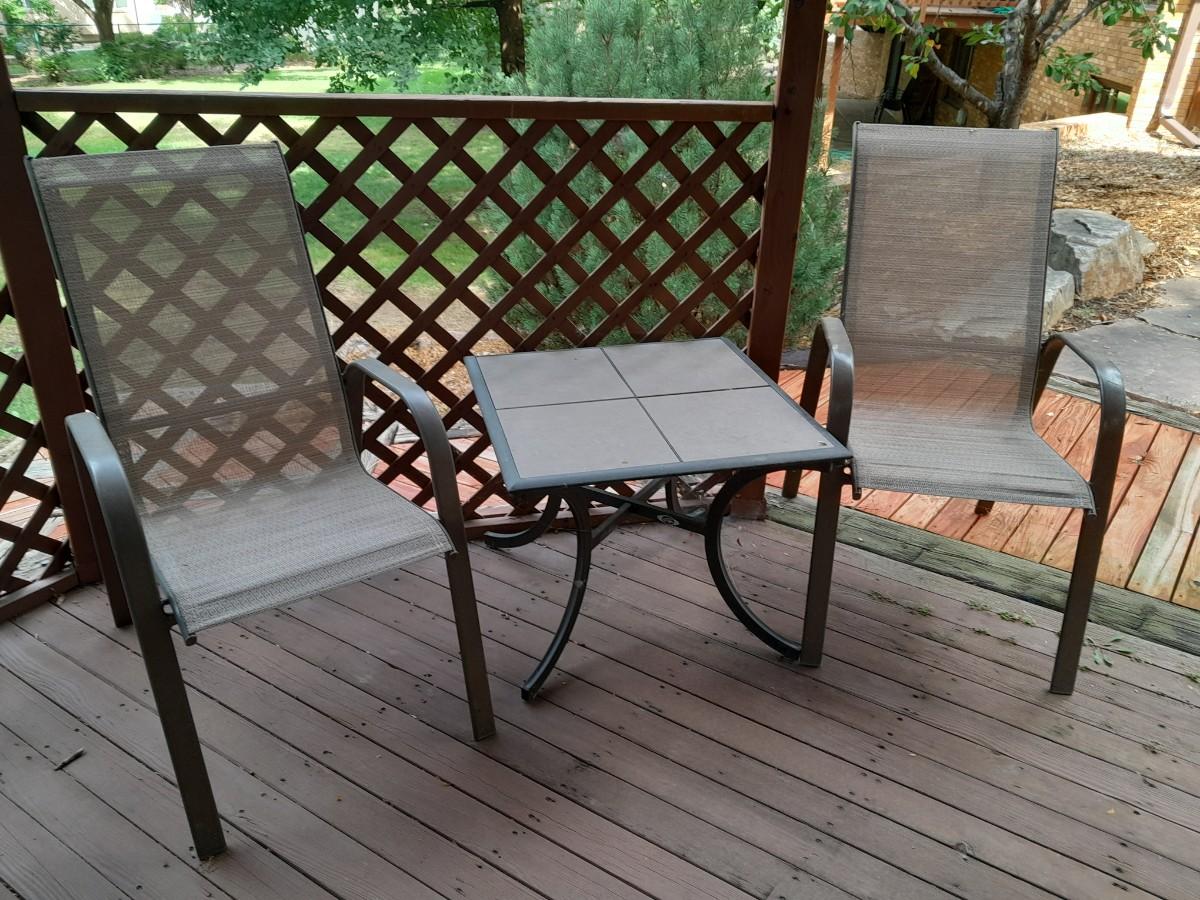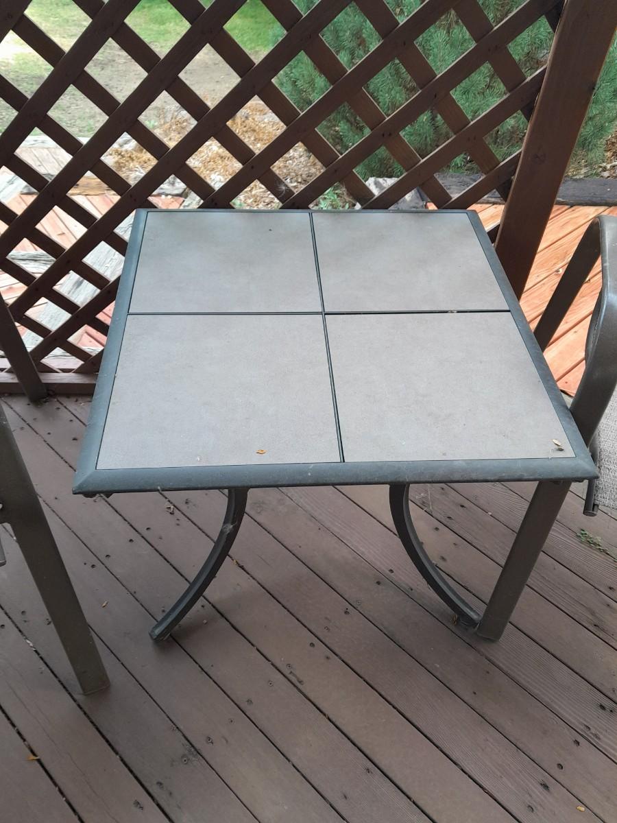 TWO PATIO CHAIRS AND A TILE TOP TABLE