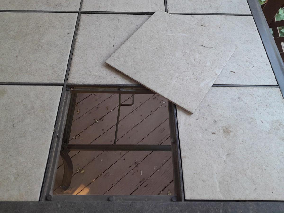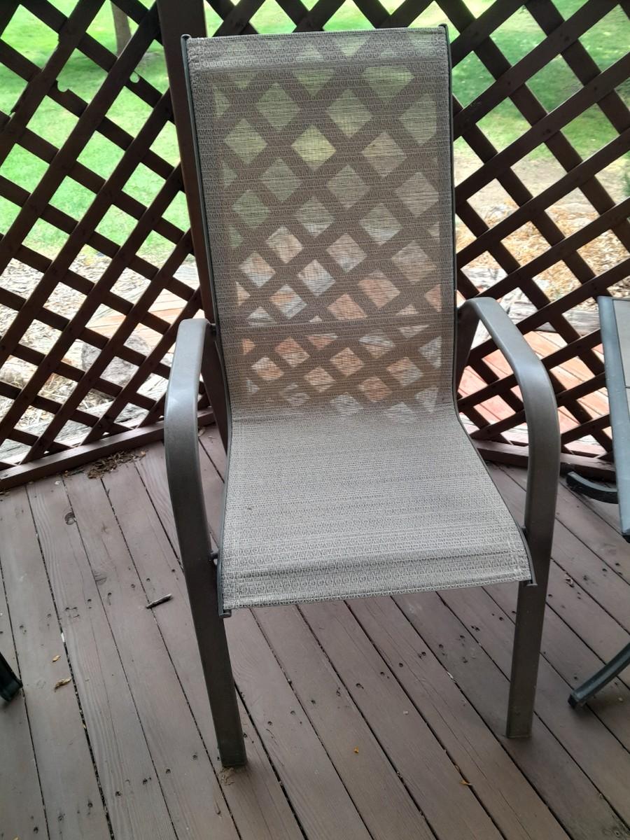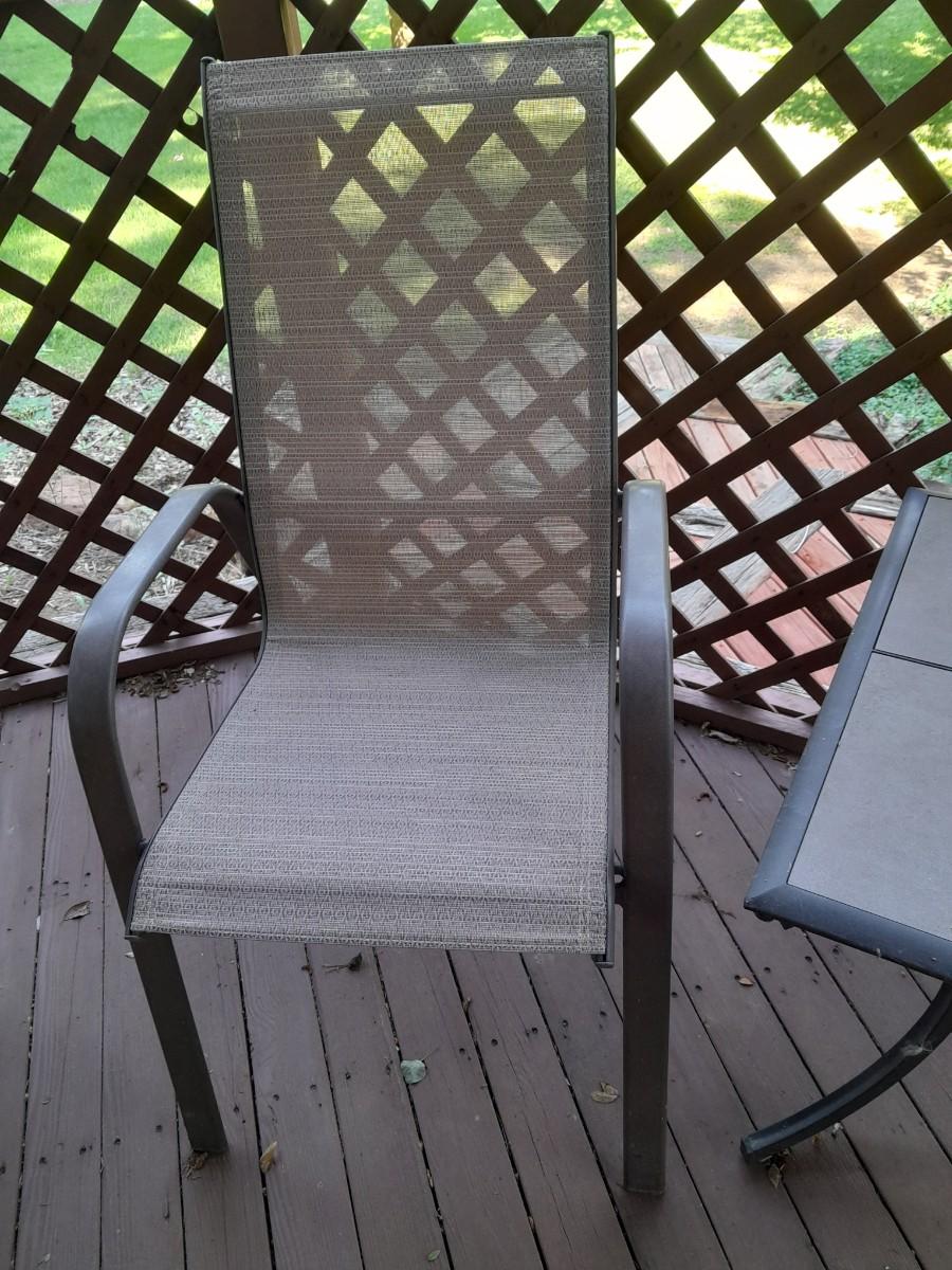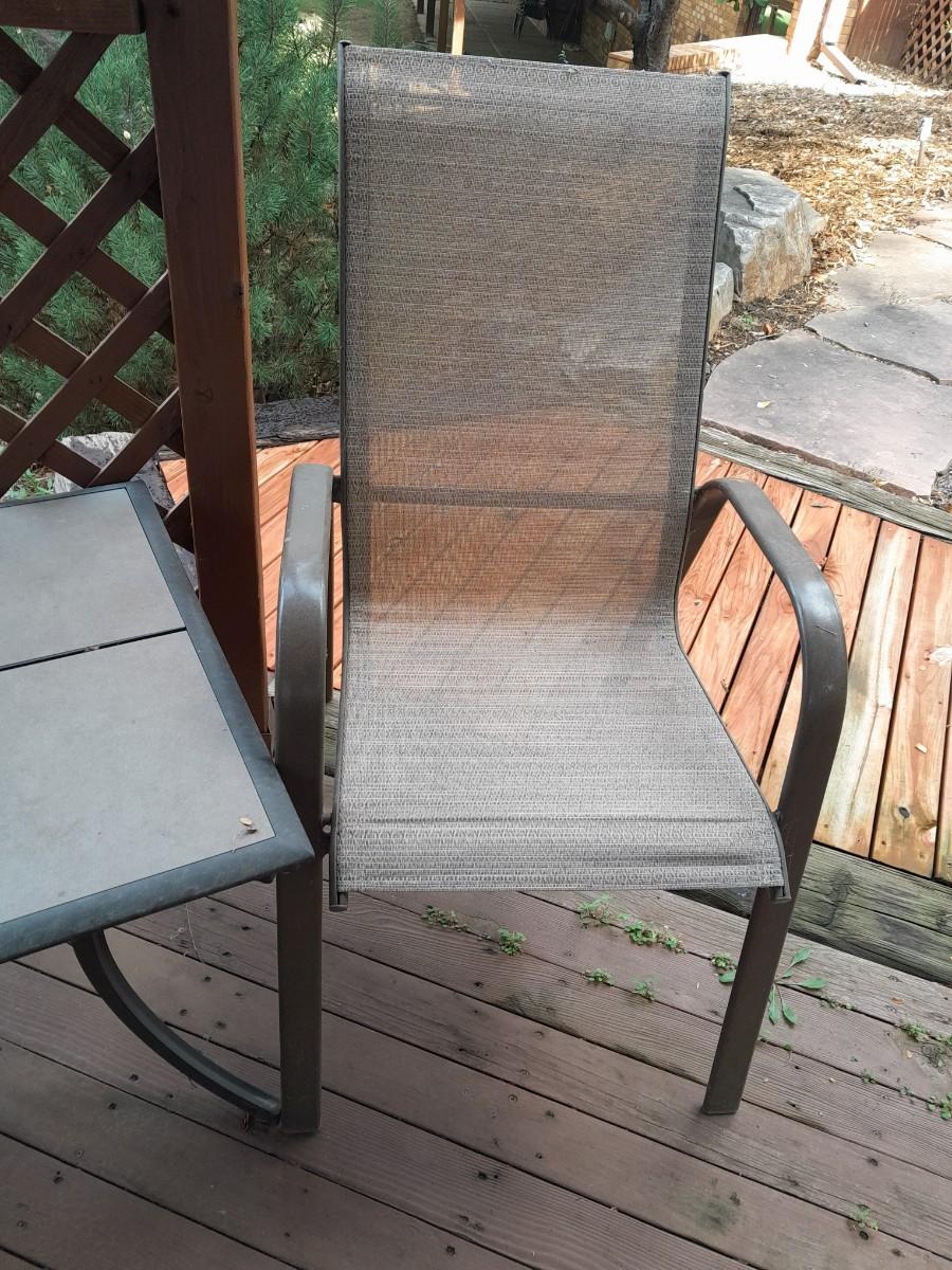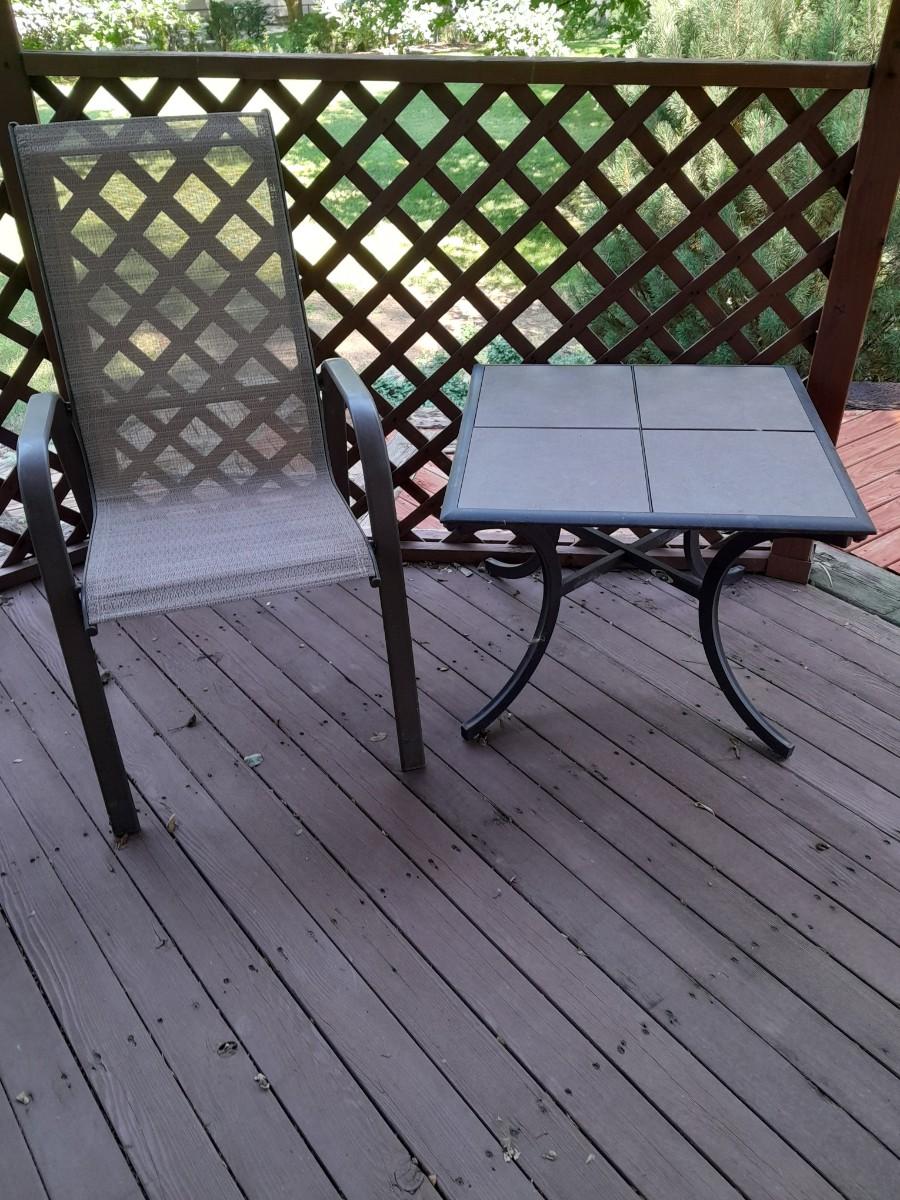 TWO PATIO CHAIRS AND A TILE TOP TABLE